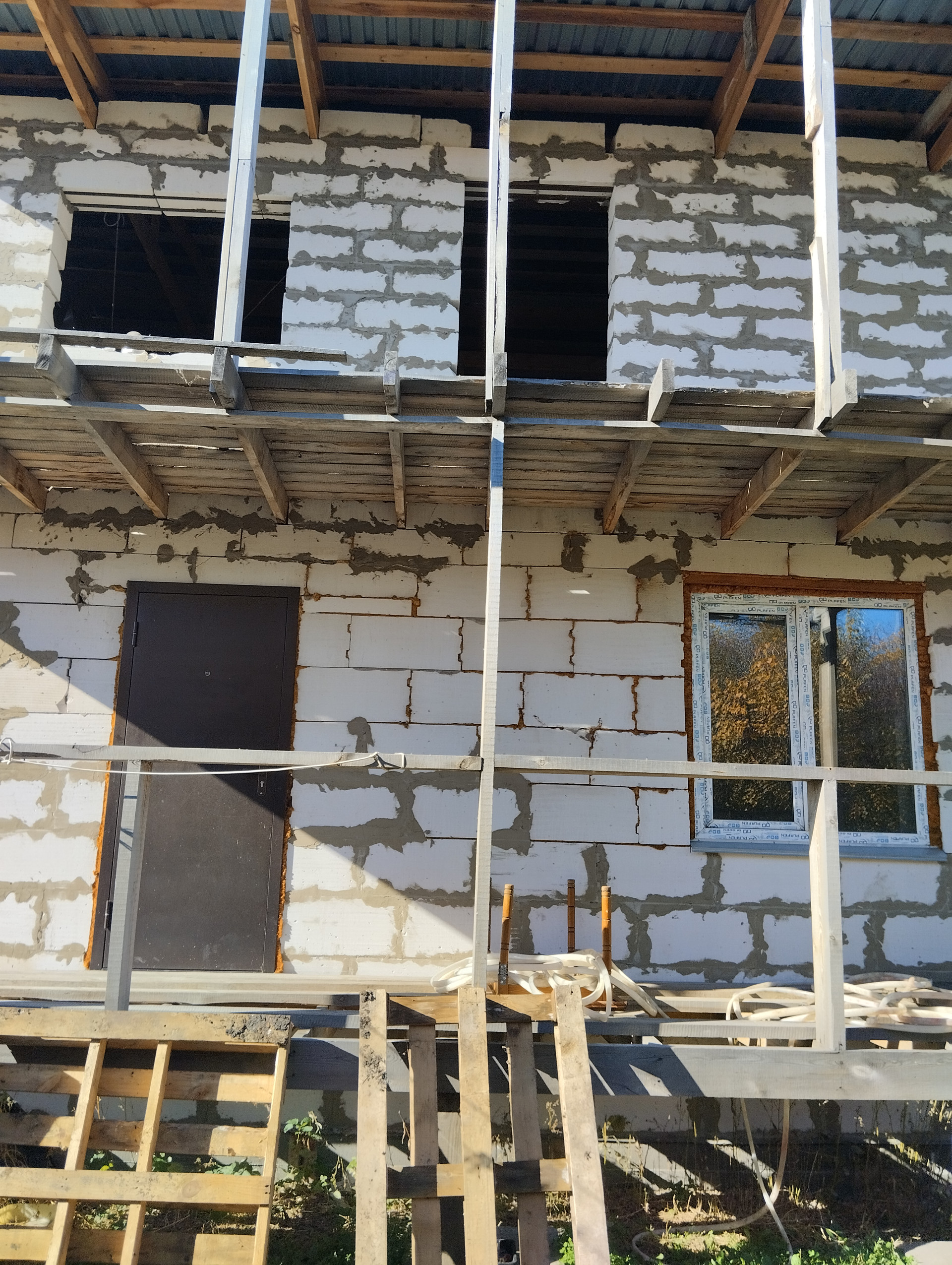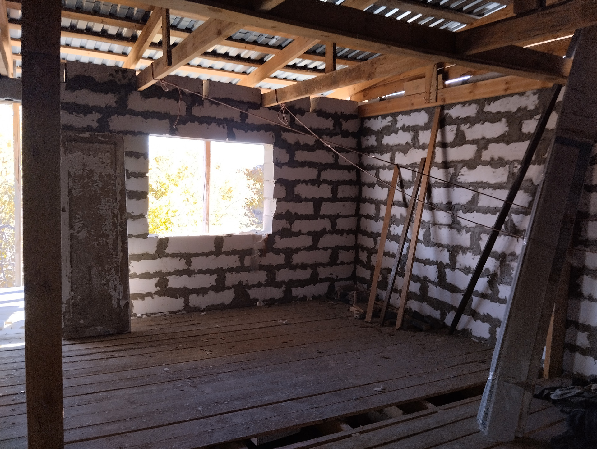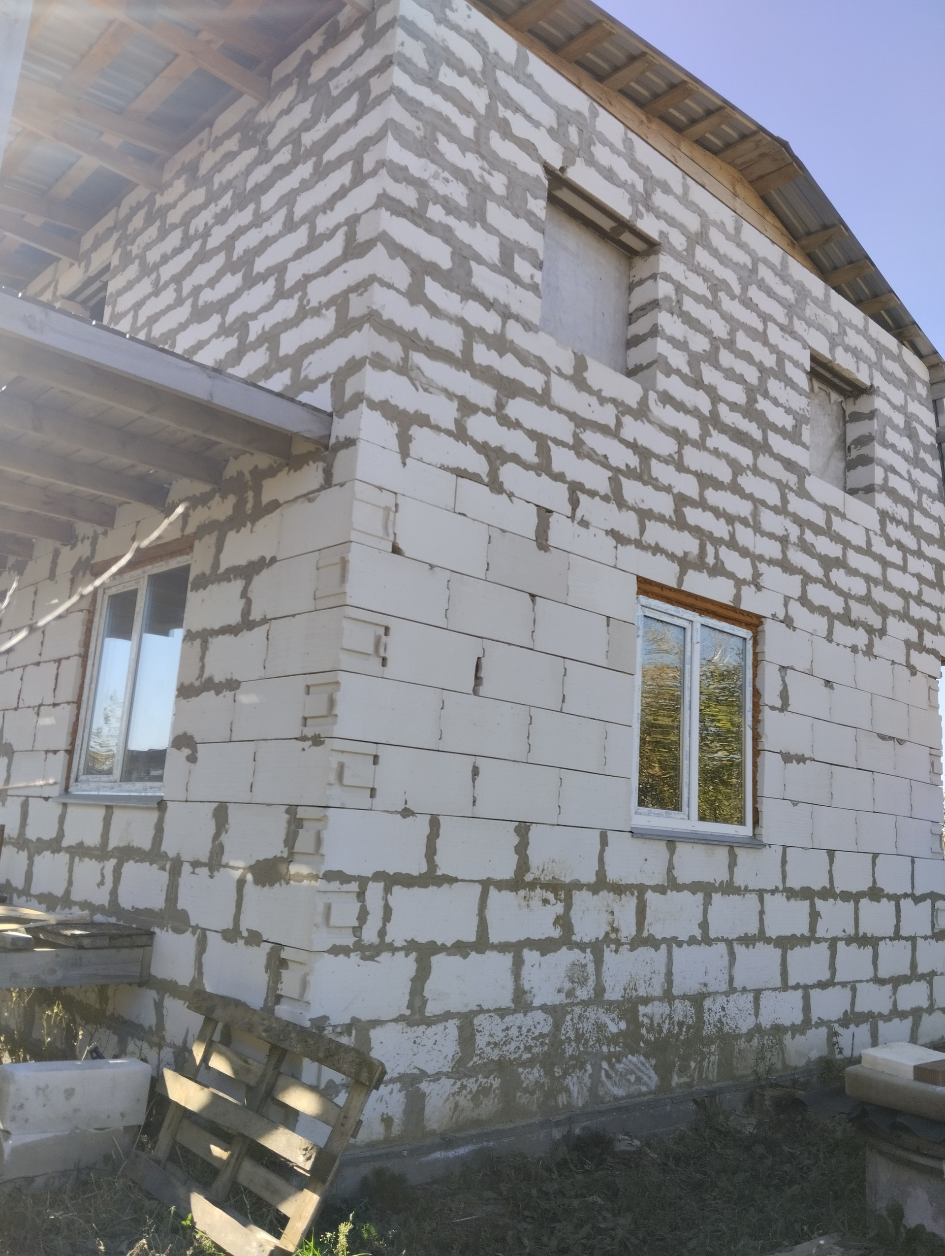 1. Объект незавершенного строительства, из газоблока, два этажа по 50 кв.м., частично окна, крыша есть, два входа.