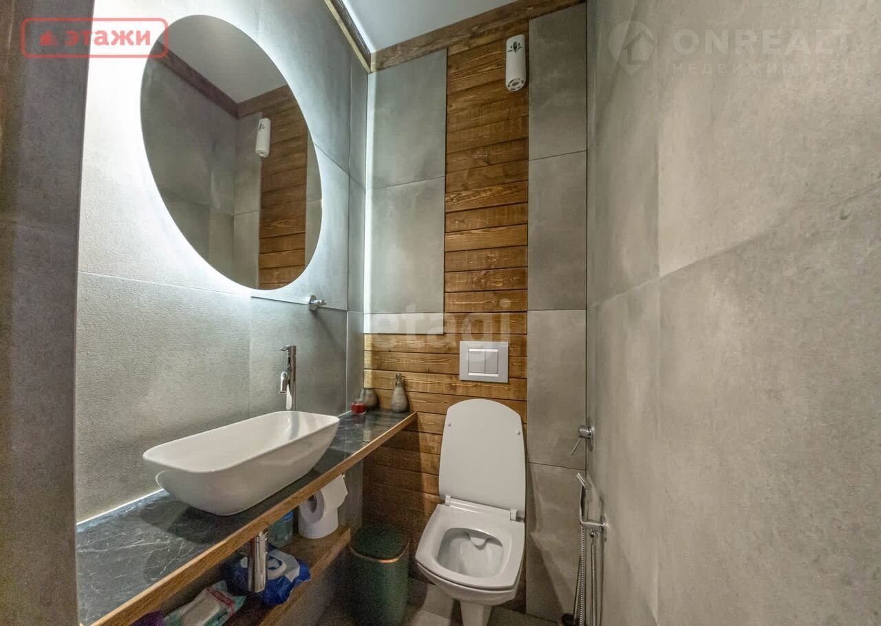 - Из гостиной мы попадаем в ванную комнату, где за стеклянной перегородкой расположен хамам. Тумба из керамогранита под 2 накладные раковины. Скрытые системы хранения за зеркалами. Облицовка керамогранит. Панорамное окно с видом на придомовую территорию.
