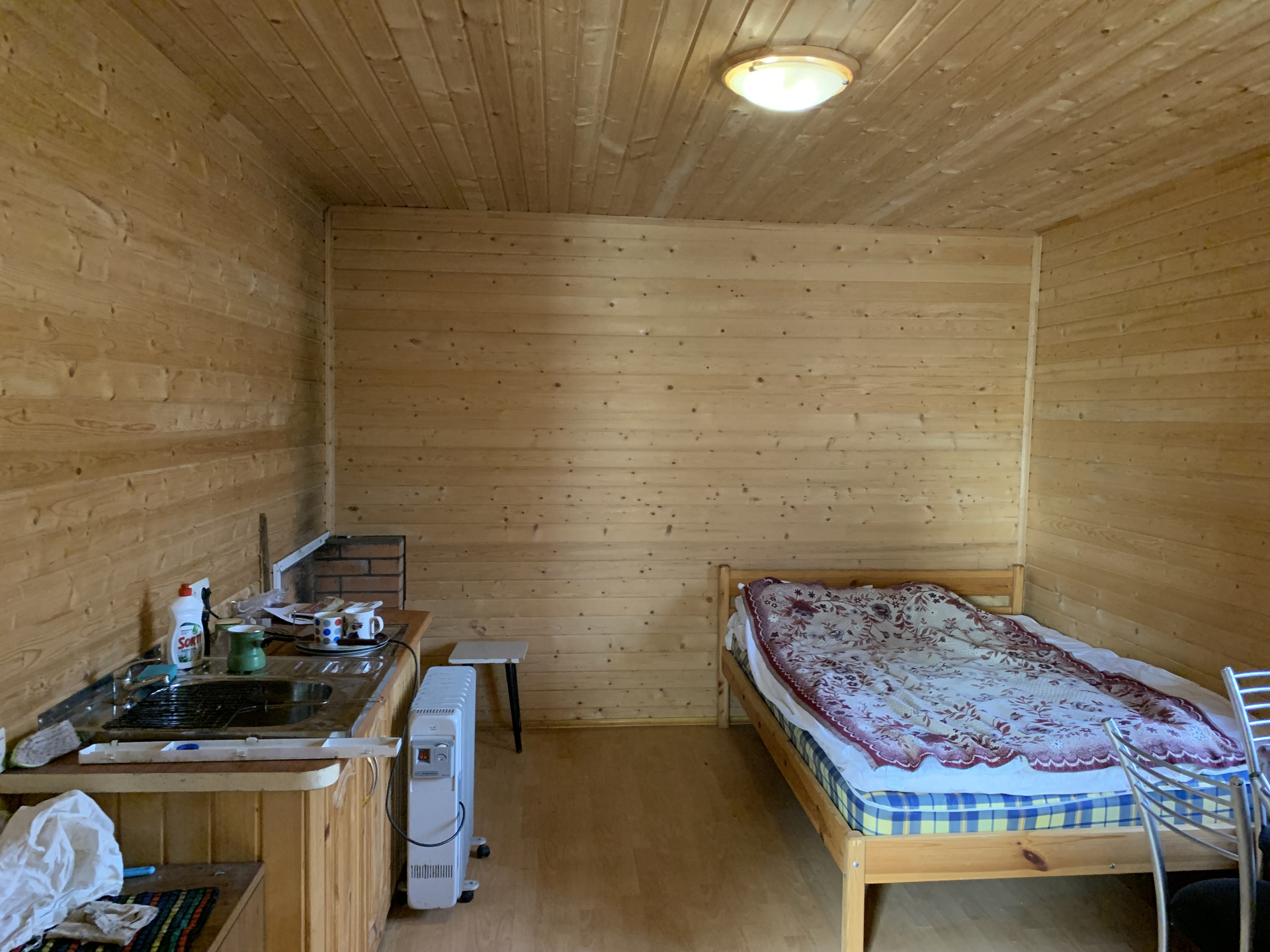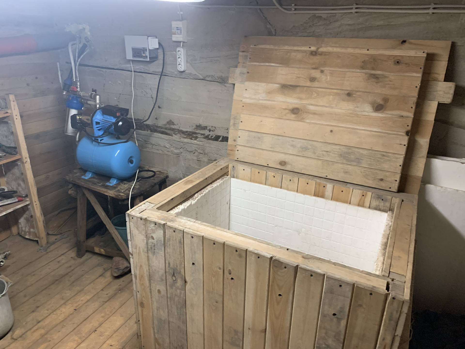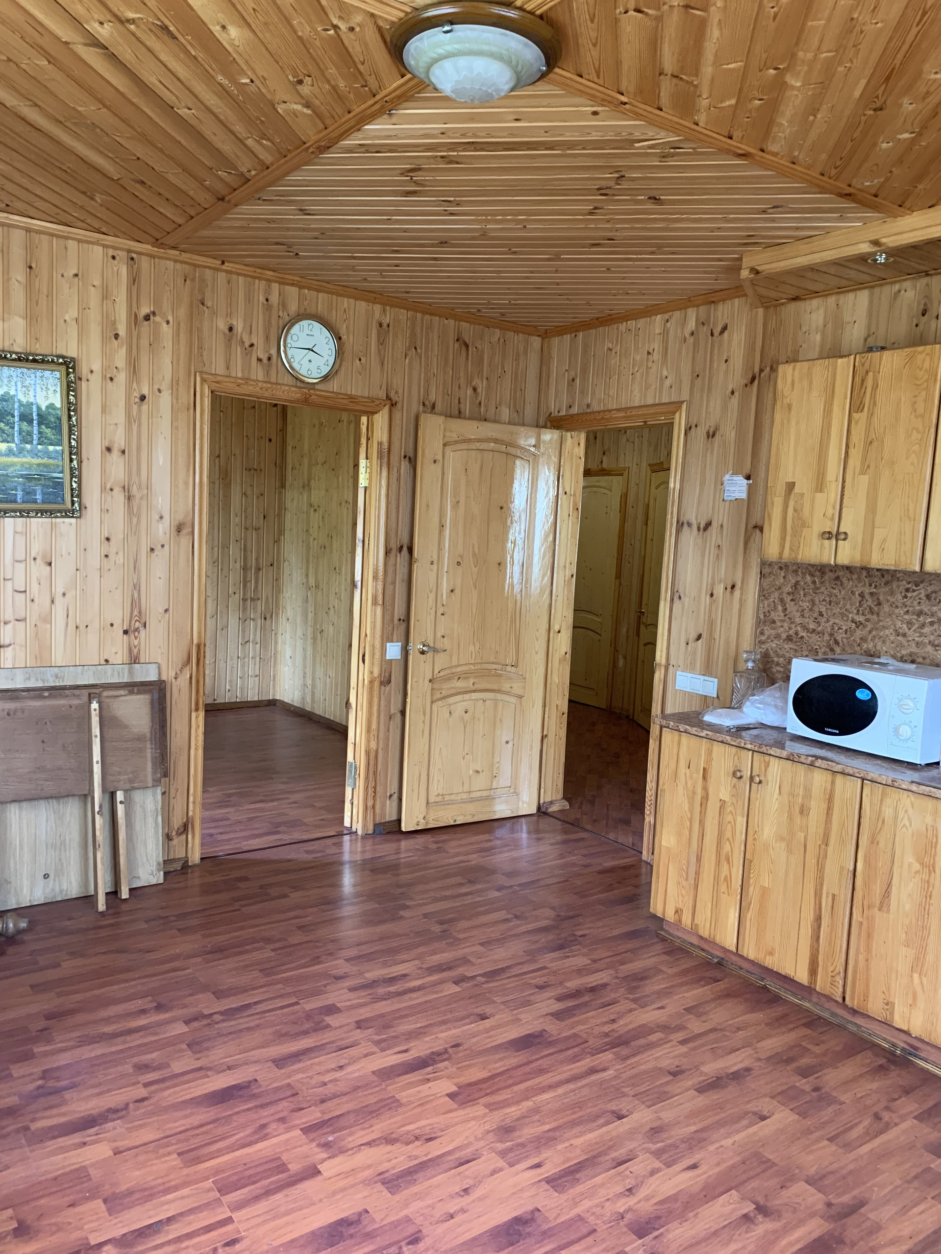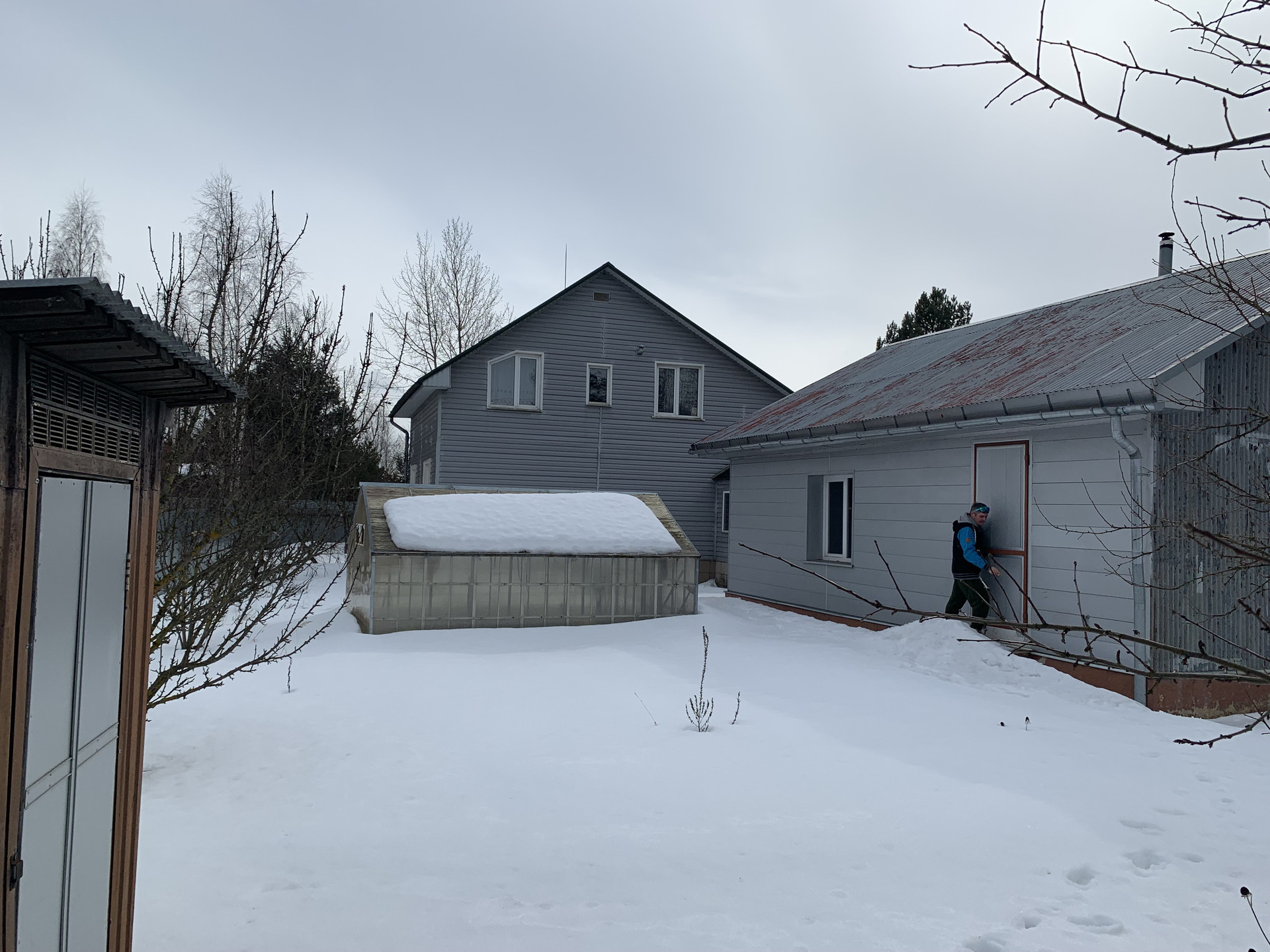 Дом: 1 этаж мастерская, вход в подвал, в подвале камера для хранения овощей, кладовая, санузел, кухня- гостинная, 2 спальни.
