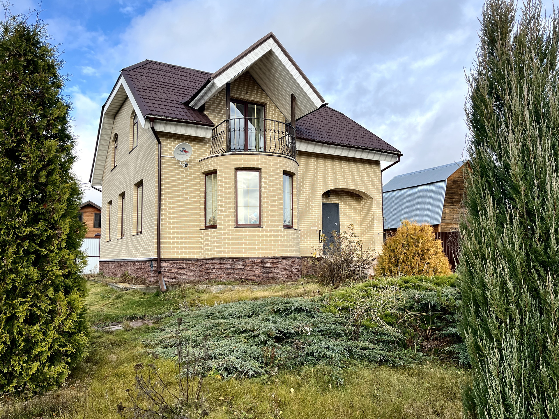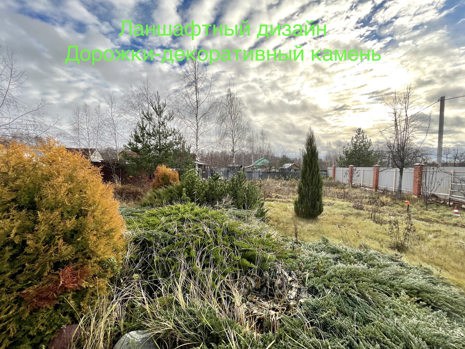 - На участке выполнен ландшафтный дизайн, посажены туи, канадские ели.