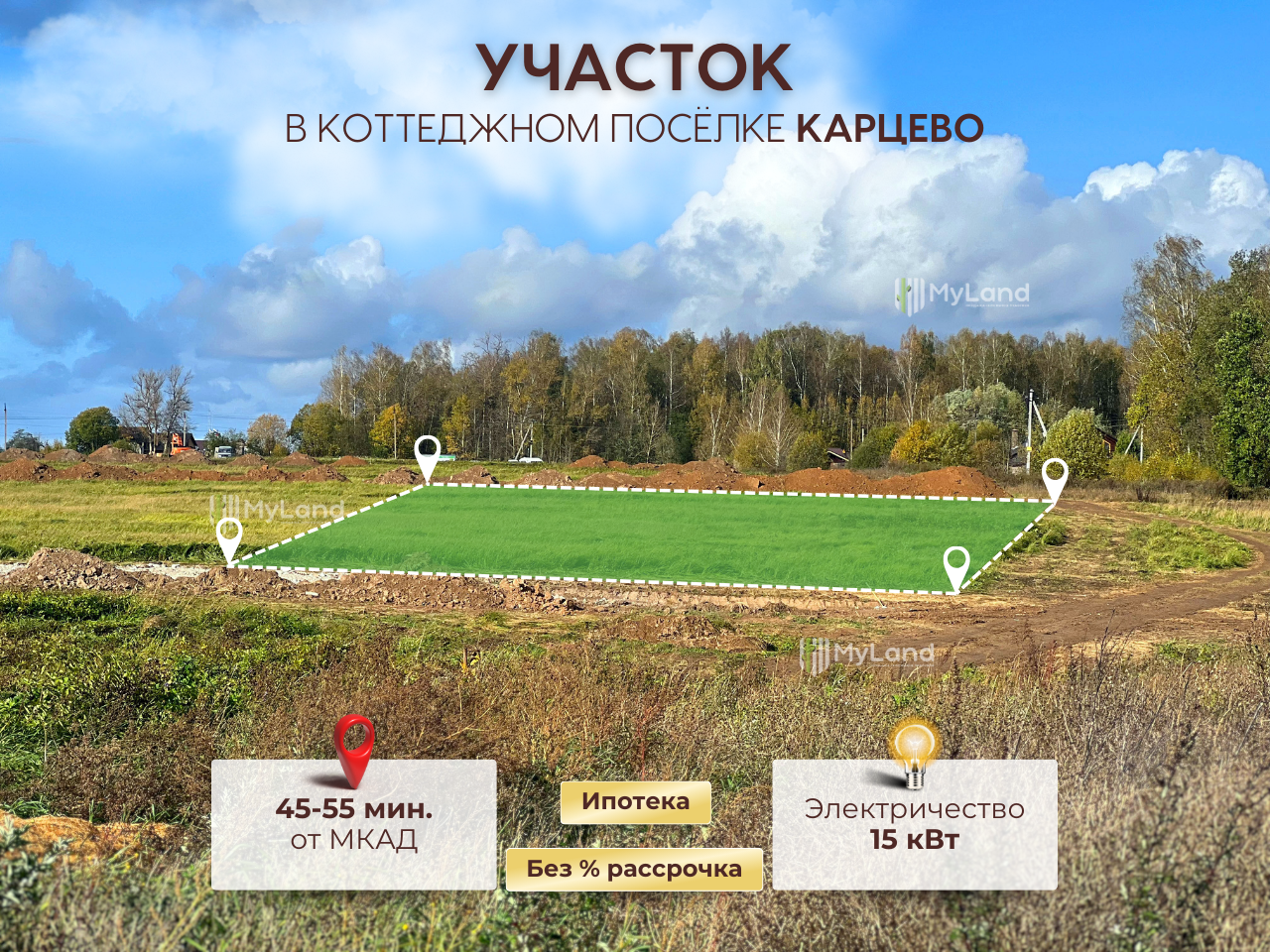 Участок расположен всего в 5 минутах от великолепного Истринского водохранилища. В окрестностях находится известный конный клуб «Карцево».