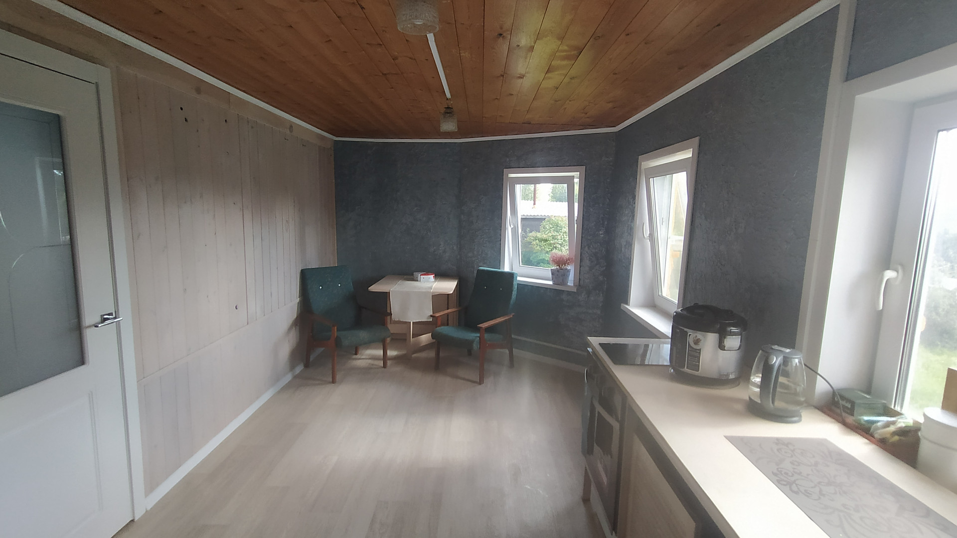 Просторная кухня с панорамным видом на участок.