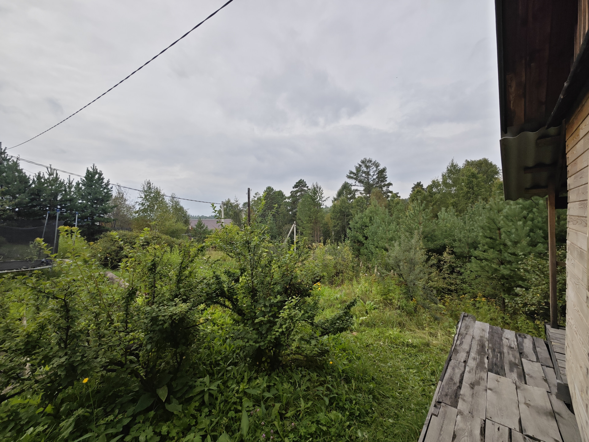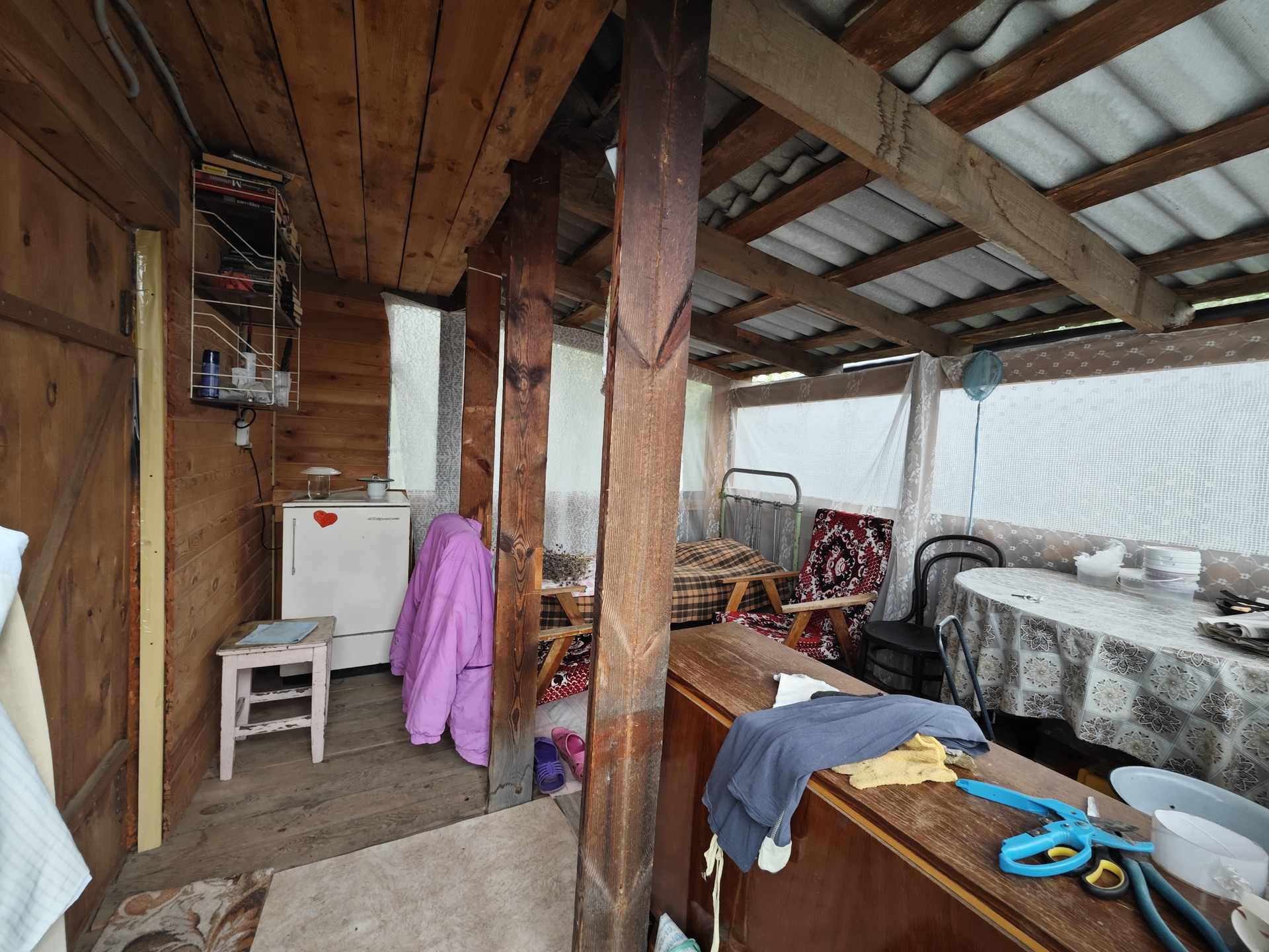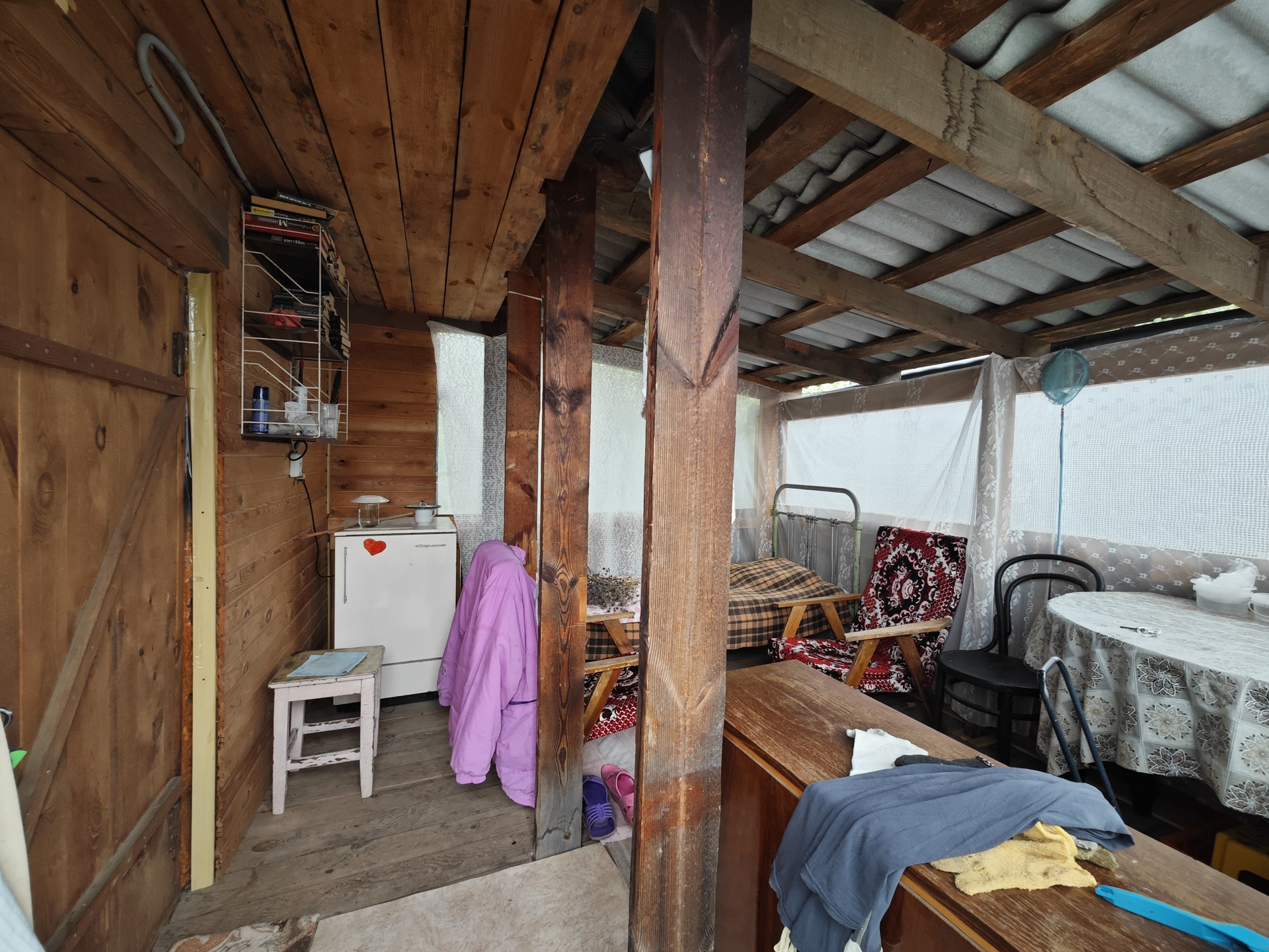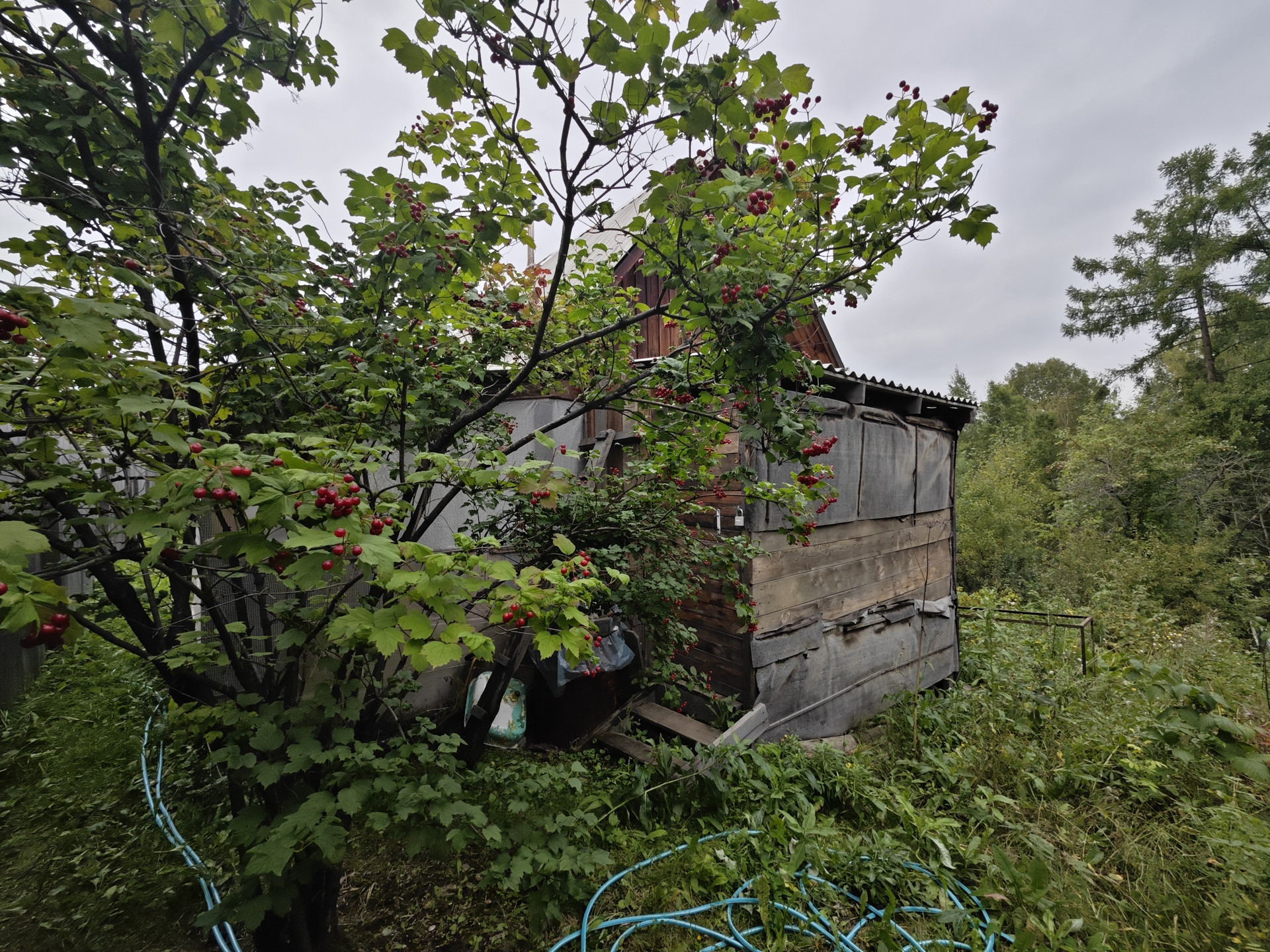 На участке имеется небольшой дом 12 м2 из кругляка, к нему пристроена кладовая. В доме две веранды - открытая и закрытая. Есть различные плодово-ягодные насаждения, через дорогу живописный лес.