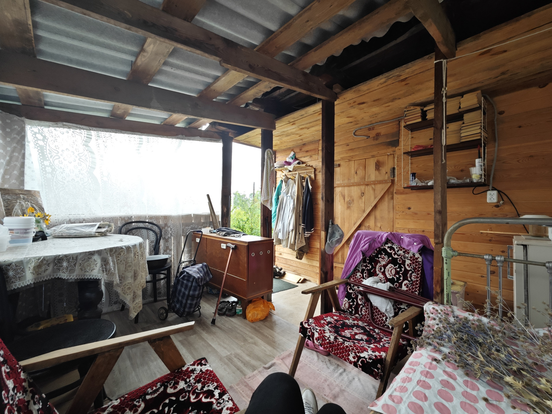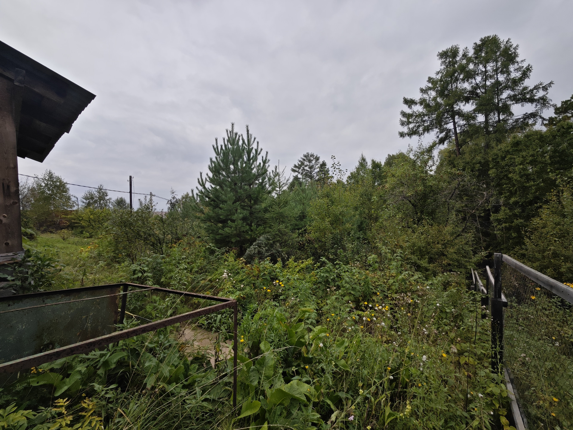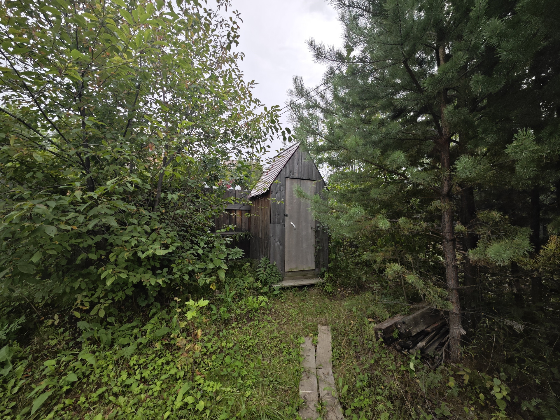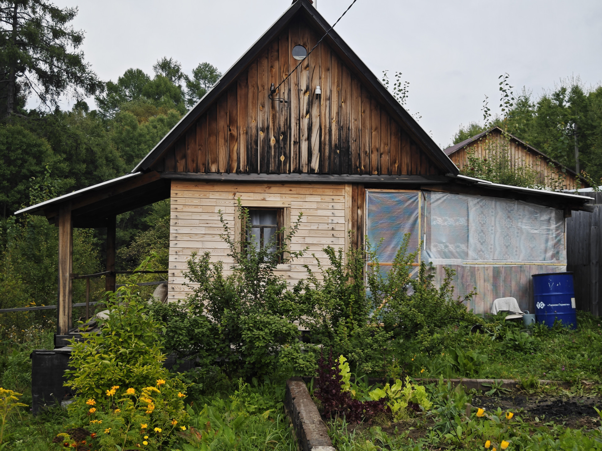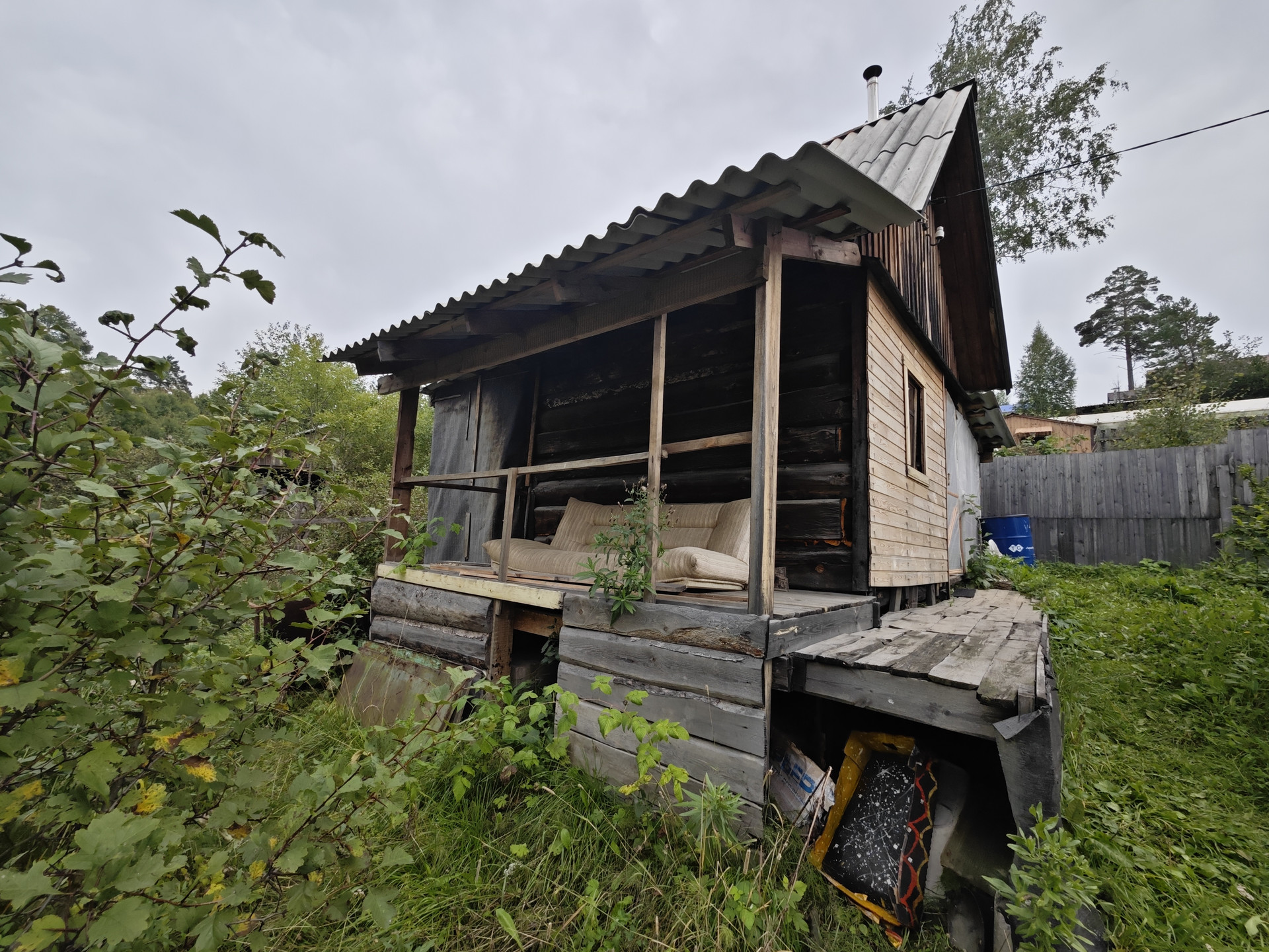 На участке имеется небольшой дом 12 м2 из кругляка, к нему пристроена кладовая. В доме две веранды - открытая и закрытая. Есть различные плодово-ягодные насаждения, через дорогу живописный лес.