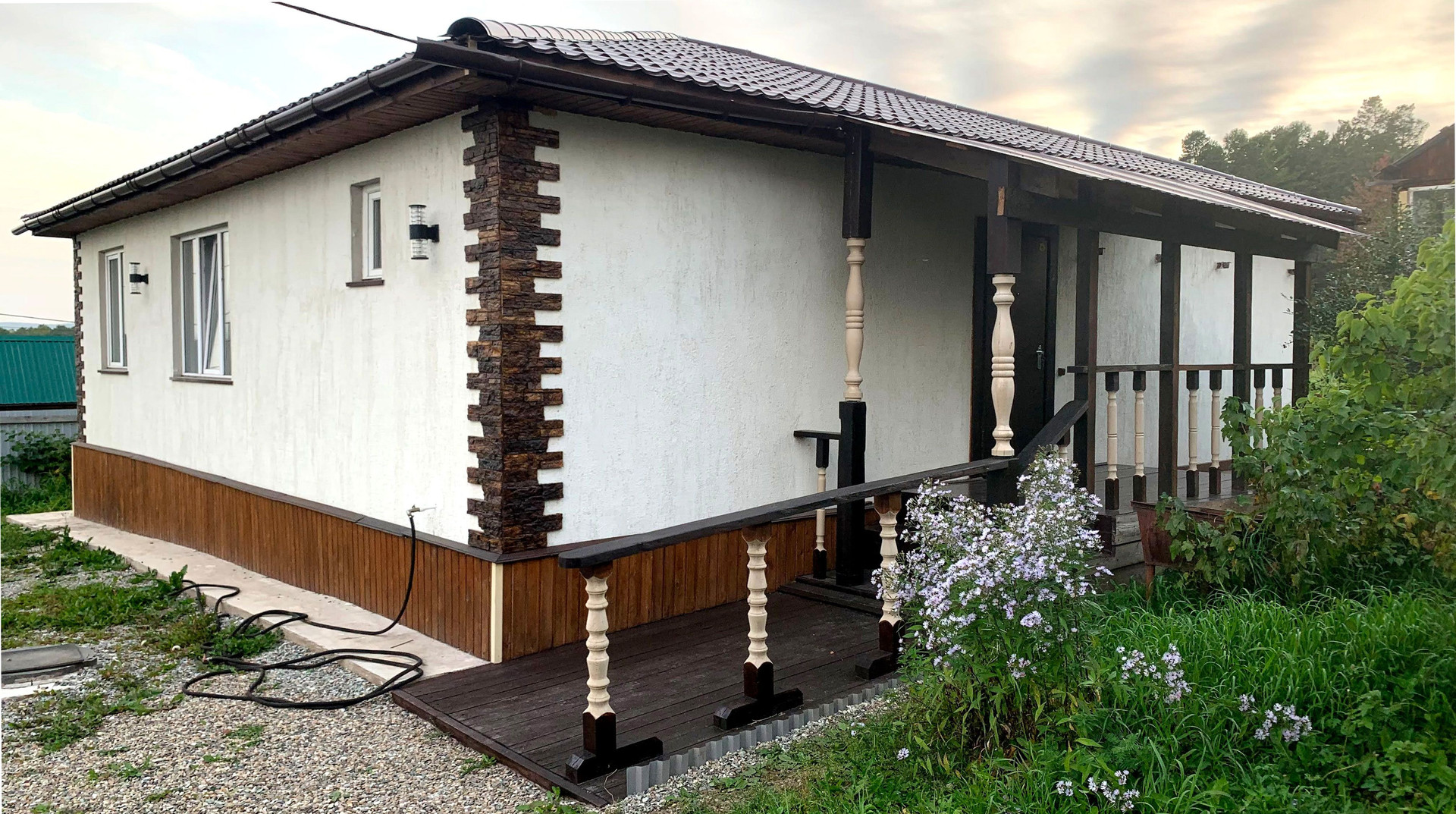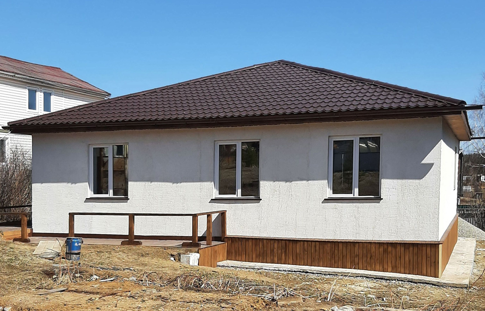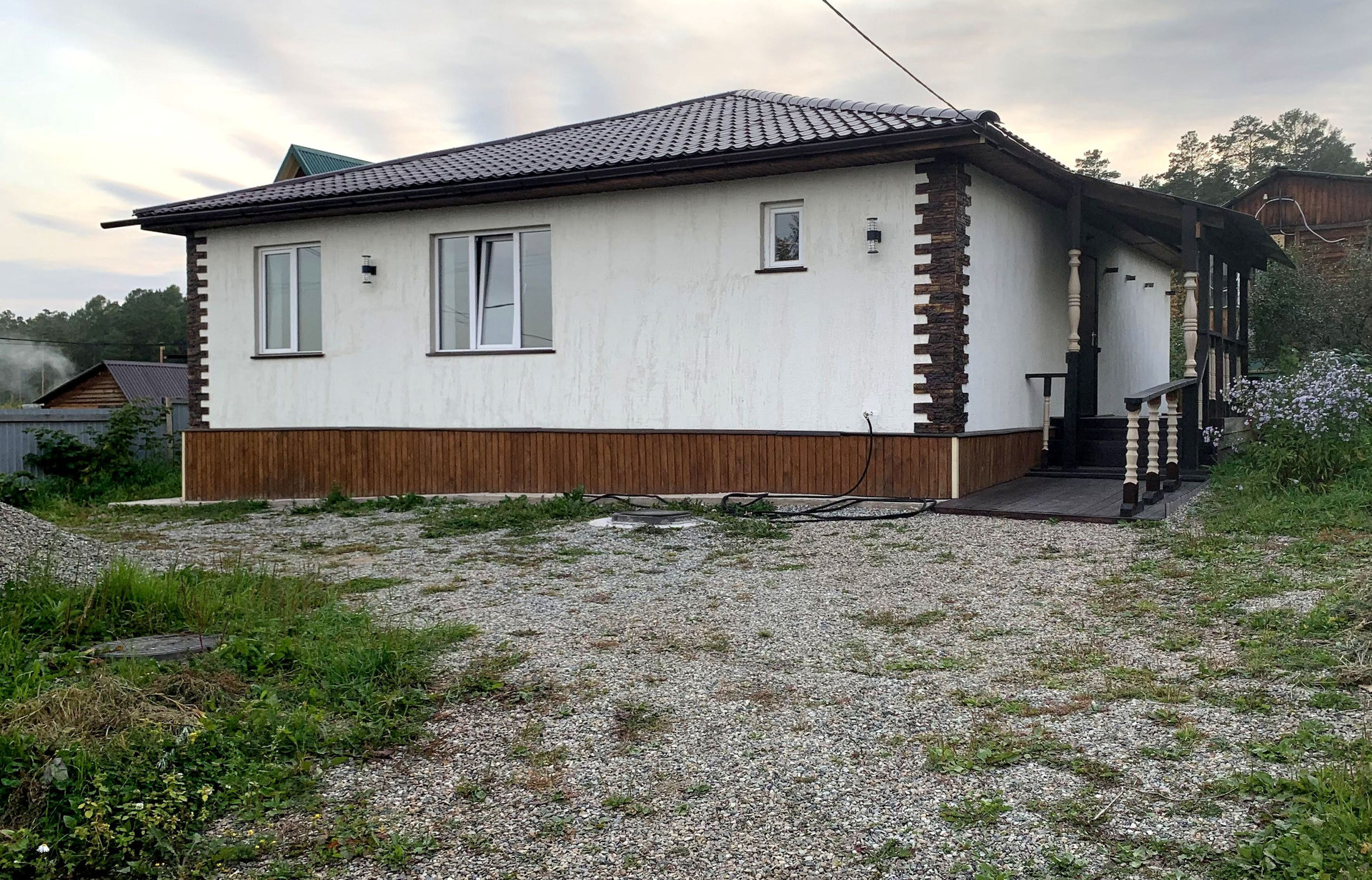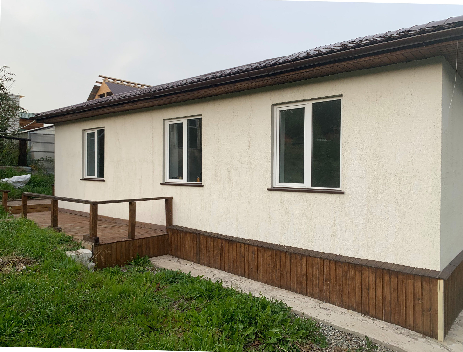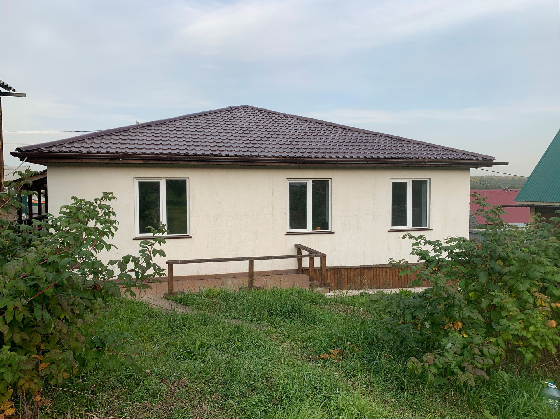 Дом НОВЫЙ 2021 года, площадь 100 м2 (10*10), построен из автоклавного газобетона 625/400. Фундаментные блоки (ФБС) 240/60/60 (на которых строят 5-этажные дома). Крыша из металлочерепицы (толщина 0,5). Снаружи сначала отштукатурен, сверху декоративная штукатурка «короед». Полы, потолок утеплены минеральной плитой Назаровской.