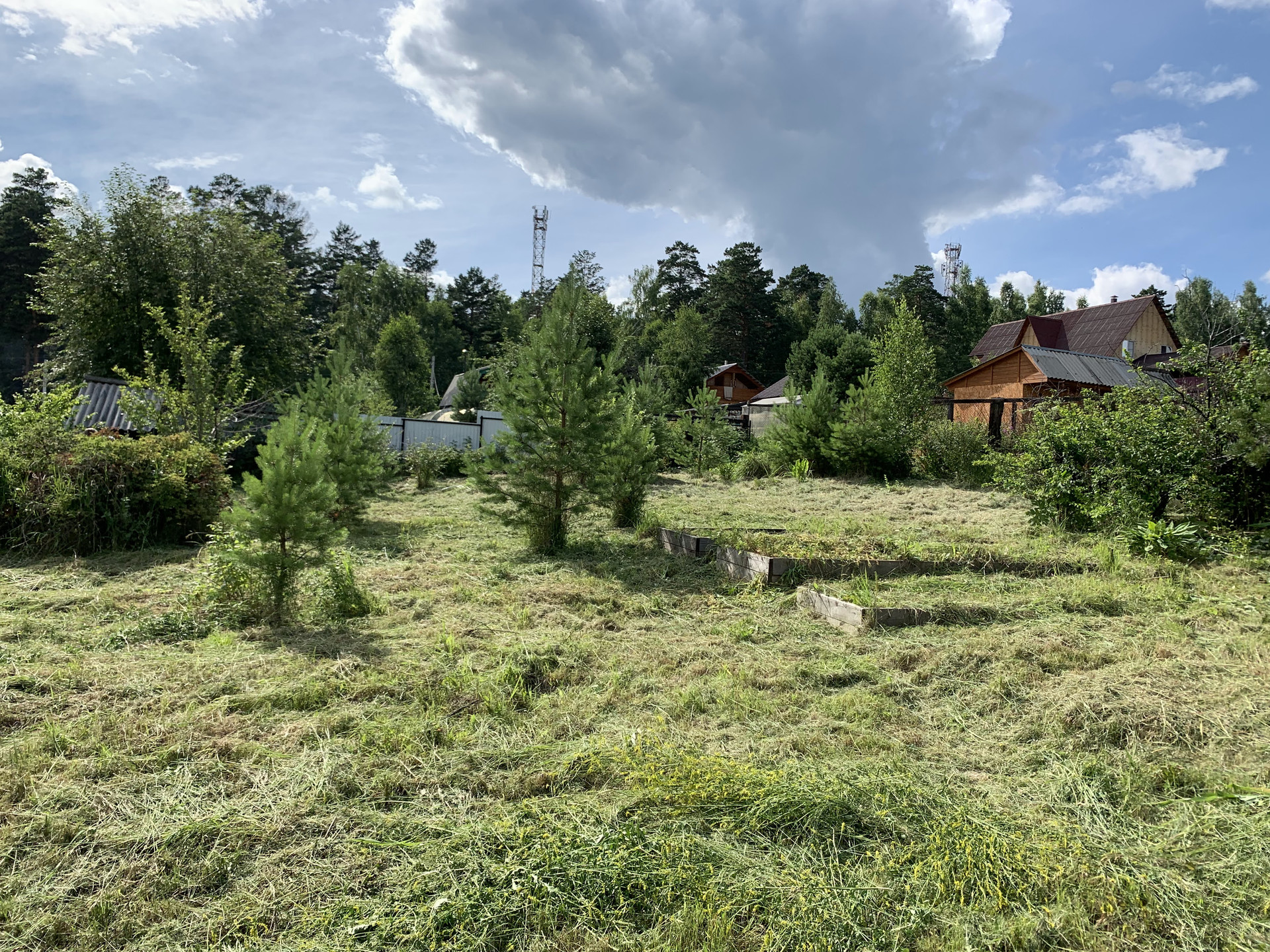 Участок 12 соток, ровный, разработан. Плодовые деревья - малина, вишня, жимолость, облепиха. Кустарник - сирень, рябина, калина, барбарис, растёт дуб. Есть летний водопровод.