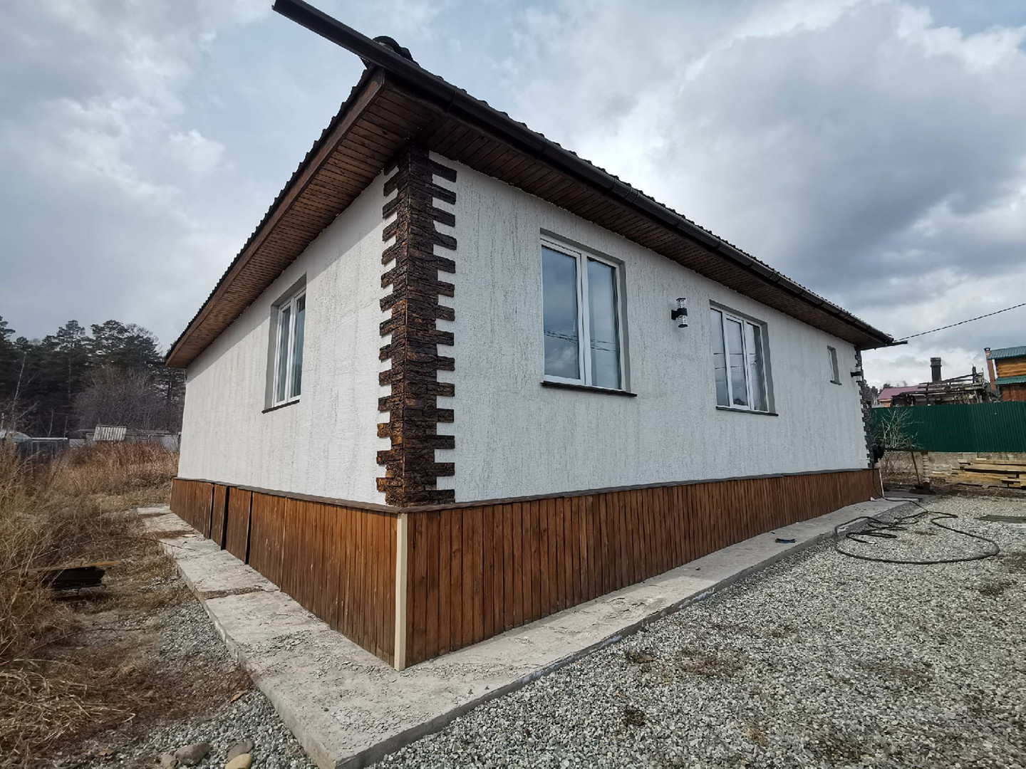Крыша четырехскатная (форма "конверт") металлочерепица (толщина 0,5!). Снаружи сначала отштукатурен, сверху декоративная штукатурка «короед».