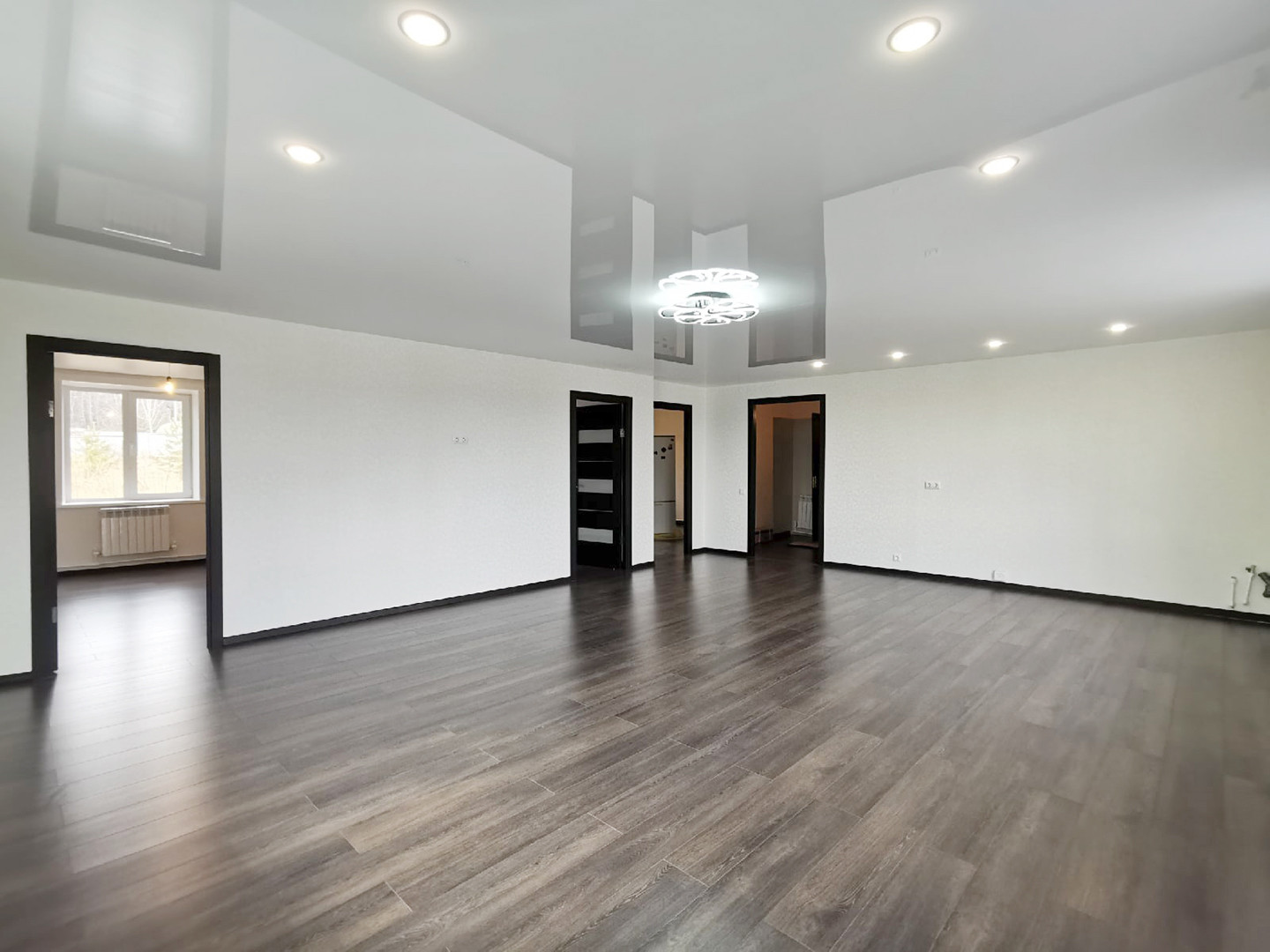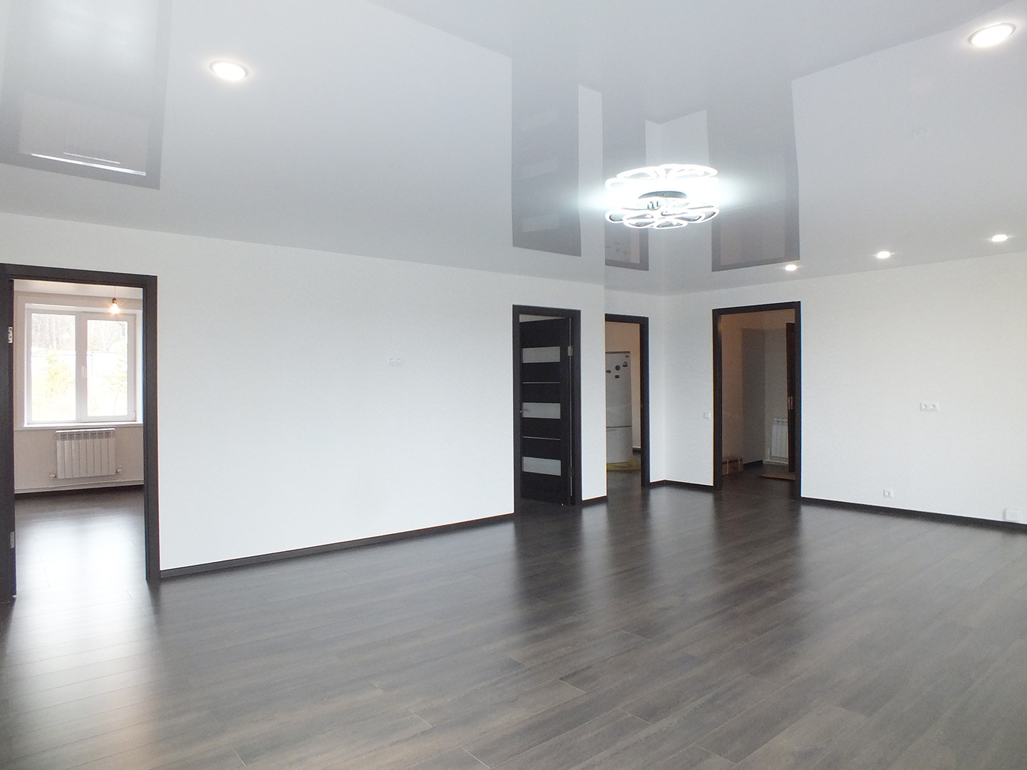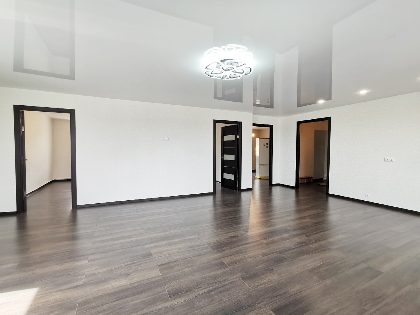 Сантехника установлена, дорогой ламинат 8мм, хорошие обои, натяжной потолок, двери из шпона!