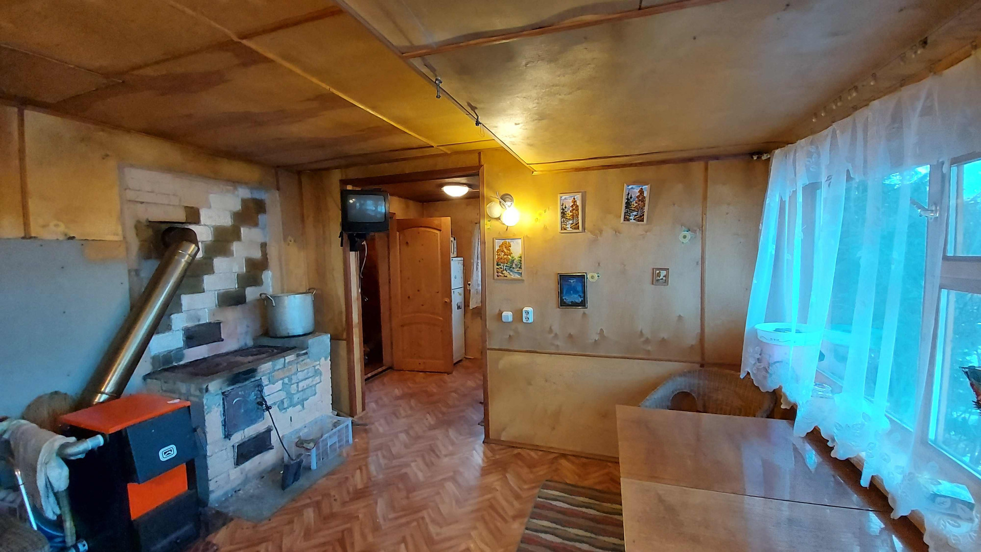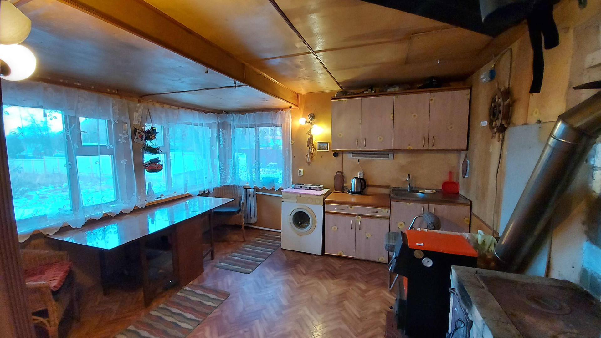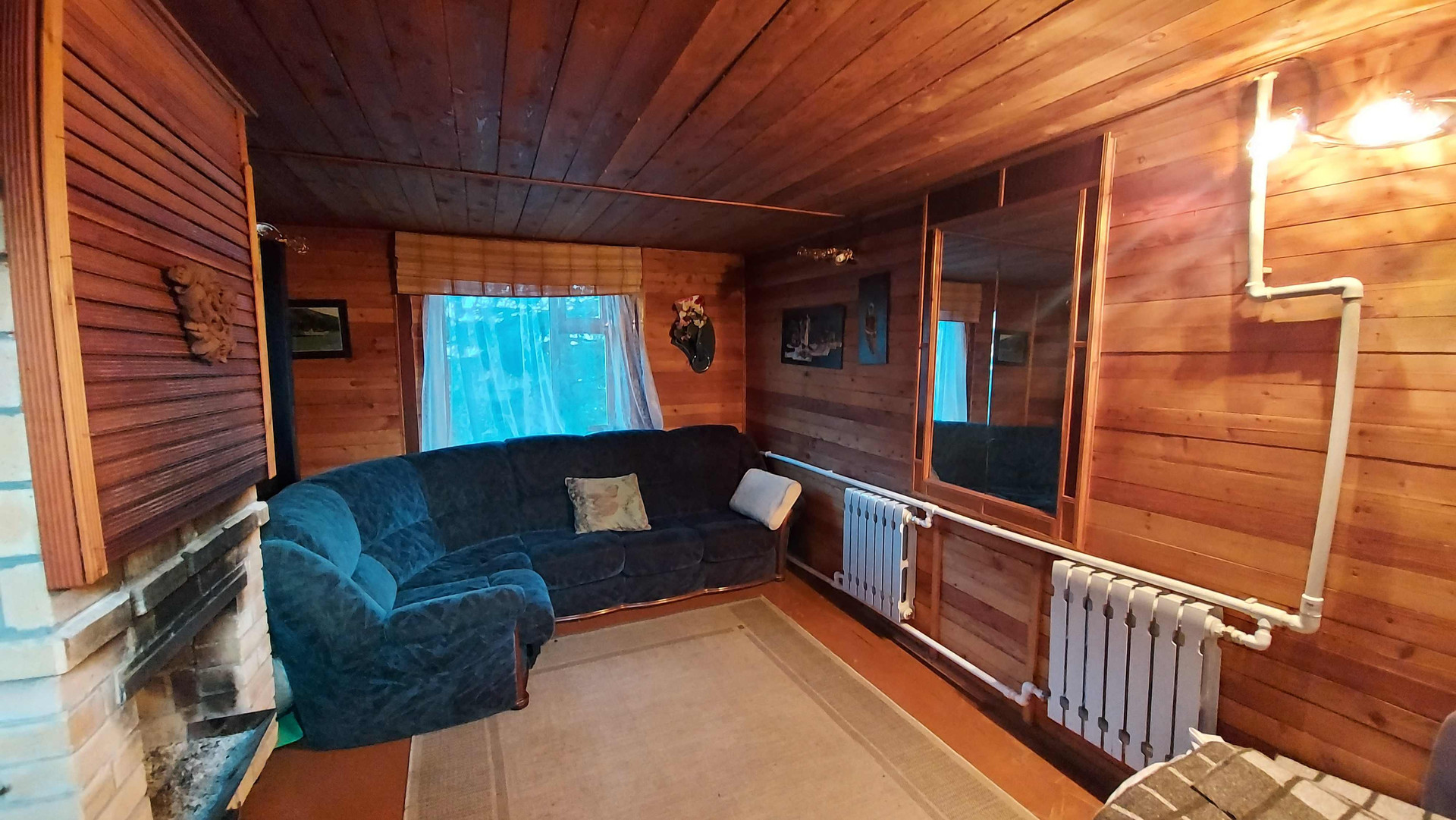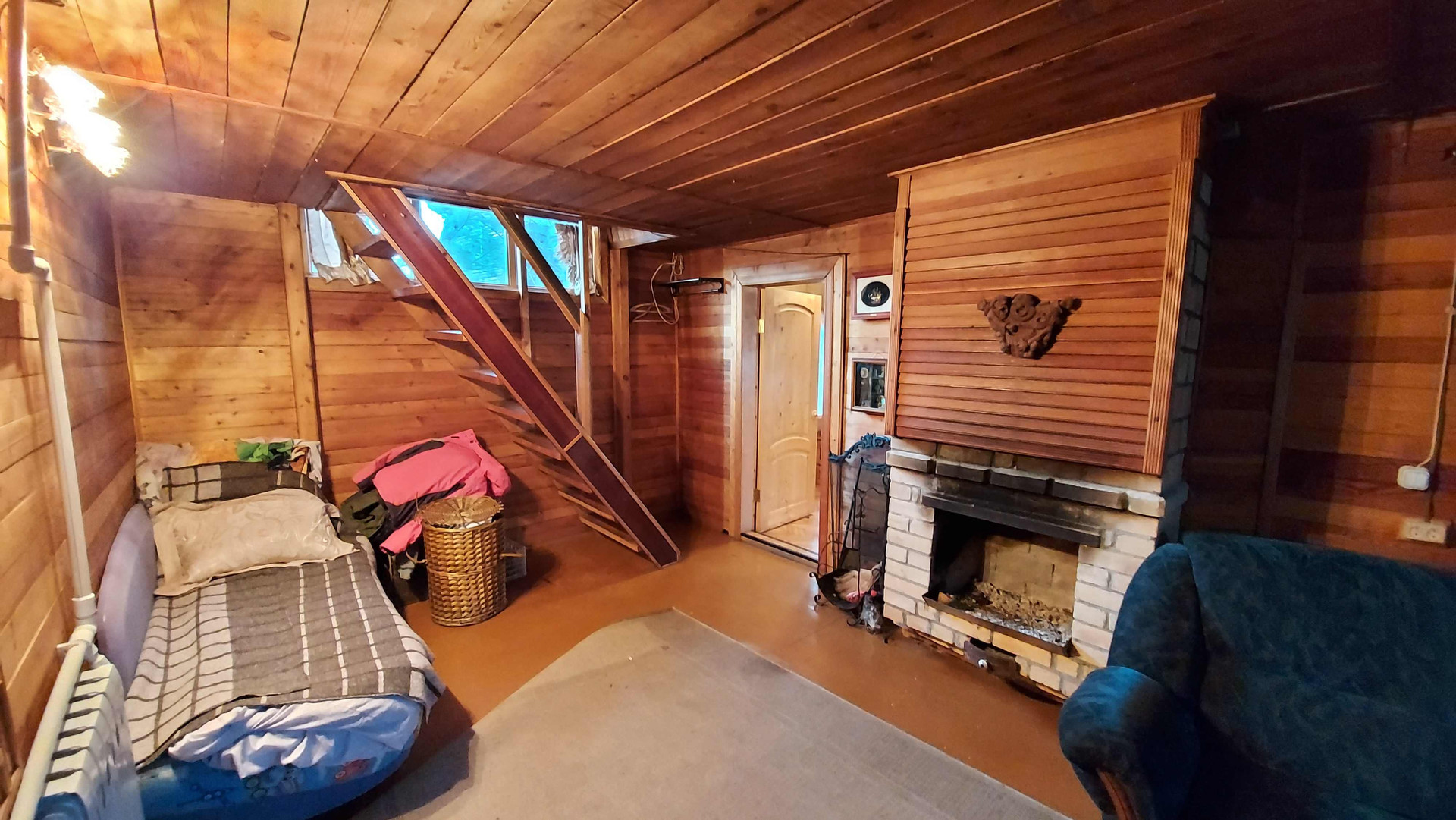 Двухэтажный дoм: большая кухня, печь и котёл для отопления, вода заведена в дом, гостиная с камином, а на втором этаже спальня.