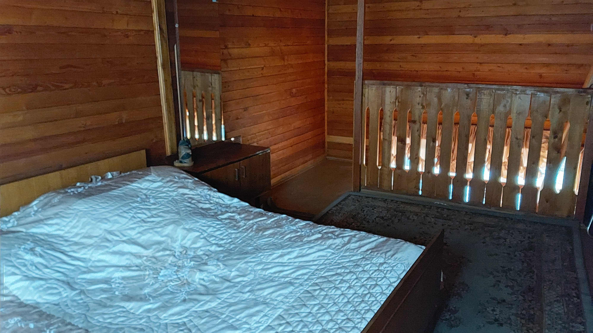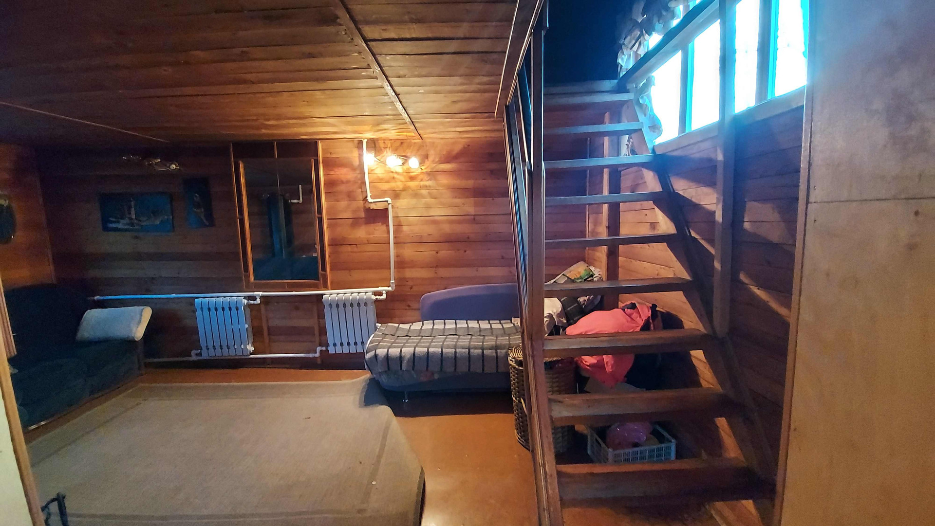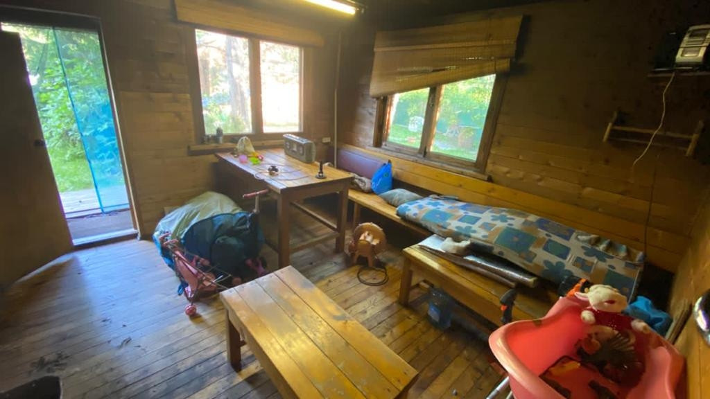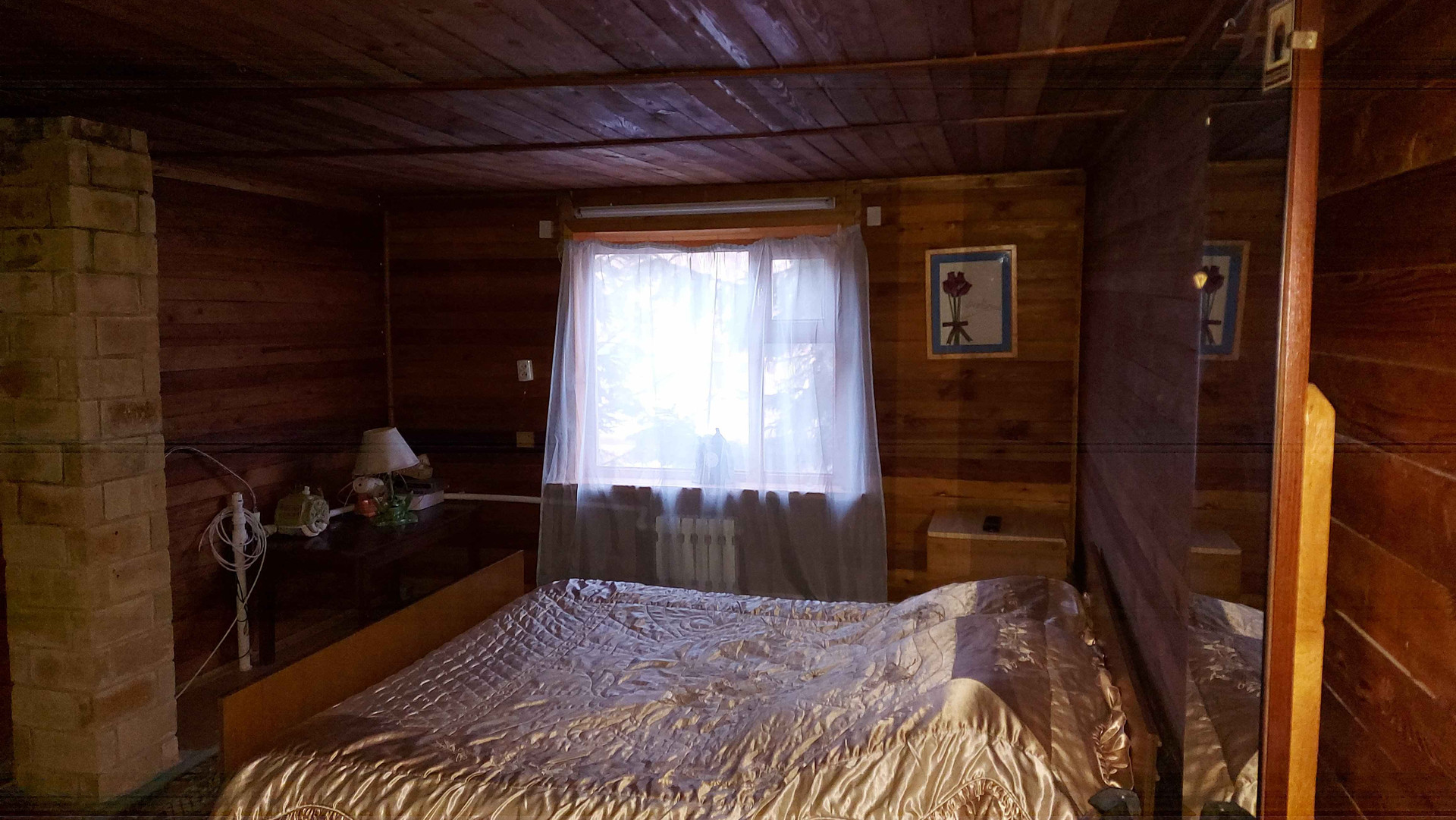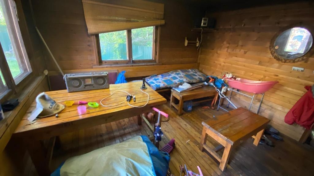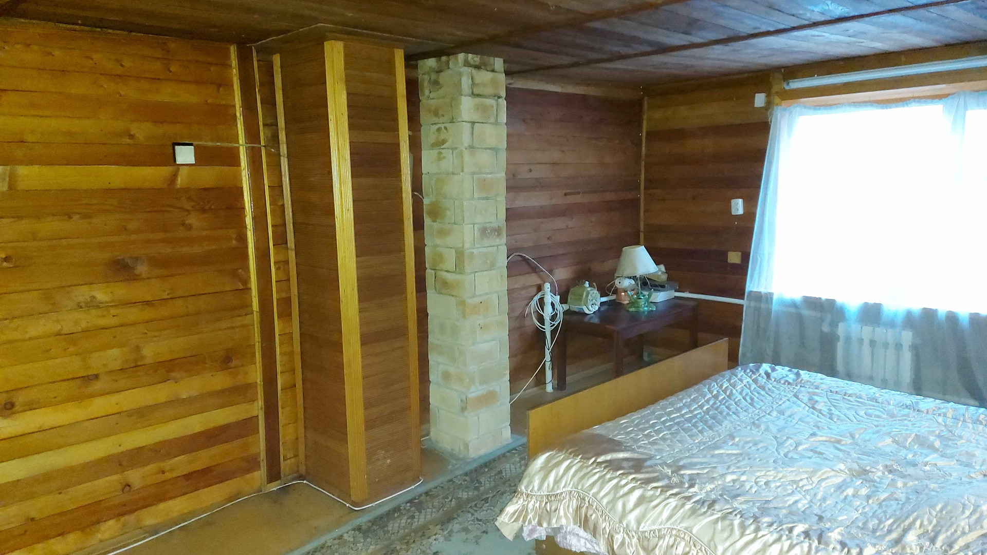 Двухэтажный дoм: большая кухня, печь и котёл для отопления, вода заведена в дом, гостиная с камином, а на втором этаже спальня.