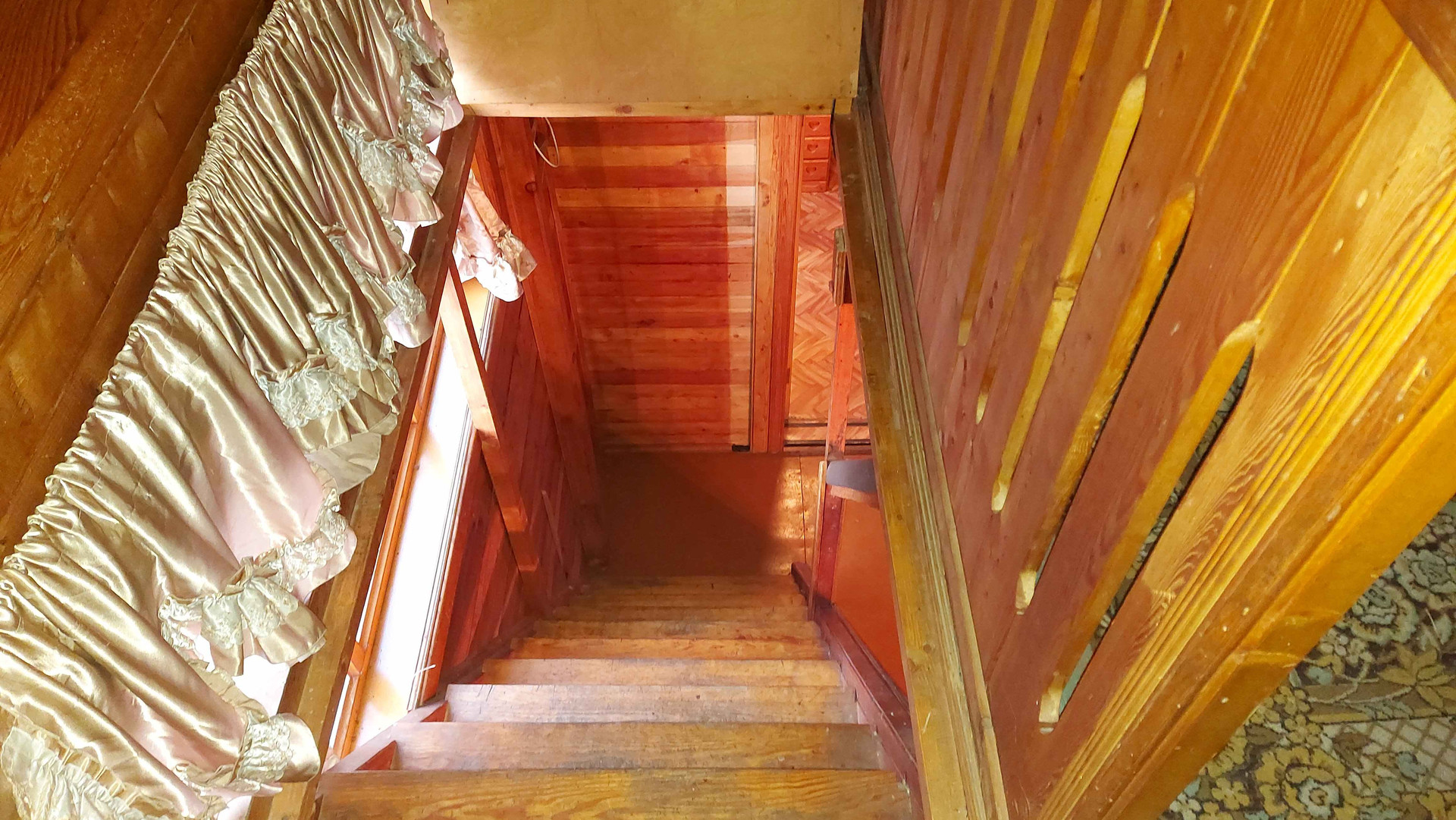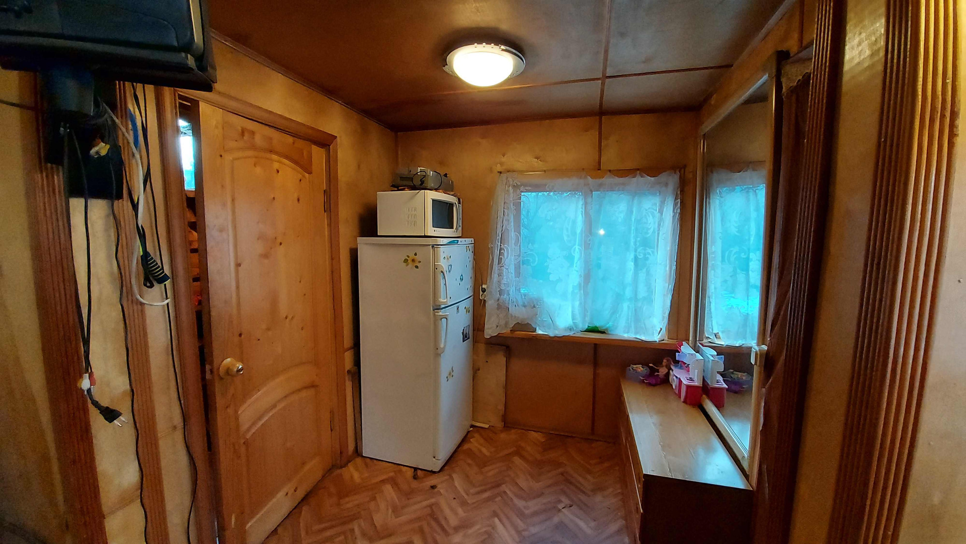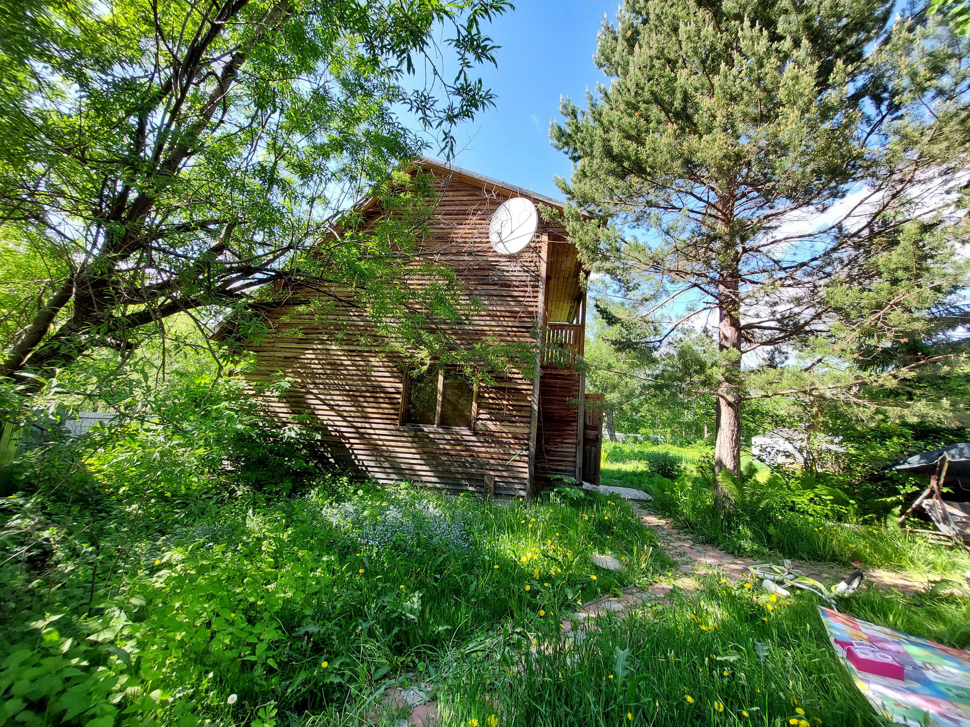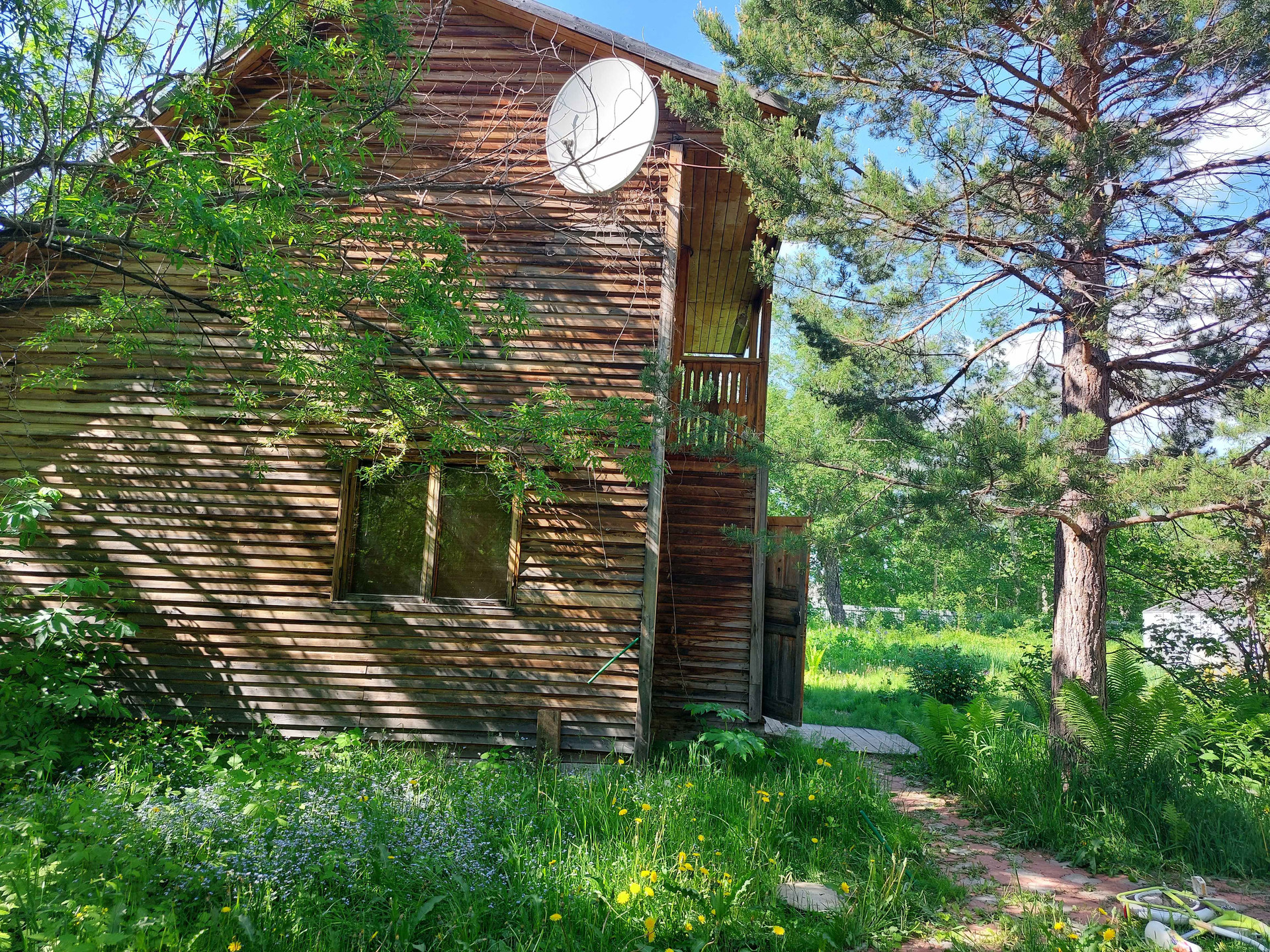 Двухэтажный дoм: большая кухня, печь и котёл для отопления, вода заведена в дом, гостиная с камином, а на втором этаже спальня.