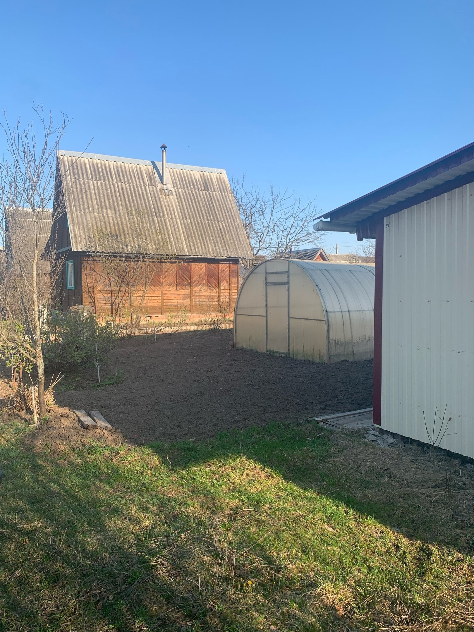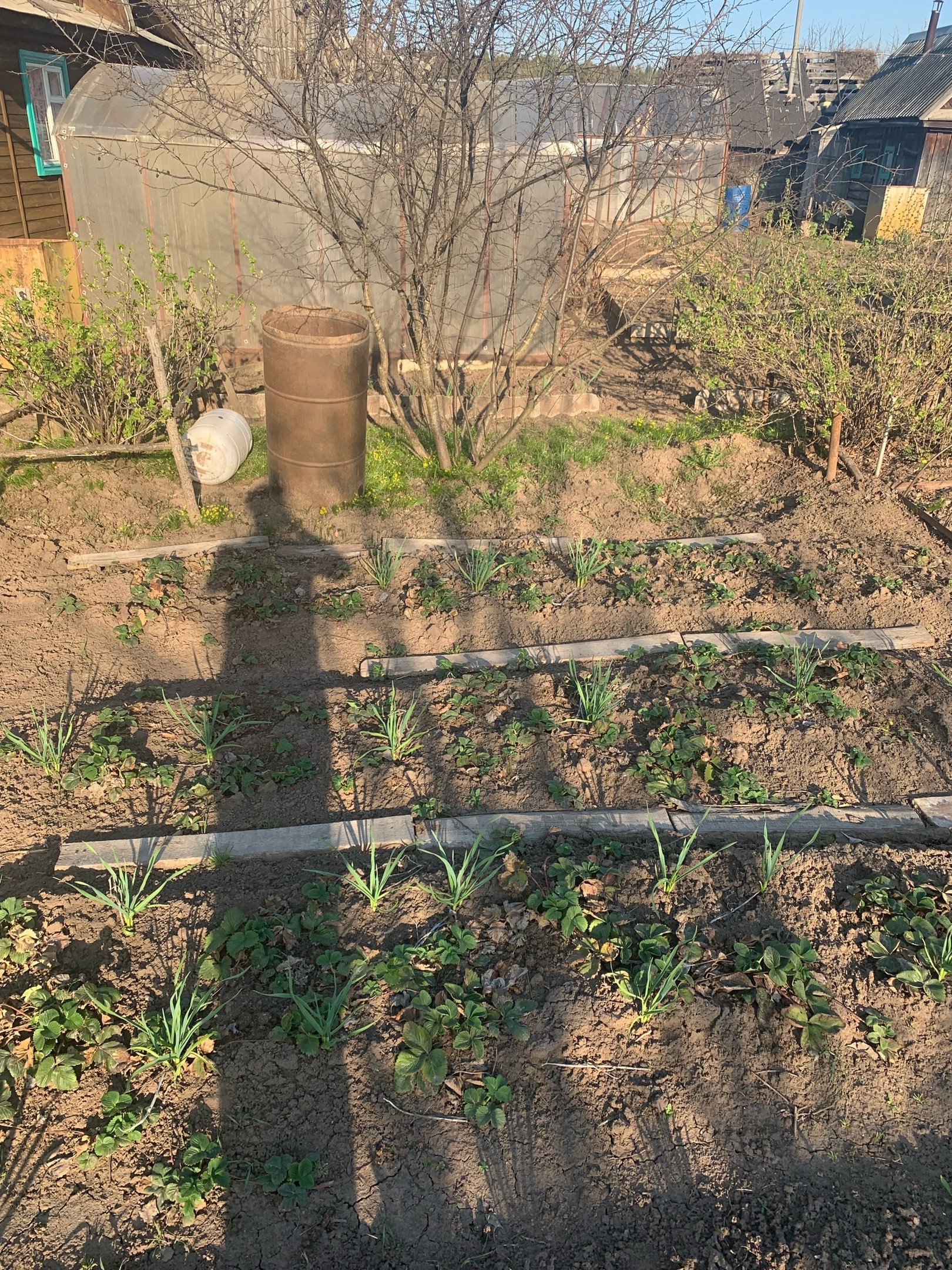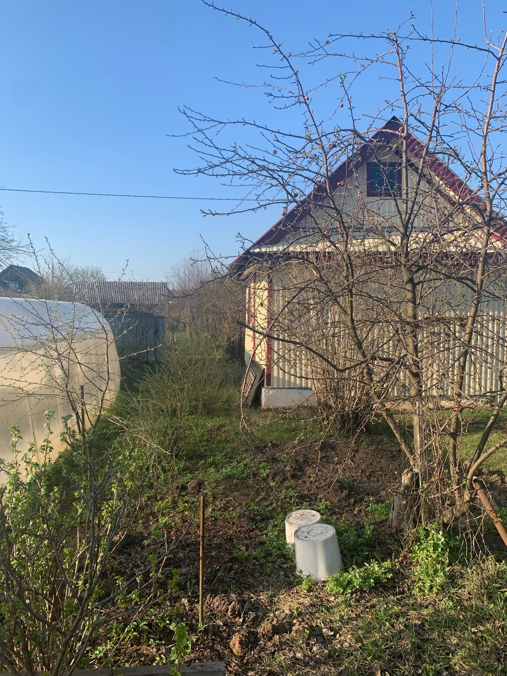 Из растений: три плодоносящие яблони, шесть кустов крупной, сладкой черной смородины, куст красной смородины, куст крыжовника, садовая земляника, посажено 4 куста роз, и пионов, посажен куст жимолости, гортензии, два куста сирени
