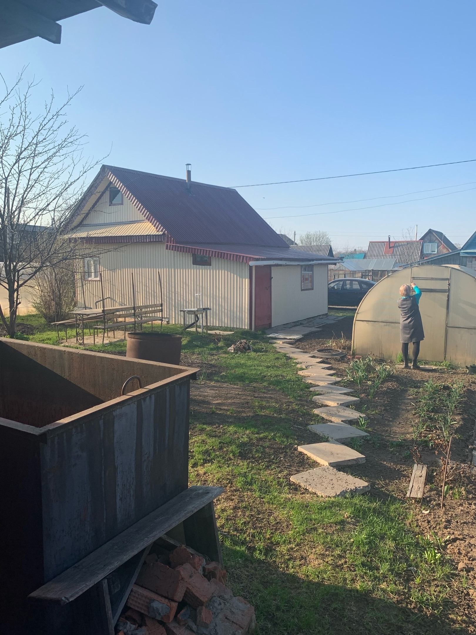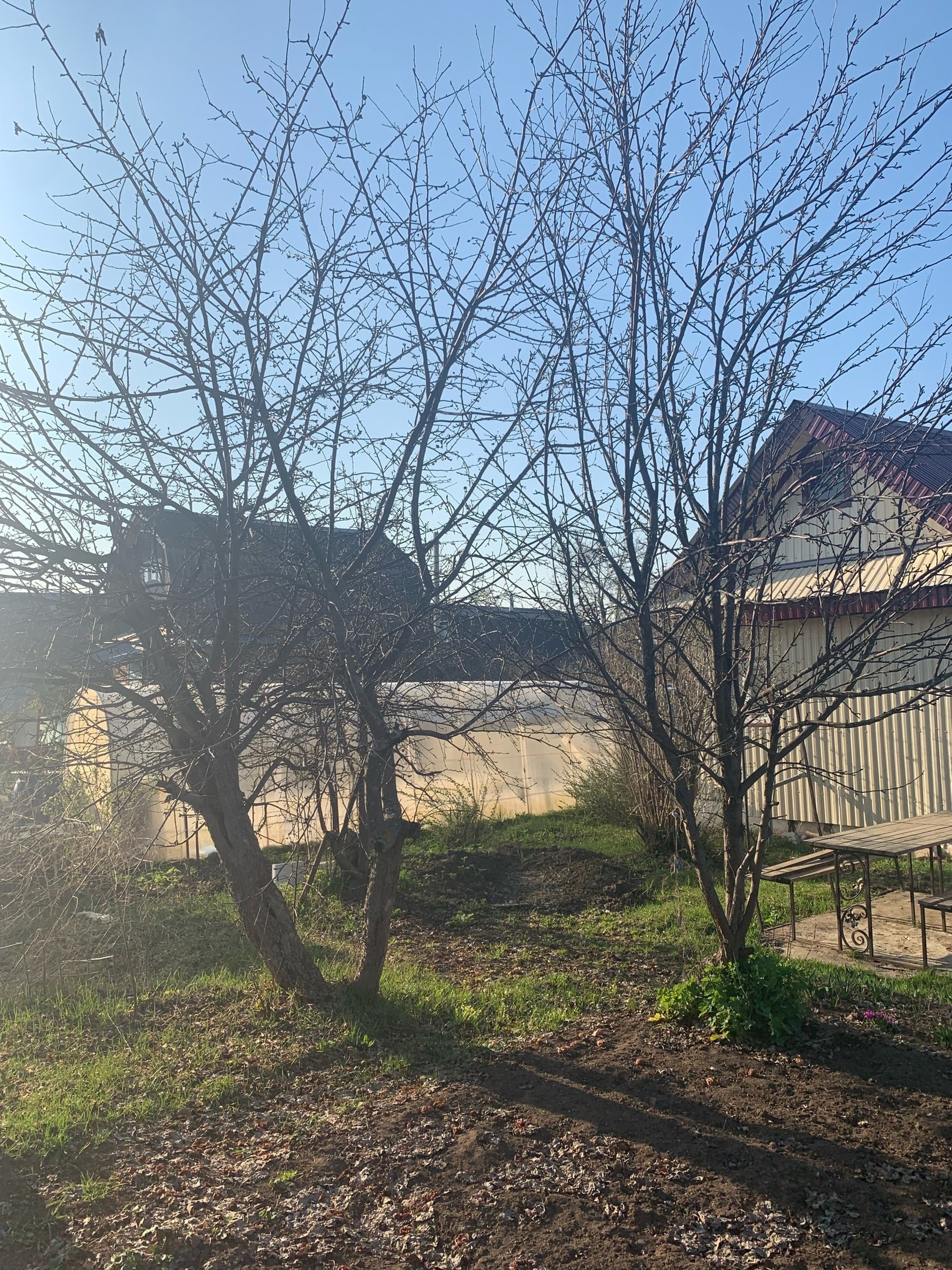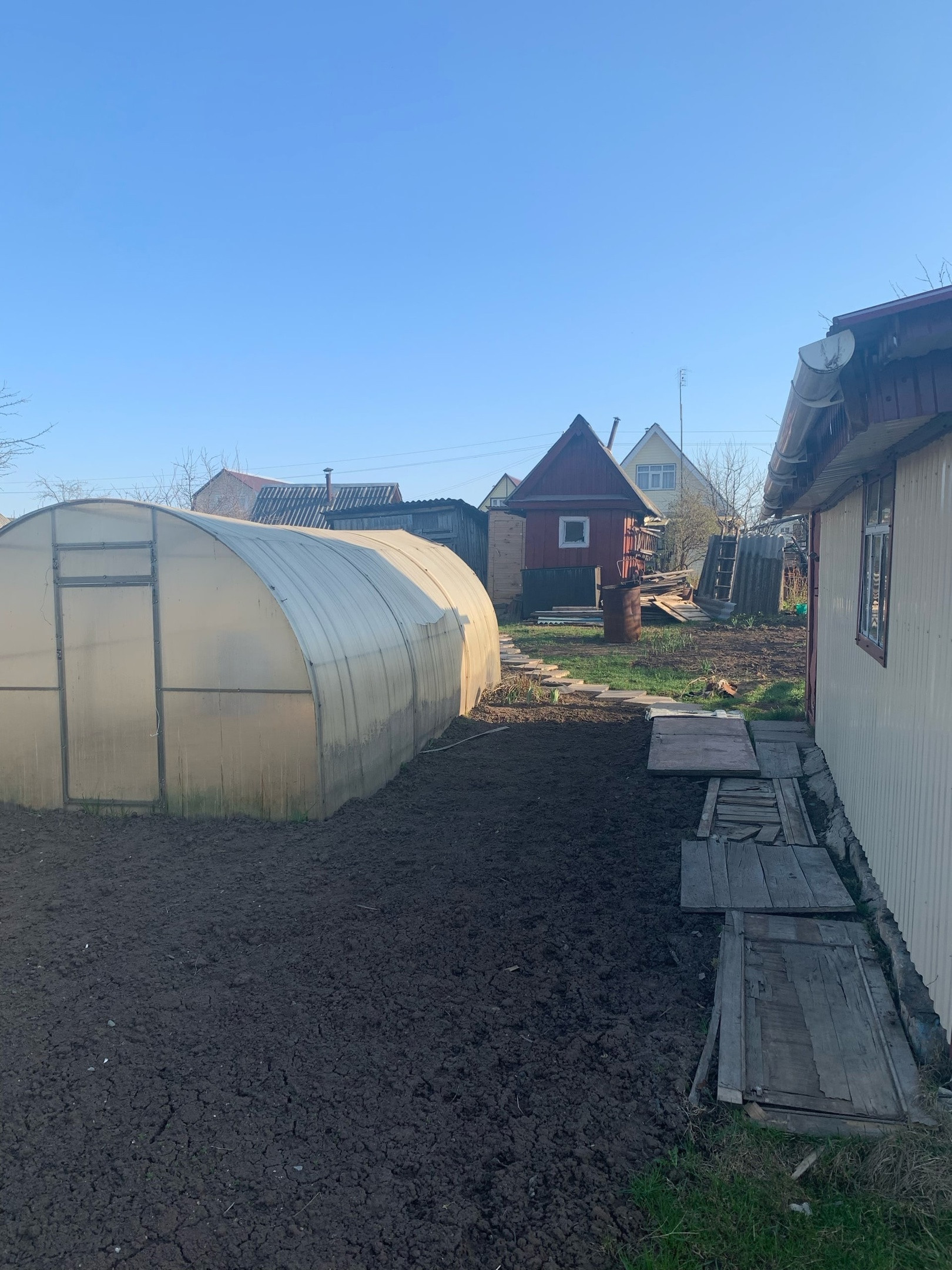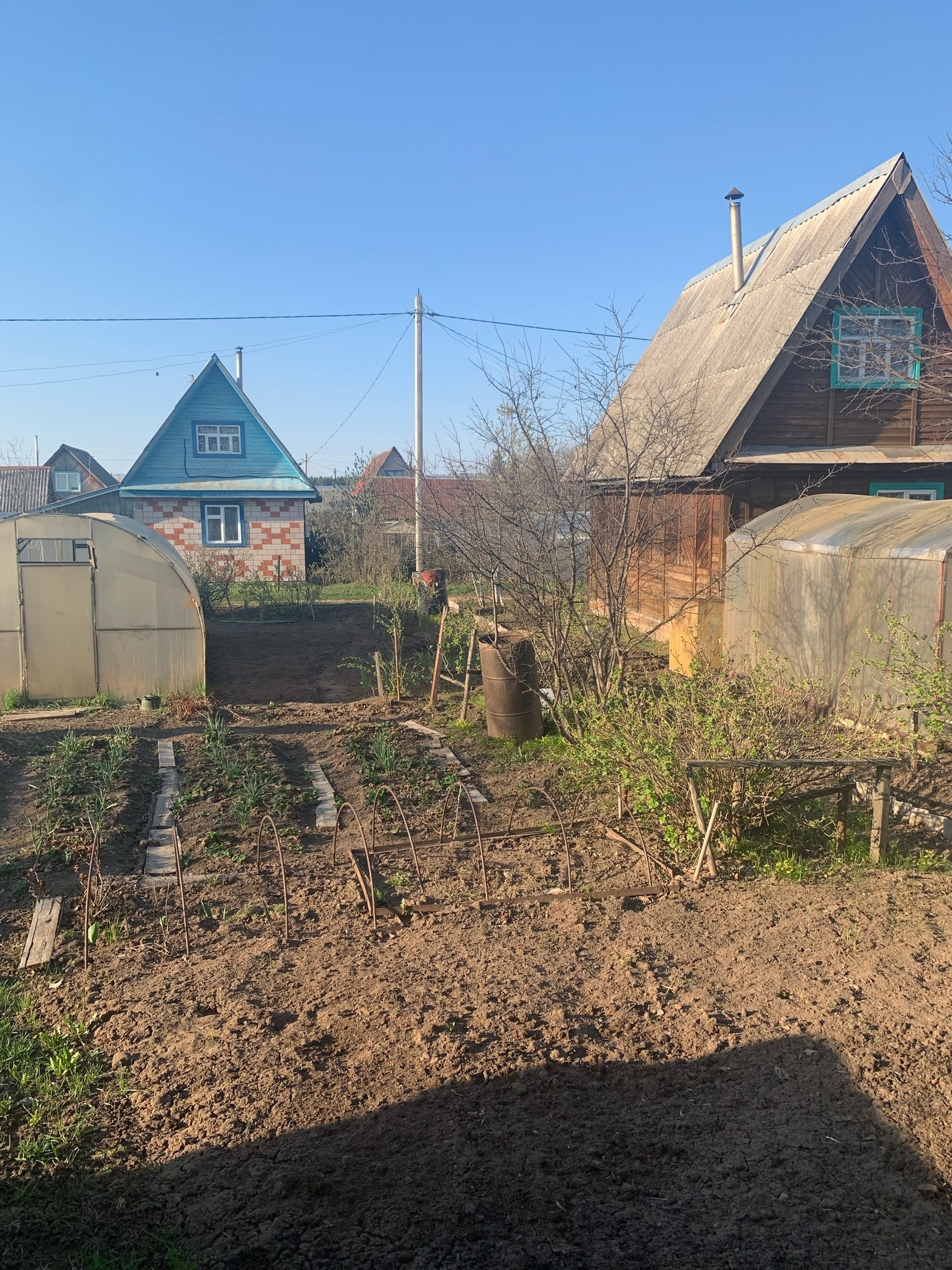 Из растений: три плодоносящие яблони, шесть кустов крупной, сладкой черной смородины, куст красной смородины, куст крыжовника, садовая земляника, посажено 4 куста роз, и пионов, посажен куст жимолости, гортензии, два куста сирени