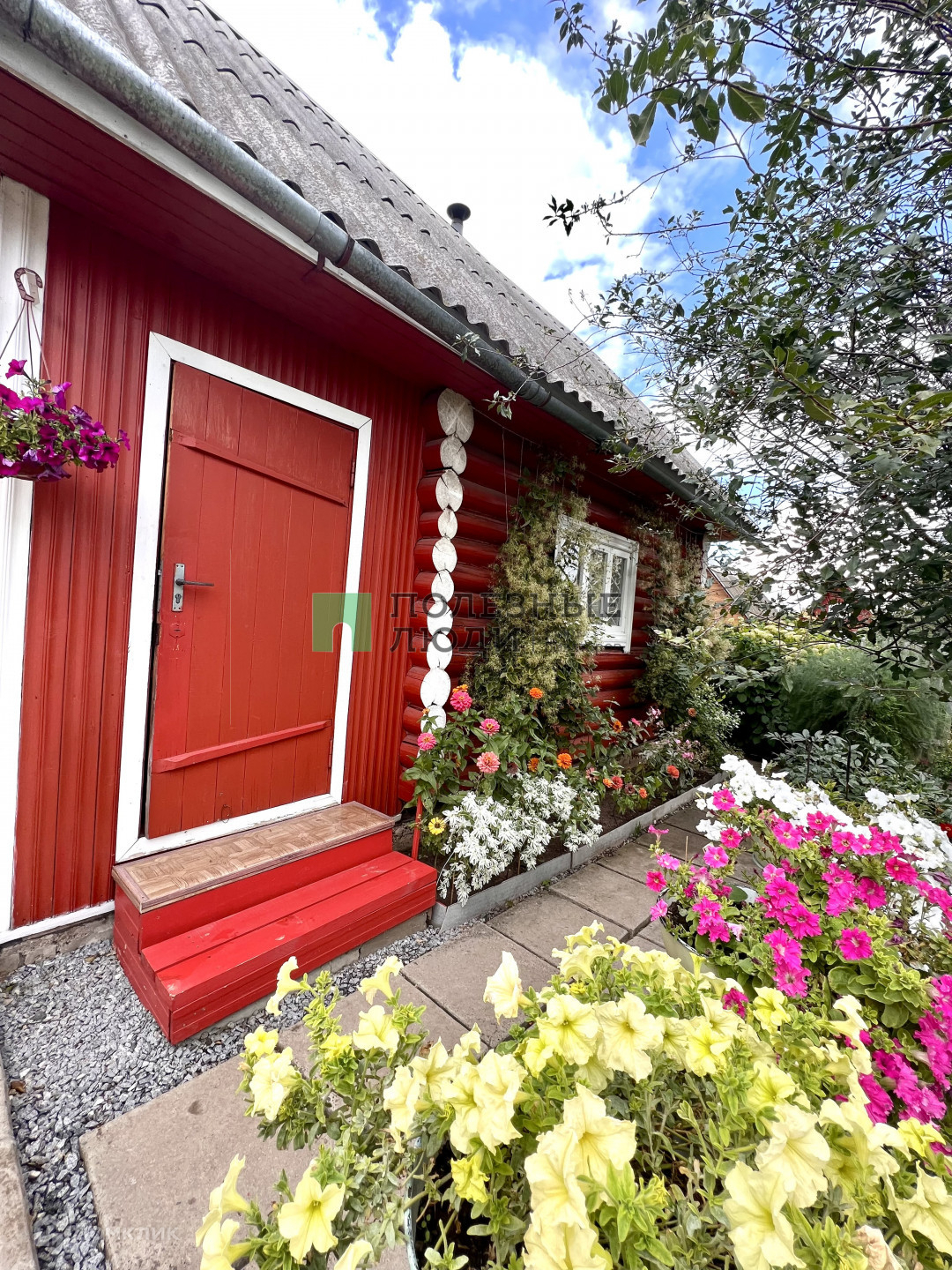 5 плодоносных яблонь, вишня, смородина, ухоженный малинник, большое количество различных цветов, грядка сладкой клубники.