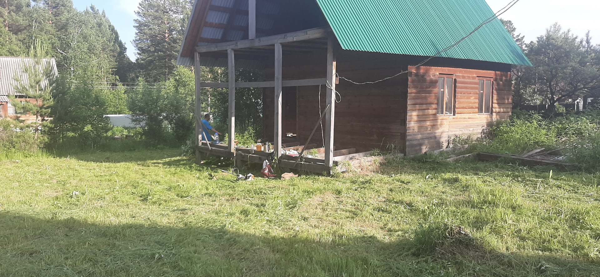 Дом (размер 6х6 плюс веранда, брус 18х18, ленточный фундамент) не достроен.