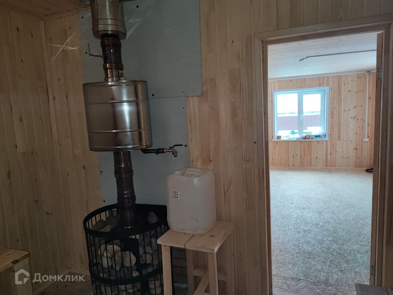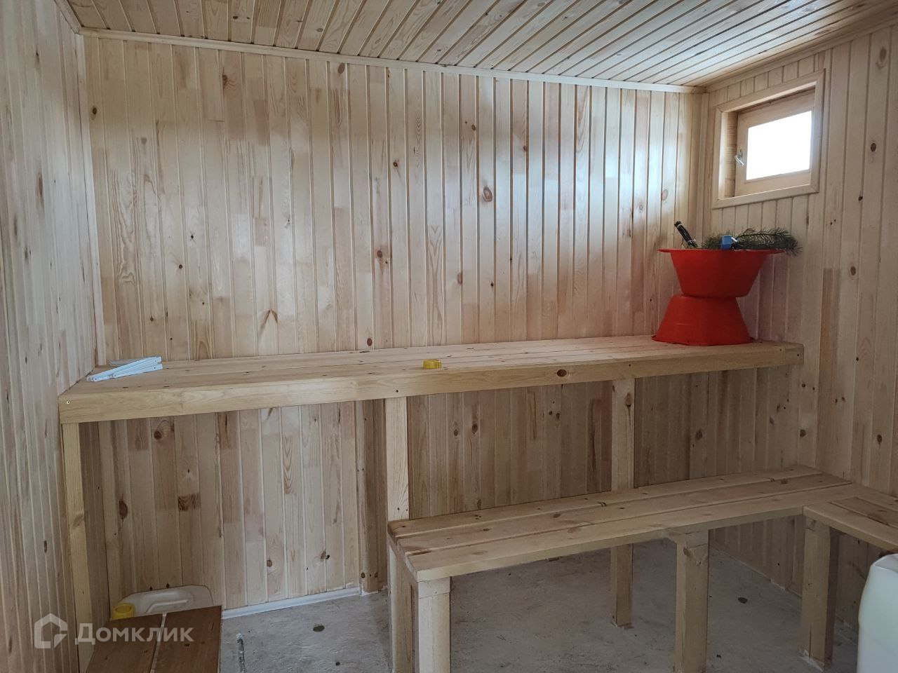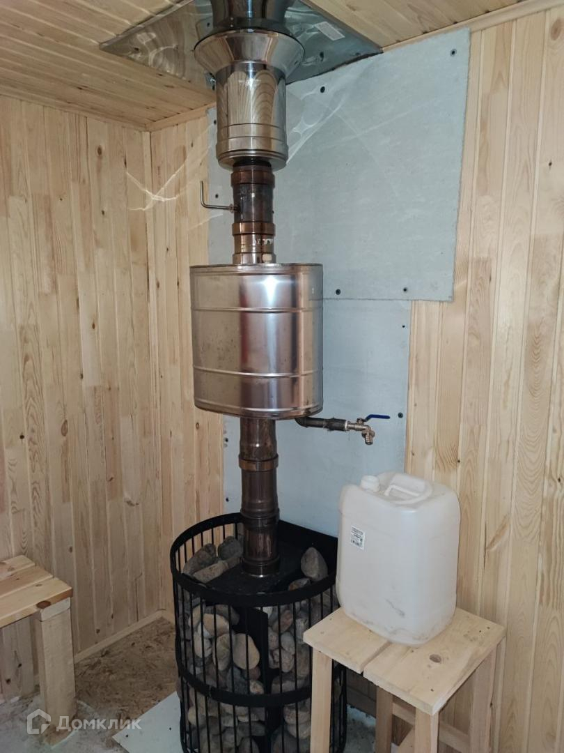 На участке построена баня с зоной отдыха, выполненная из соснового кругляка диаметром 25 см, на ленточном фундаменте 4x8 м. Баня дополнительно утеплена 10 см утеплителем и обшита вагонкой, площадь парной 7,3 м2 (2,7х2.7 м), установлена новая современная печь. Двойные полы: 1 слой доска, второй слой — осб плита.