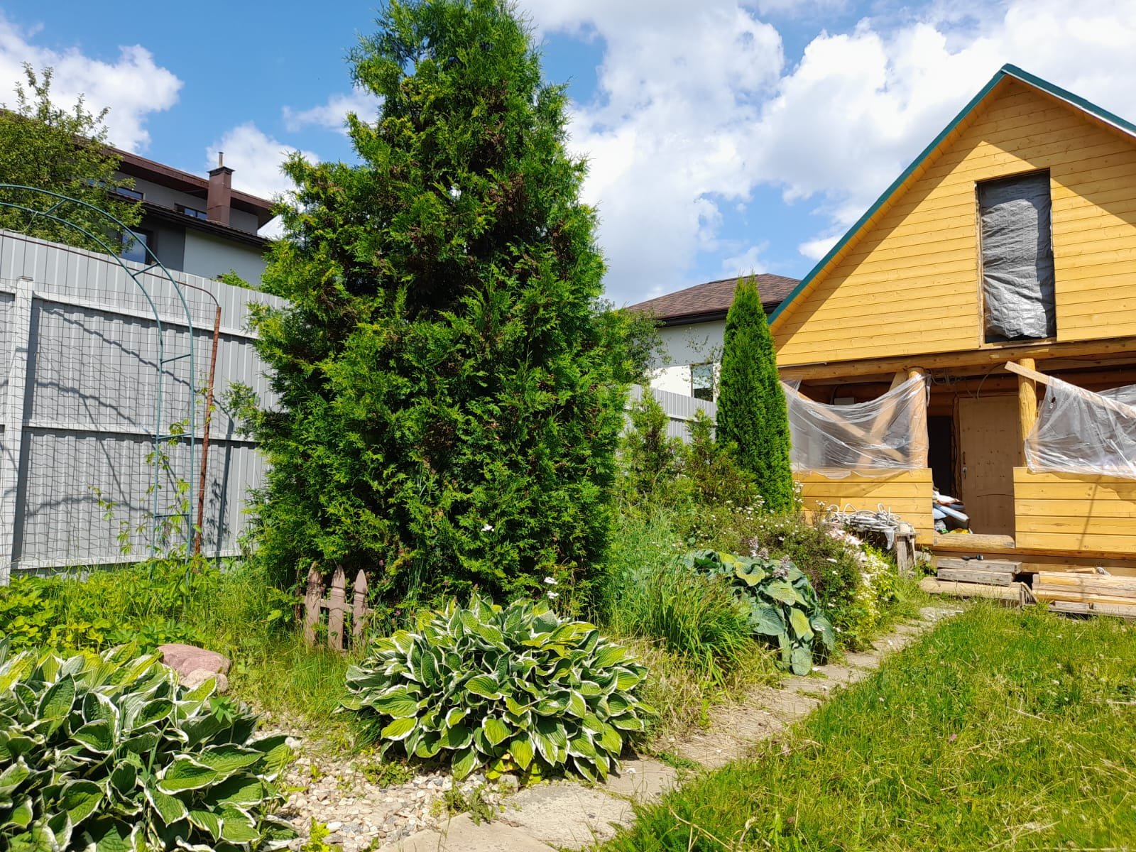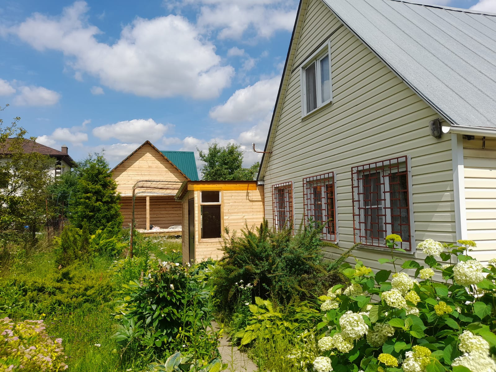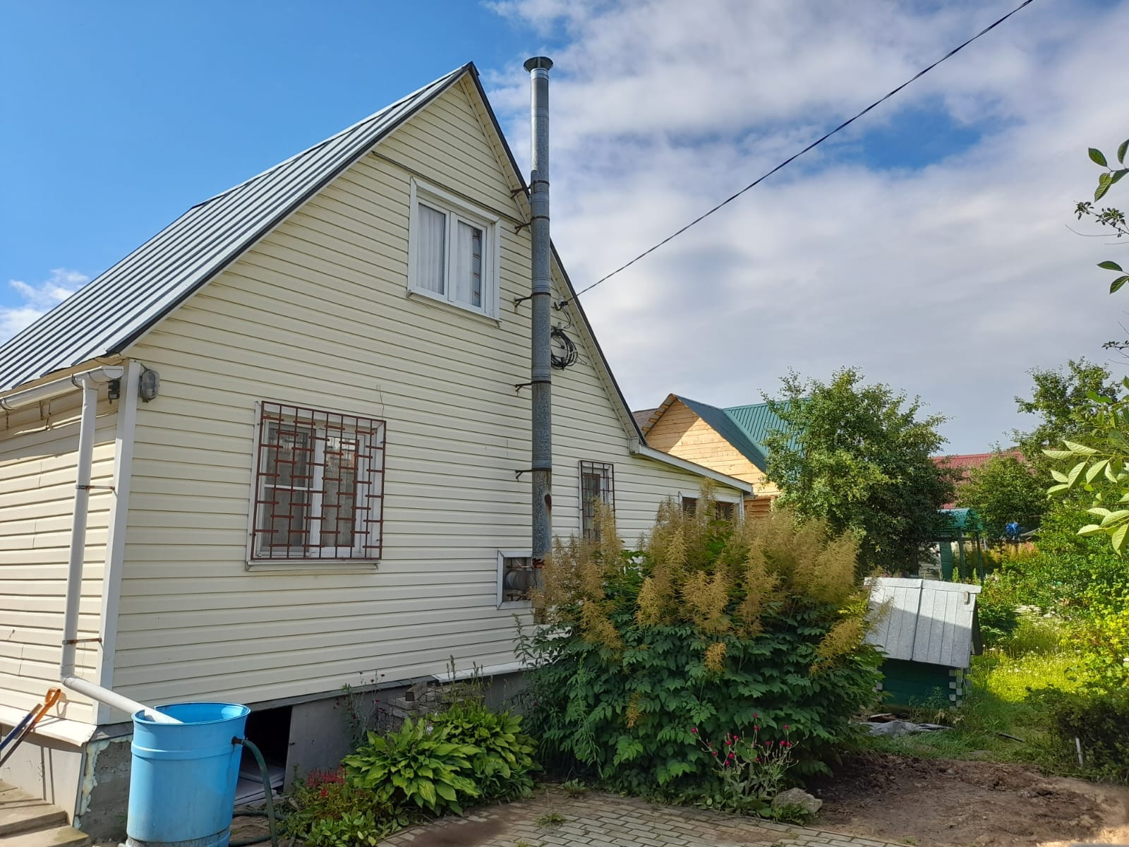 Участок огорожен высоким металлическим забором и раздвижными воротами, парковка во дворе на две машины. Участок ухожен, оборудован фонтанчик, клумбы с цветами, проложены тропинки, газон. На участке посажены туи, вишни, яблони, груши, ягодные кустарники.