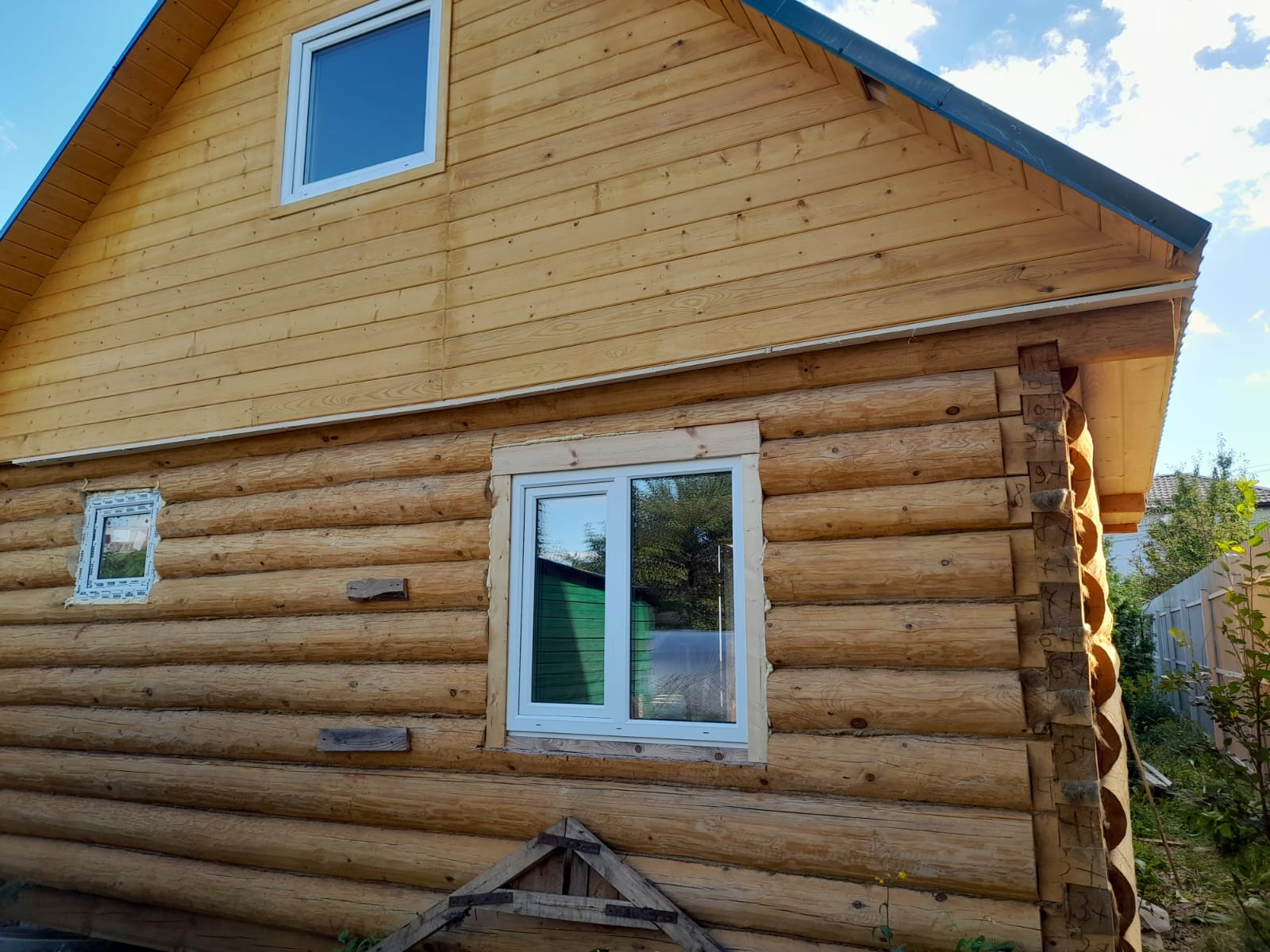 Второй дом из бревна 65 кв.м., построен в 2023 году, 2х этажный. размеры 6/6, бревна все прошли обработку, пропитаны и покрашены. Планировалась баня, но можно доделать как второй жилой дом. Заведено электричество и вода в дом. Стоит на винтовых, металлических сваях.Требует небольшой внутренней отделки.