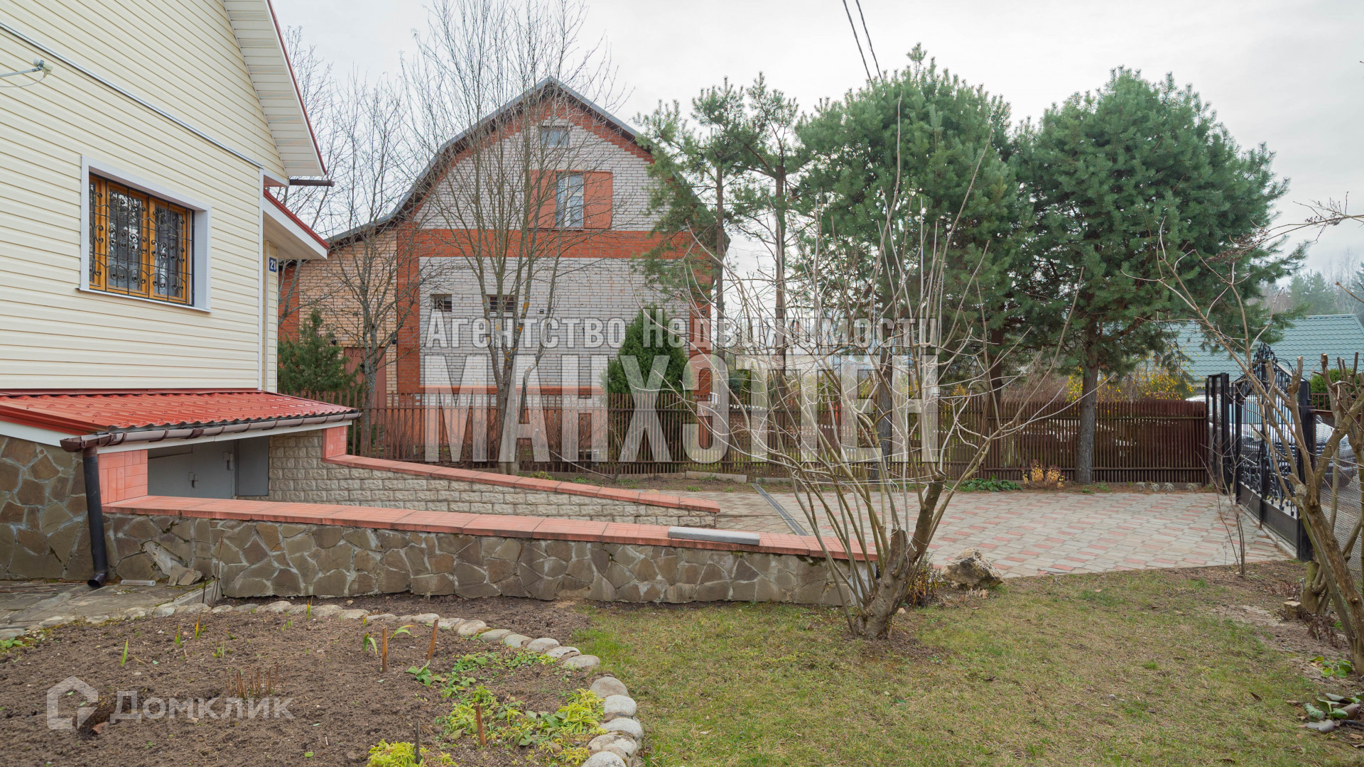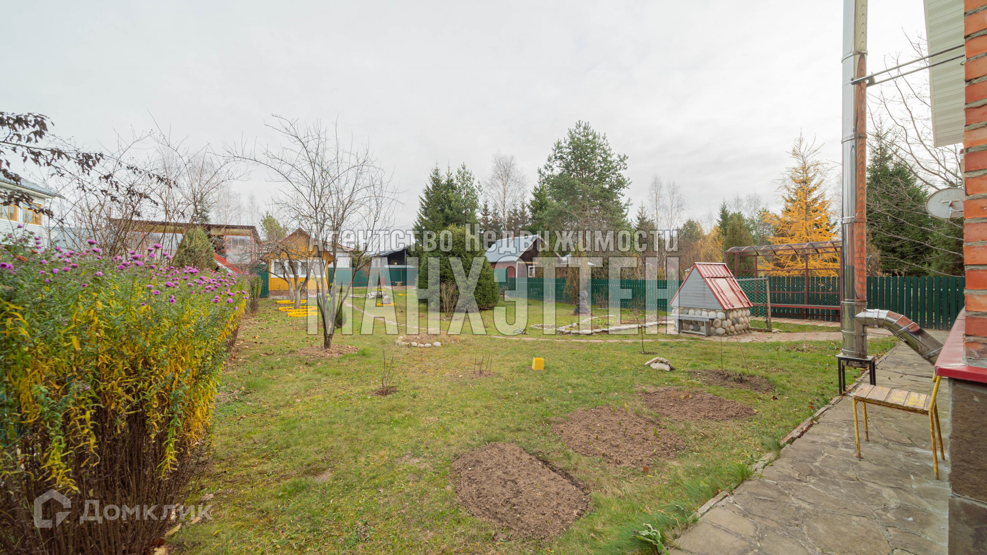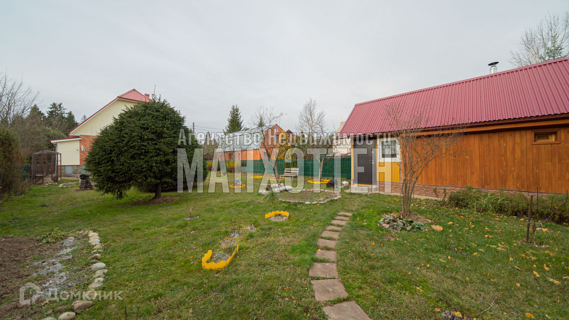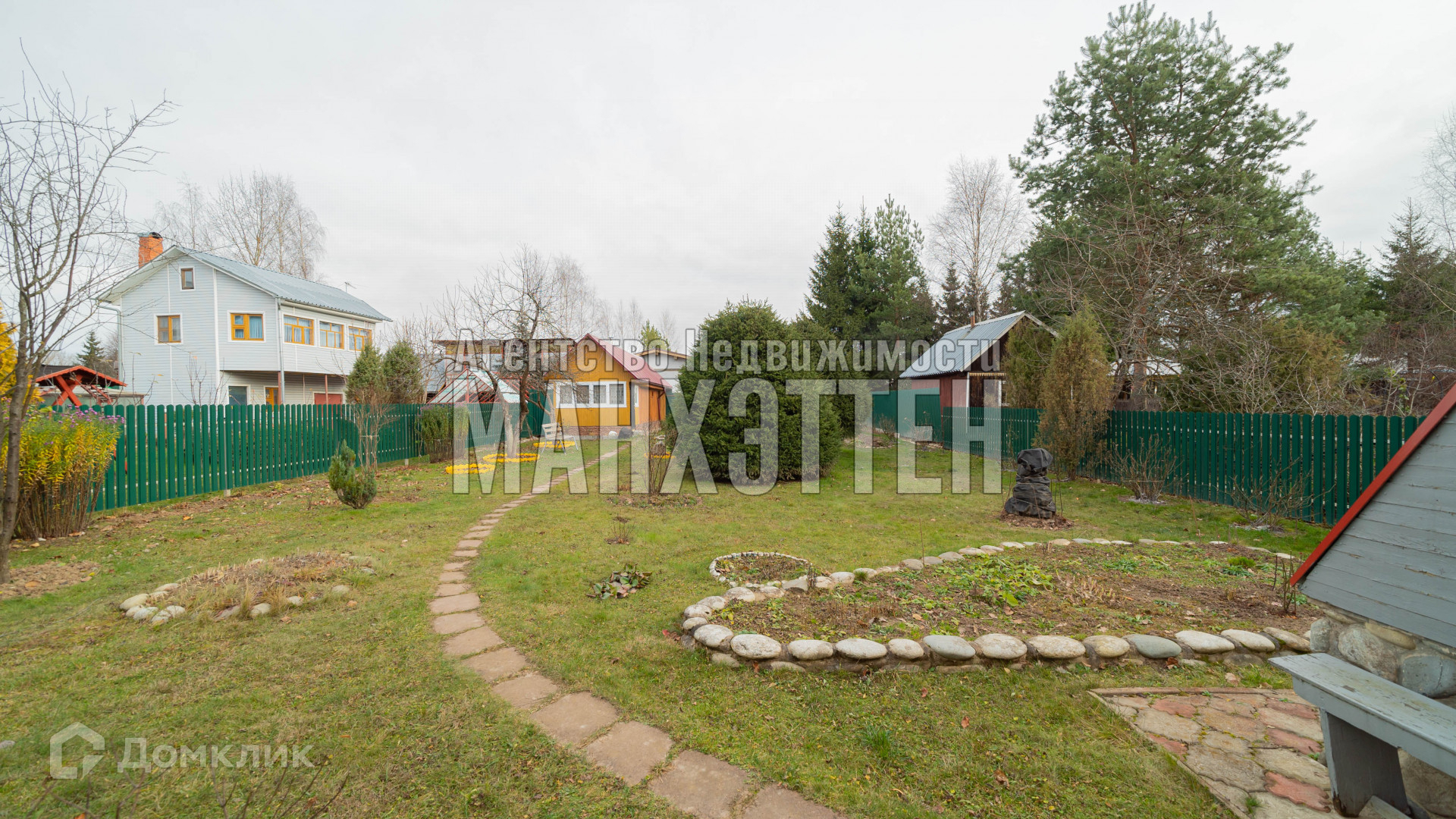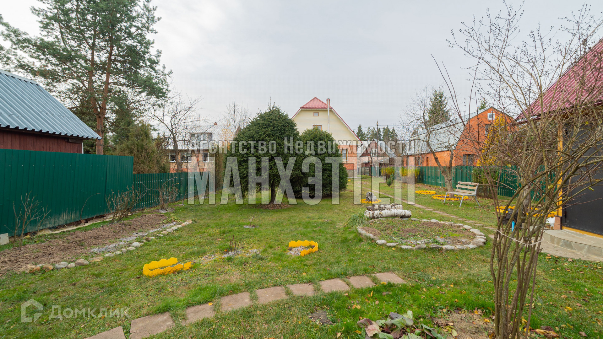 по всей территории сделаны дорожки и засеян газон, растут плодовые деревья и кустарники.