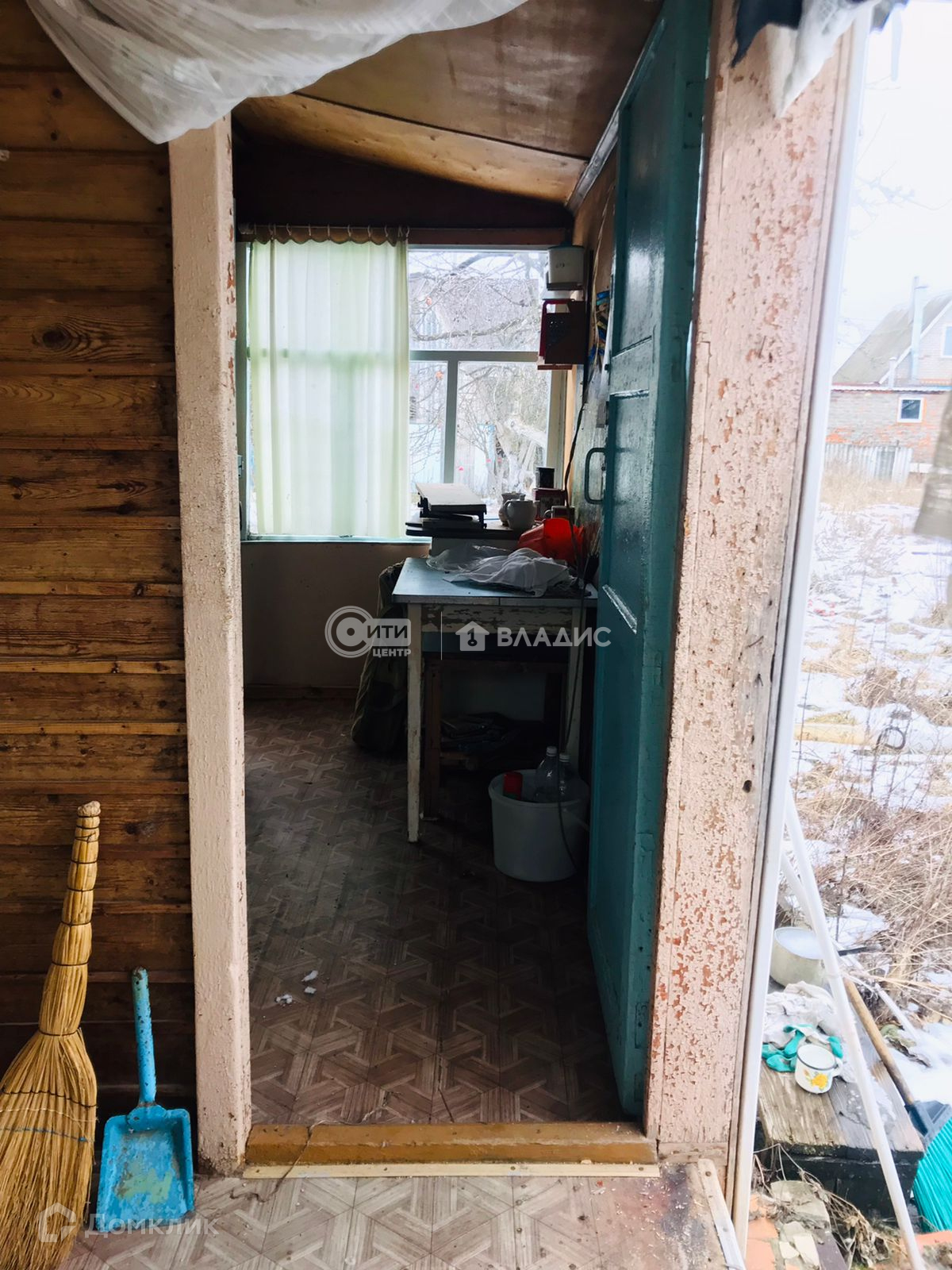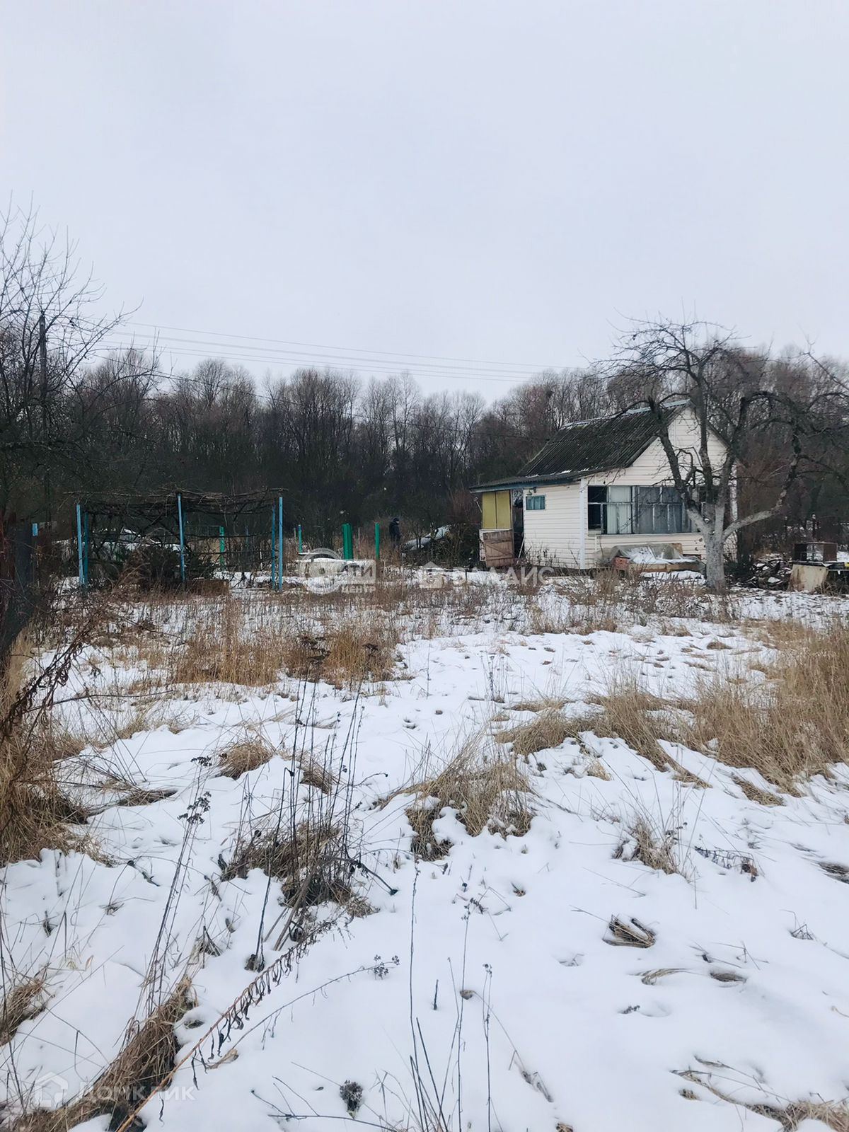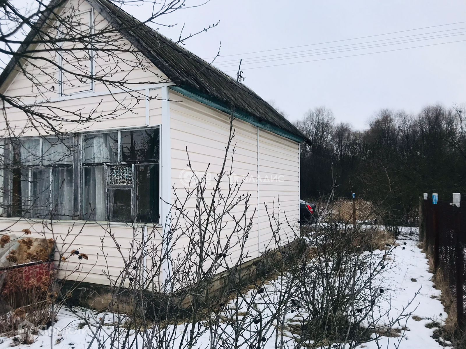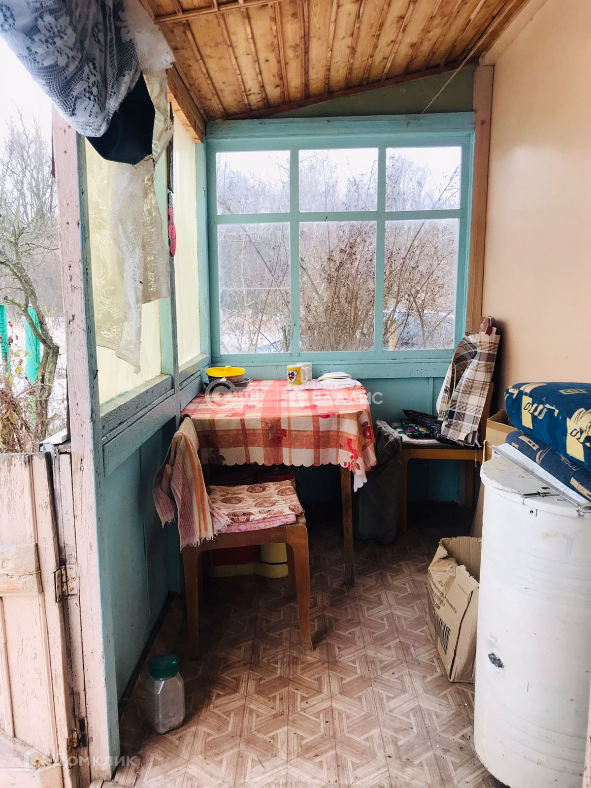 Щитовой дом,обшитый сайдингом,с крыльцом(верандой).Внутри есть кухонная зона, спальня и место для хранения вещей.