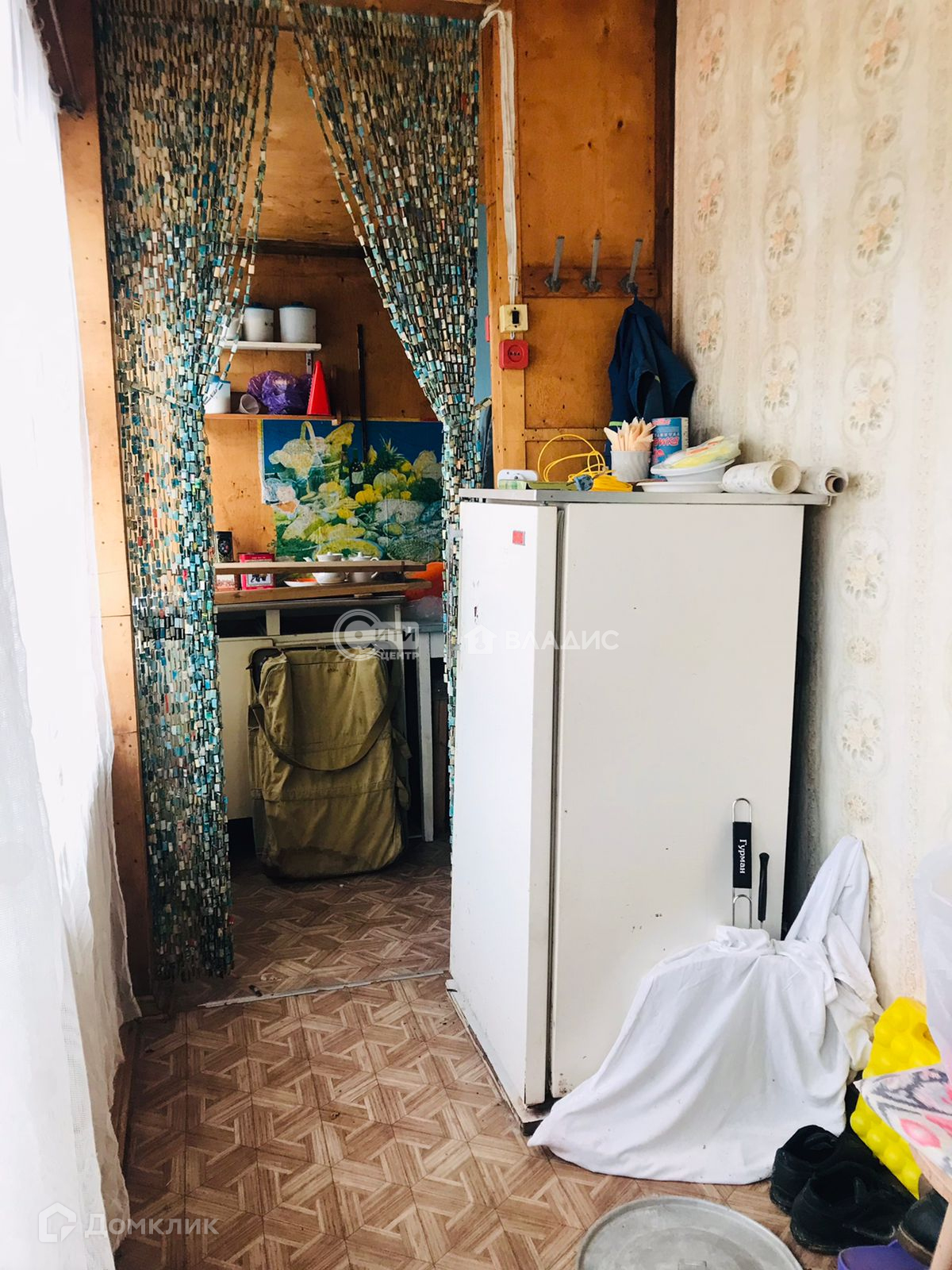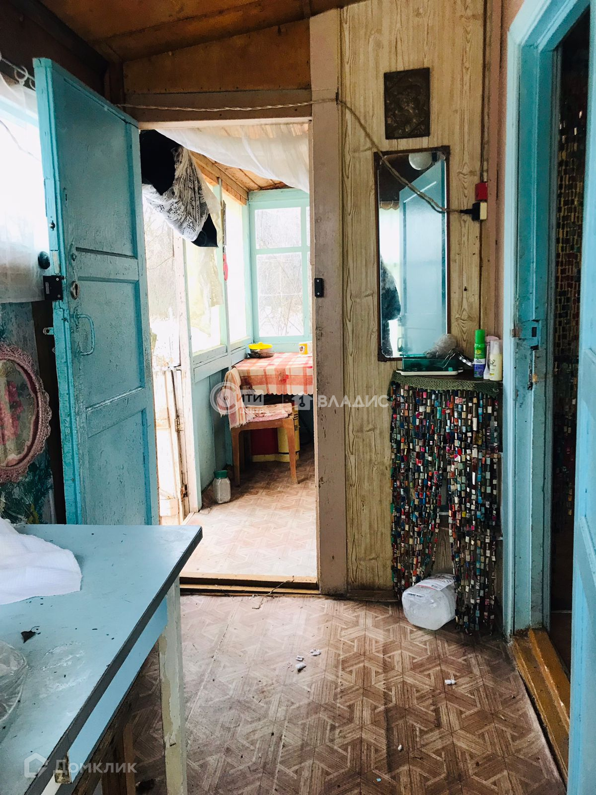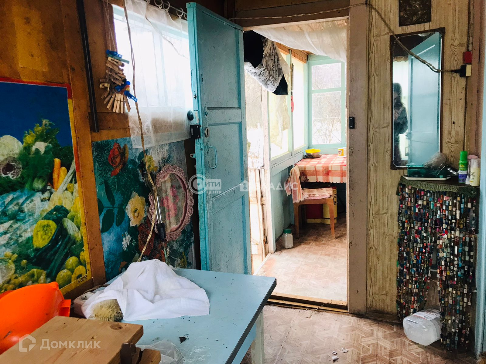 Щитовой дом,обшитый сайдингом,с крыльцом(верандой).Внутри есть кухонная зона, спальня и место для хранения вещей.
