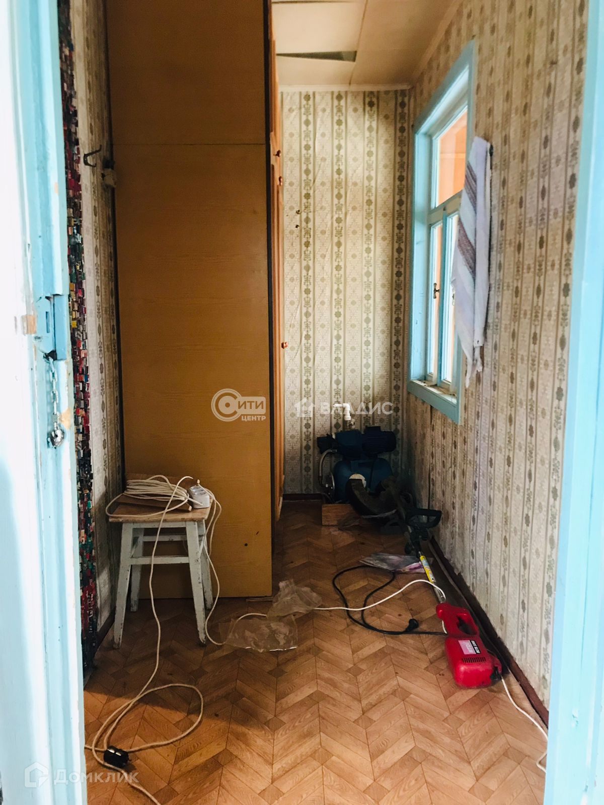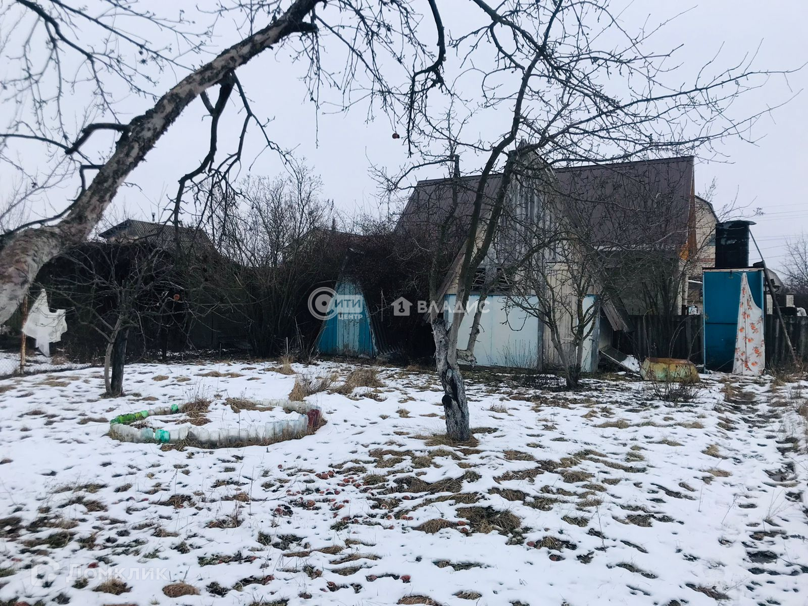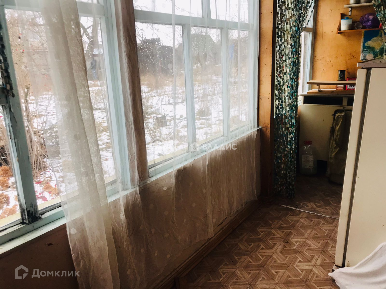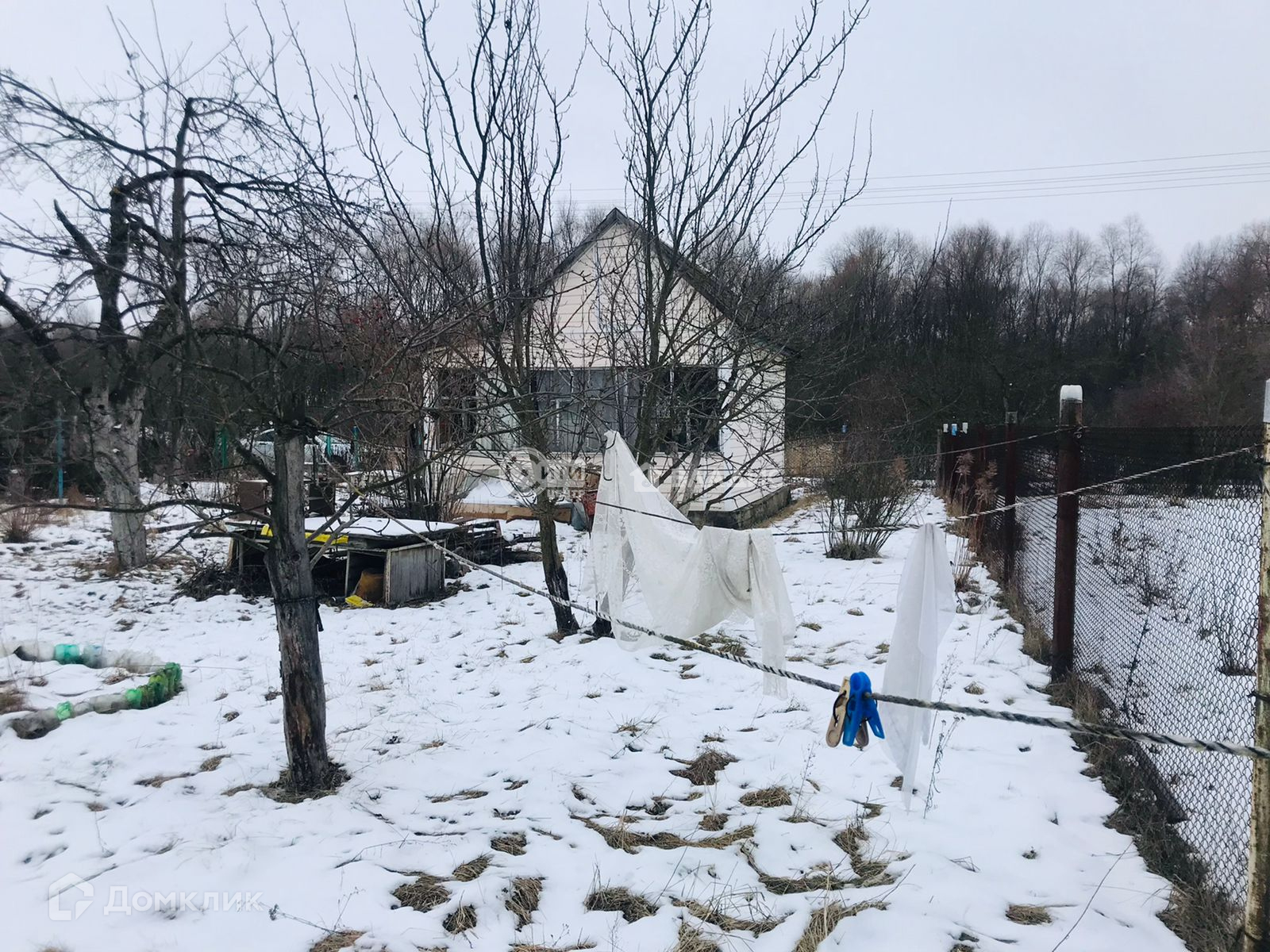 Щитовой дом,обшитый сайдингом,с крыльцом(верандой).Внутри есть кухонная зона, спальня и место для хранения вещей.