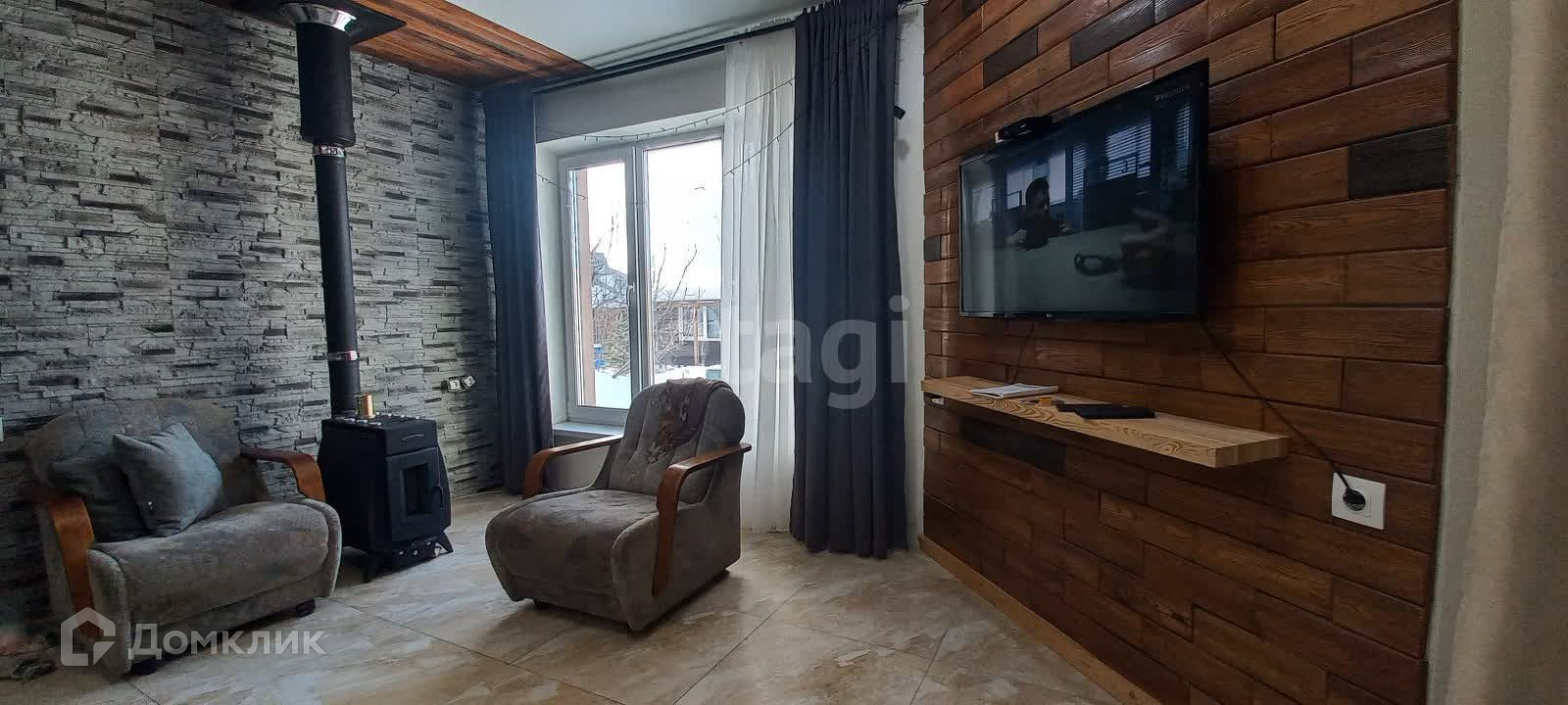 Стильная отделка интерьера камнем, керамогранитом и элементами ручной работы из лиственницы.