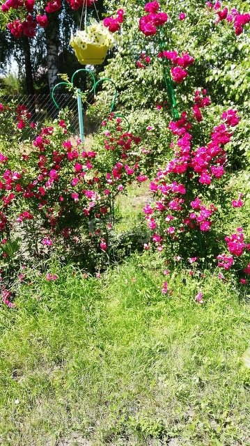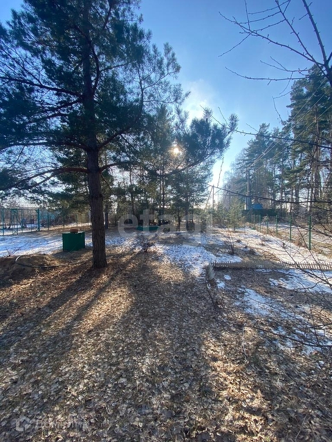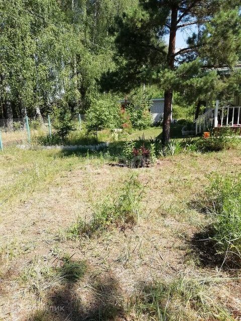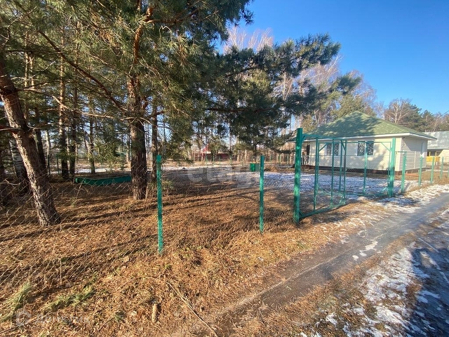Участок ухожен,на территории есть сосны, огорожен забором из сетки рабицы.