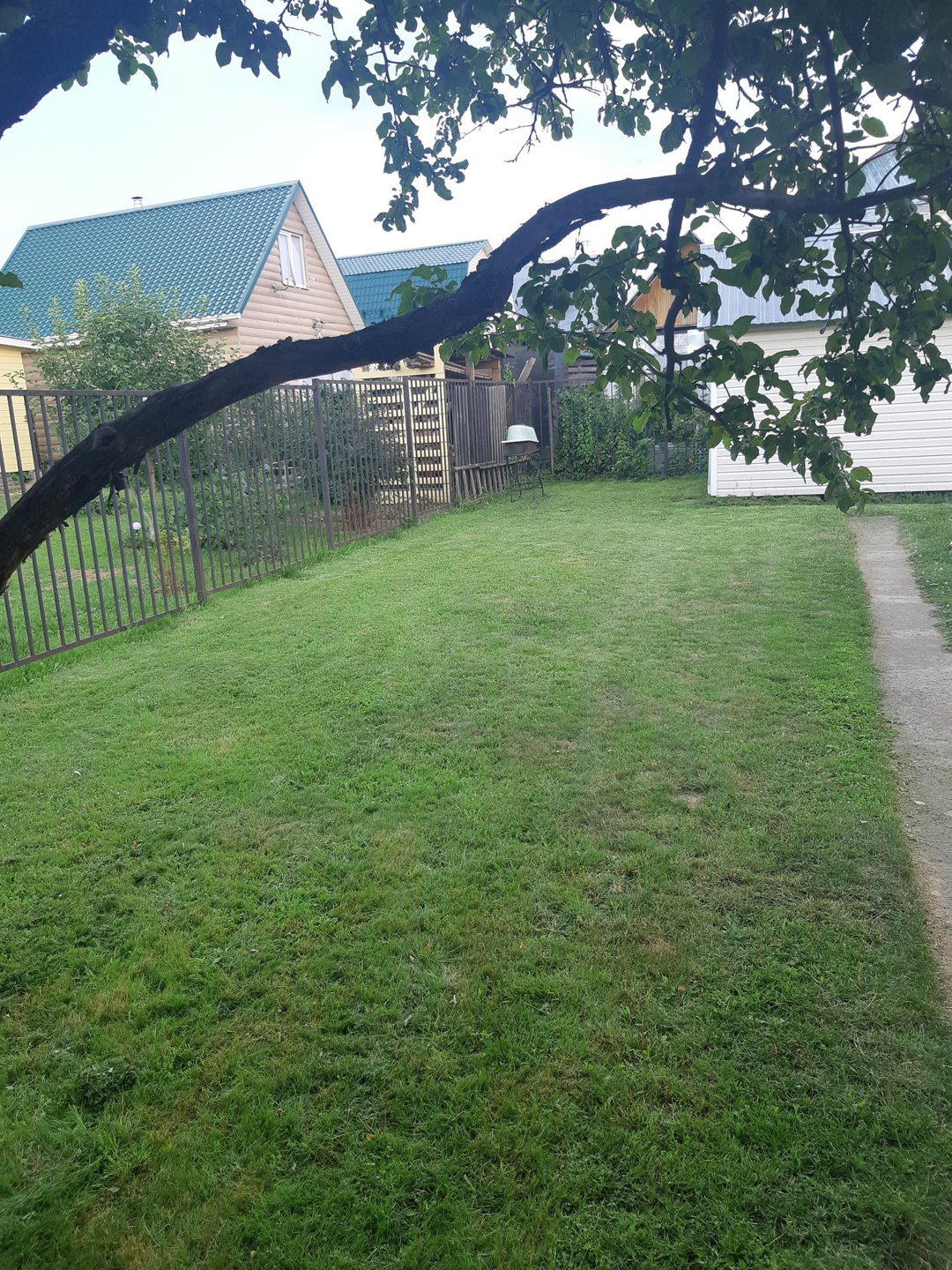 Участок правильной прямоугольной формы, огорожен, плодоносящий сад и газон.