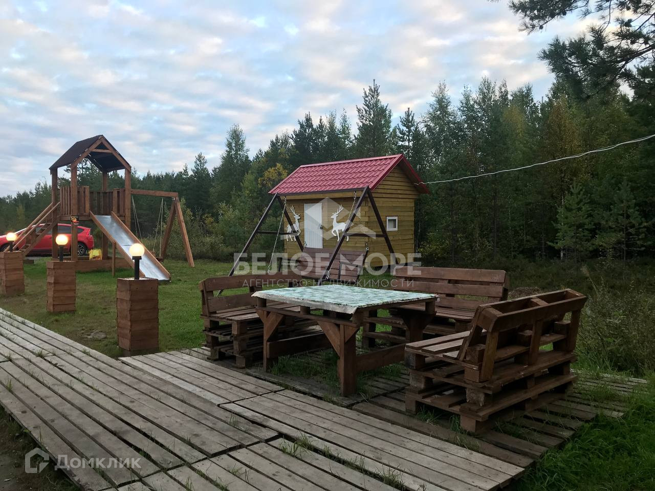 На участке расположены следующие постройки: Дом, баня, детская площадка, качели, крытая мангальная зона и техническая постройка