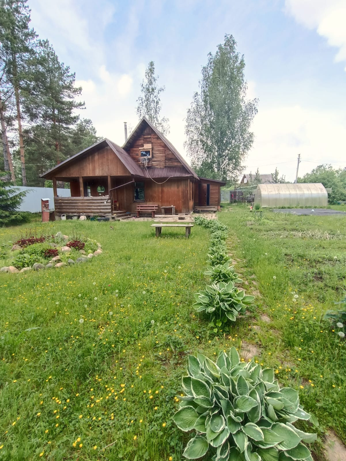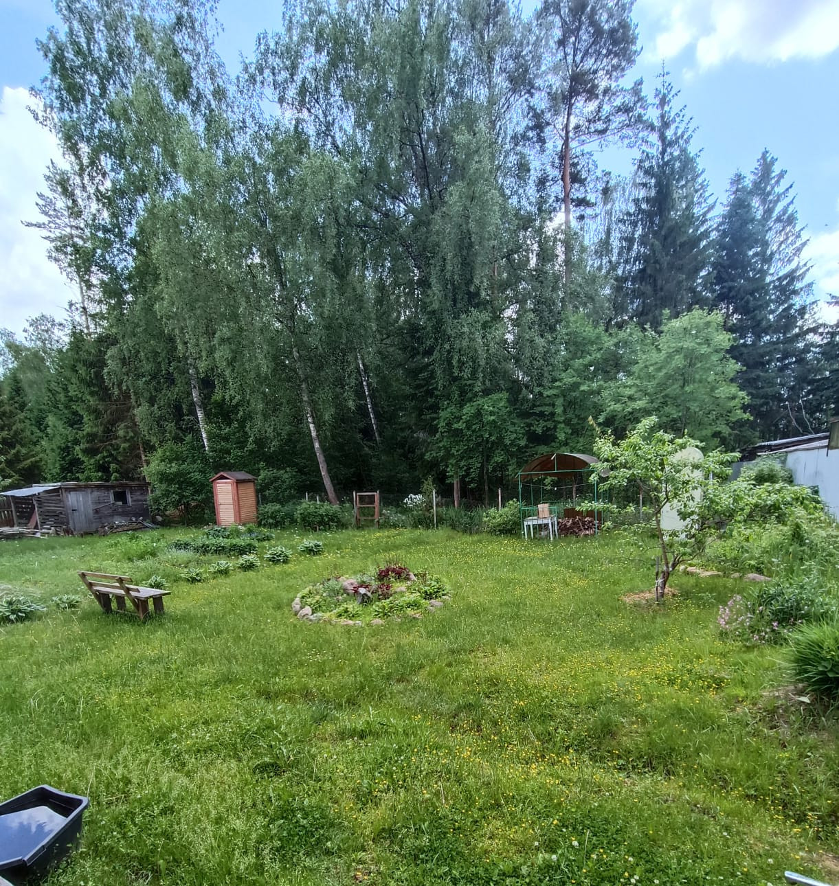 Участок 10 соток с теплицей, плодовыми деревьями и клумбами. Газ по границе участка, колодец.