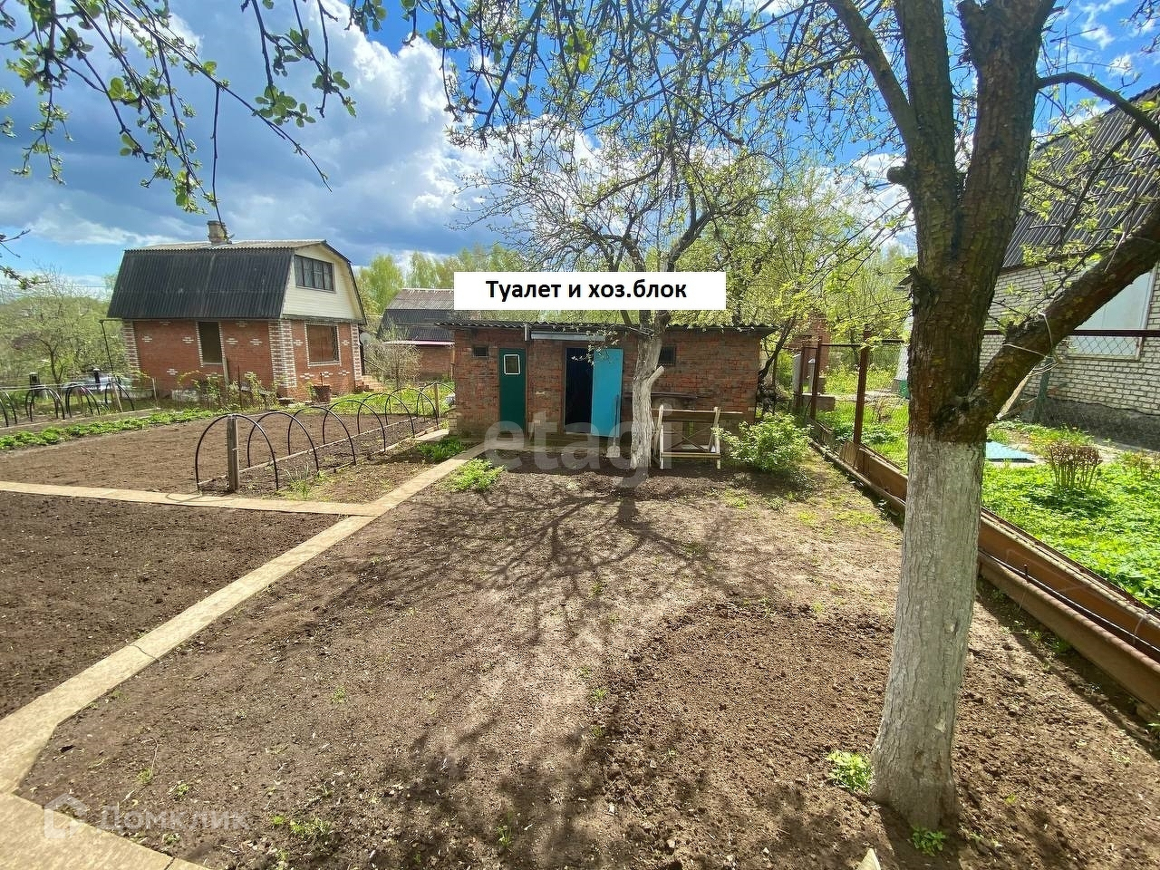 На участке специальная ёмкость для компоста, хоз.блок с дровами, кирпичный туалет.