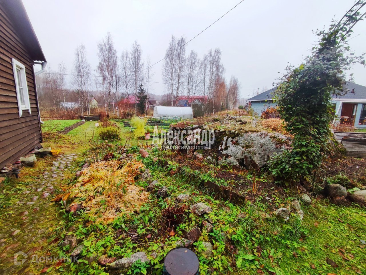 Сам участок ровный, сухой и разработанный. Он обрамлен живописным камнем на краю. На участке также установлена современная теплица.