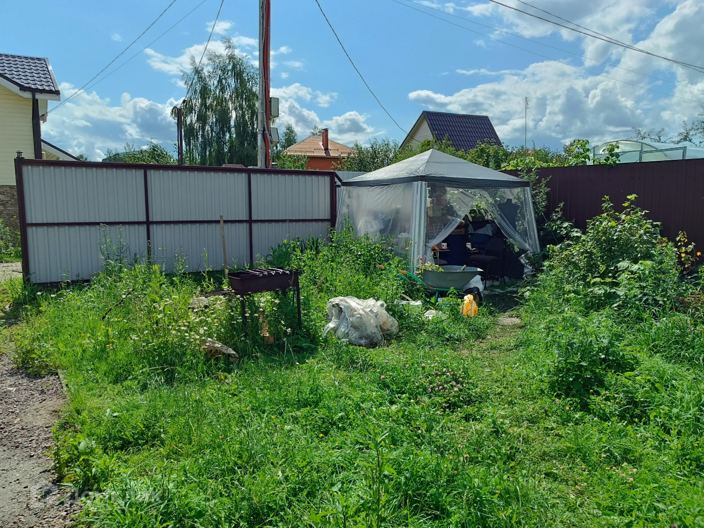 Участок правильной прямоугольной формы, благоустроен. Посажены плодовые деревья и кустарники. На участке имеется хозблок и беседка. Участок со всех сторон огорожен забором из профлиста с откатными воротами и калиткой. Организована парковка на 4 автомобиля. СНТ расположено в тихом месте, рядом с лесом. На территории есть пруд. Территория СНТ охраняется, въезд через автоматические откатные ворота.