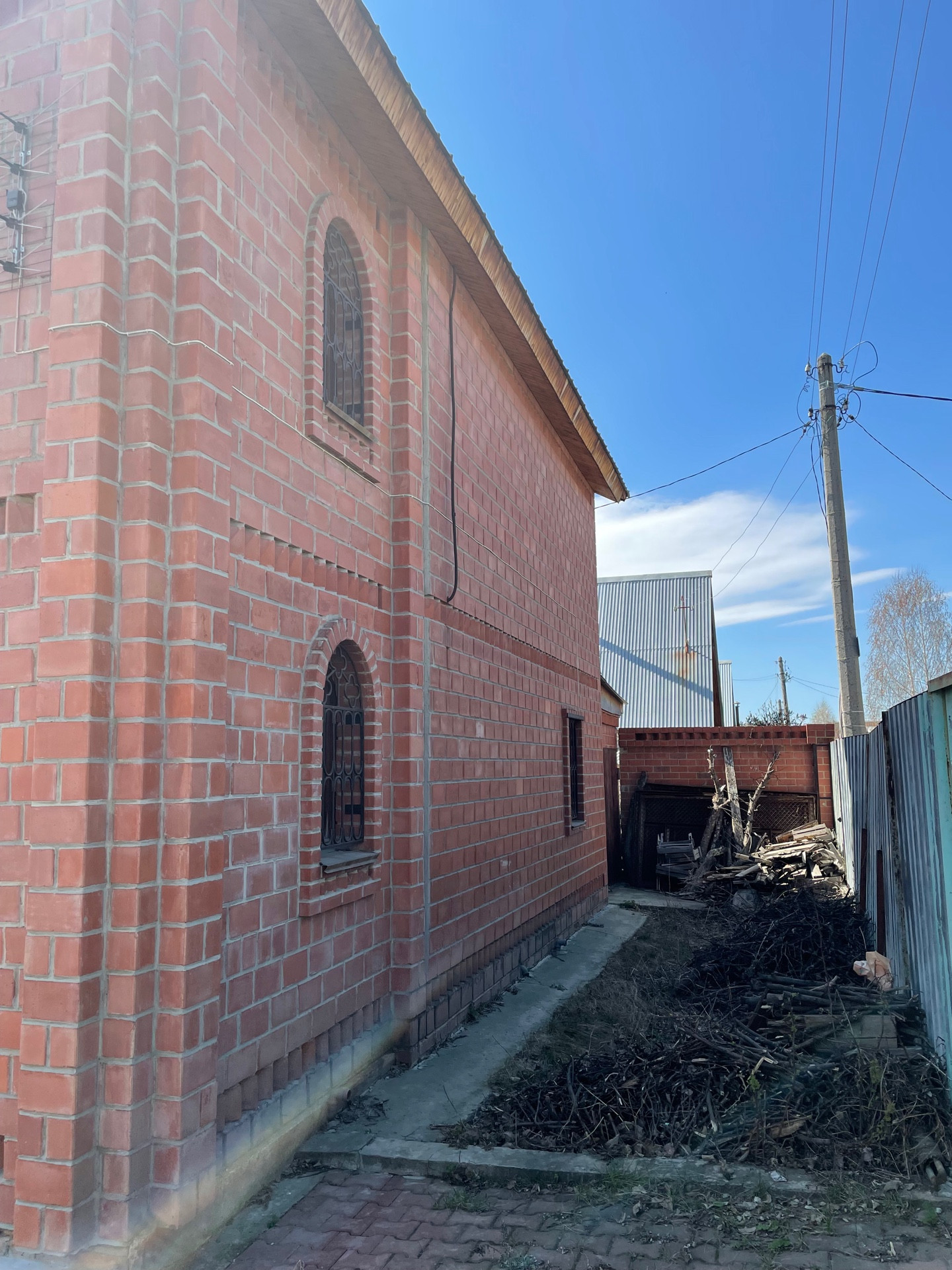 Дом стоит на ленточном фундаменте. Стены шлакблок. Окна на первом этаже пластиковые, на втором деревянные. На окнах стоят решетки.