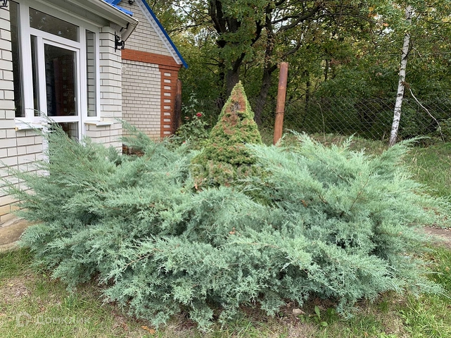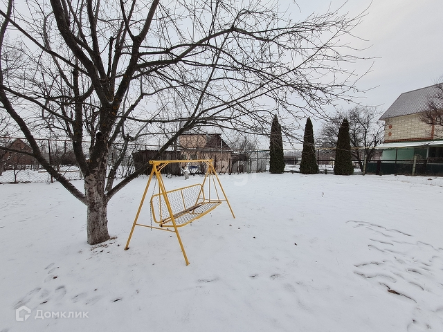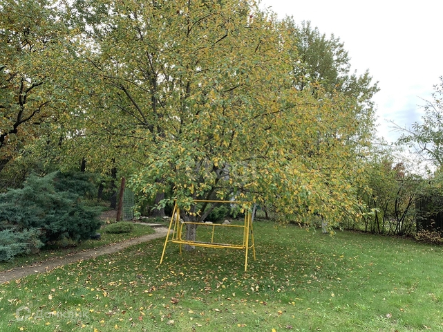 Ухоженная, уютная зона отдыха с качелями на которых приятно провести время под тенью деревьев, среди зеленого газона и красивых можжевельников.