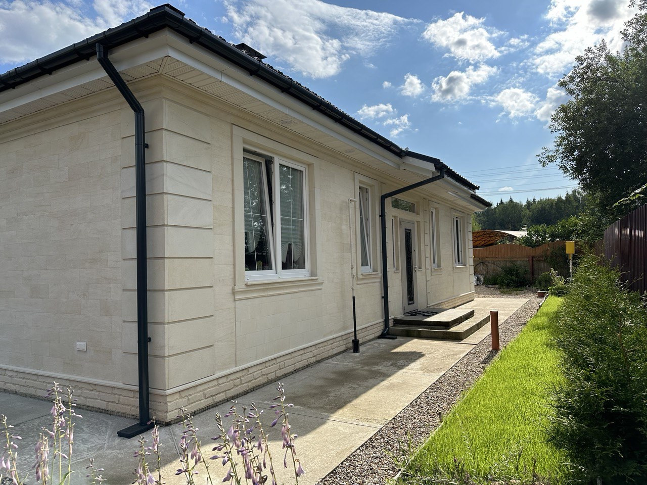 Фундамент тёплая плита, отмостка, стены пеноблок, утеплитель Пеноплекс, отделка дагестанский камень. По периметру дома дренаж, есть ливневая система, которая уходит сразу в дренаж.