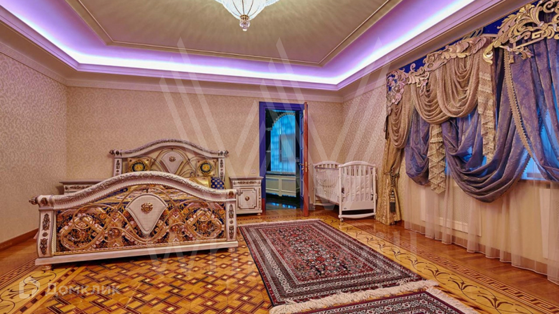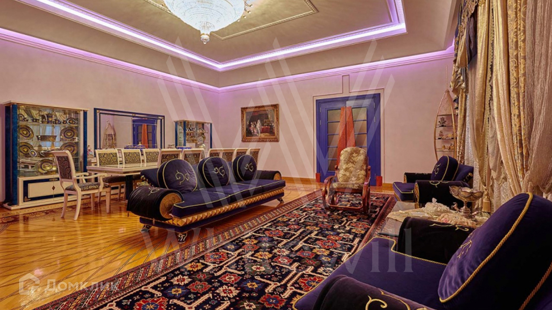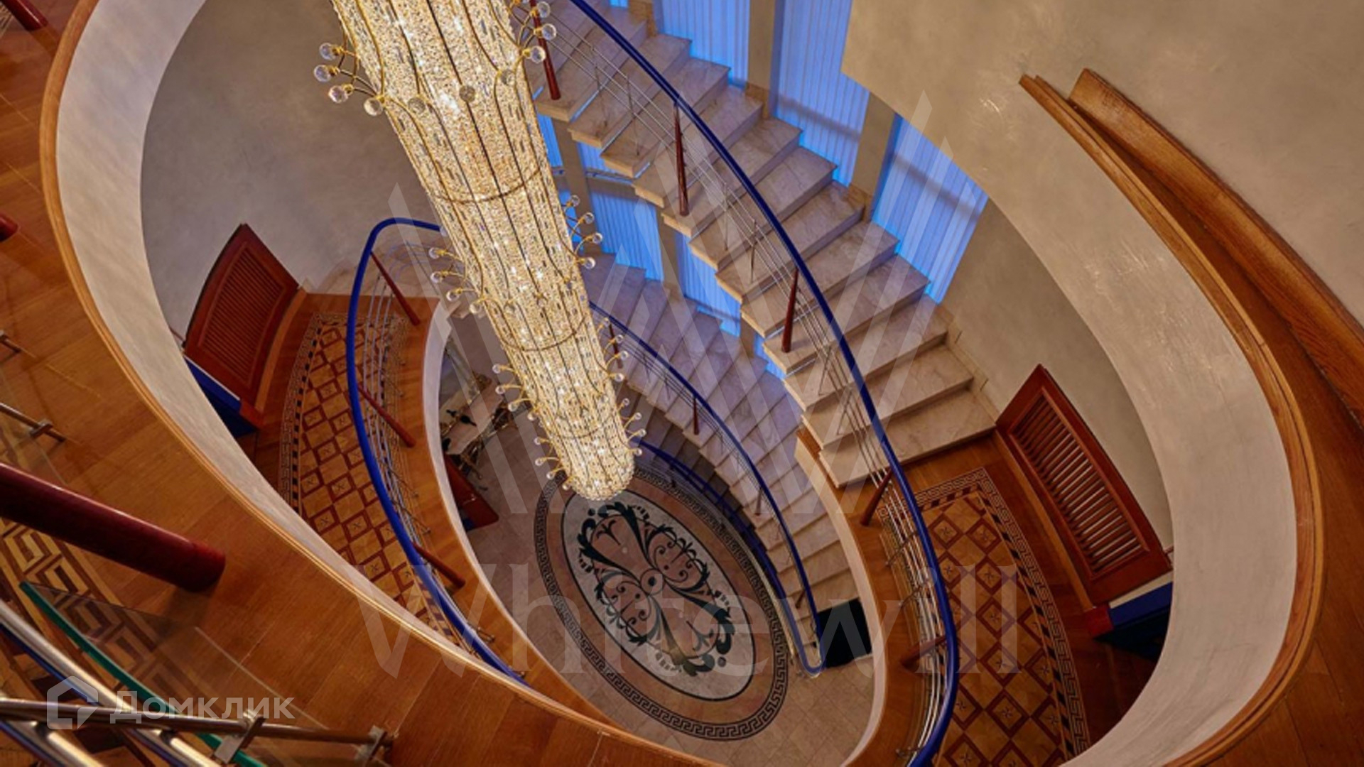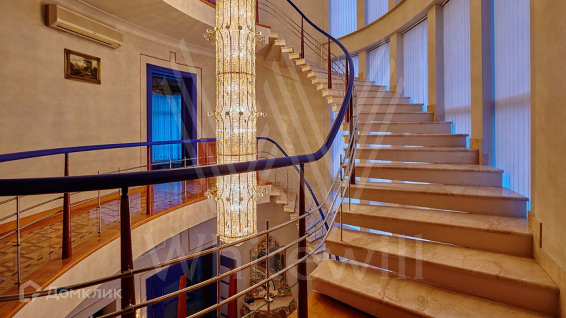 ID 8 602. Подушкино. Представительная загородная резиденция площадью 800 м² с бассейном расположена на участке 14 соток. Фасад выполнен в неоклассическом стиле в бежевых и голубых тонах, со второго этажа можно выйти на просторные террасы. Интерьер дома оформлен в синей, красной и золотой гамме. Пол с наборным паркетом декорирован коврами, окна — гардинами в барочном стиле. Парадная винтовая лестница с каскадной люстрой удивит гостей. В доме оборудована кухня и санузлы, комнаты полностью меблированы.