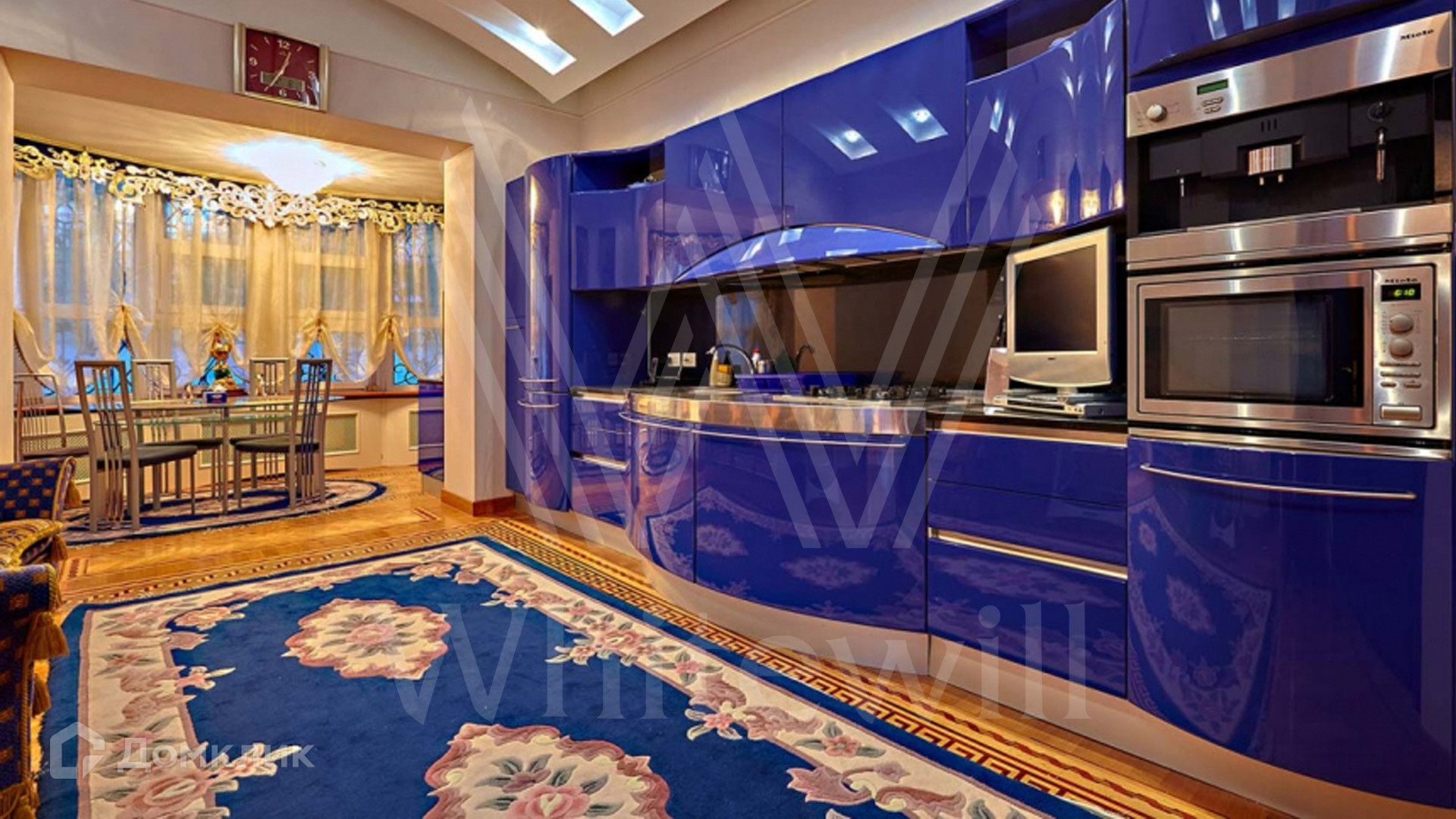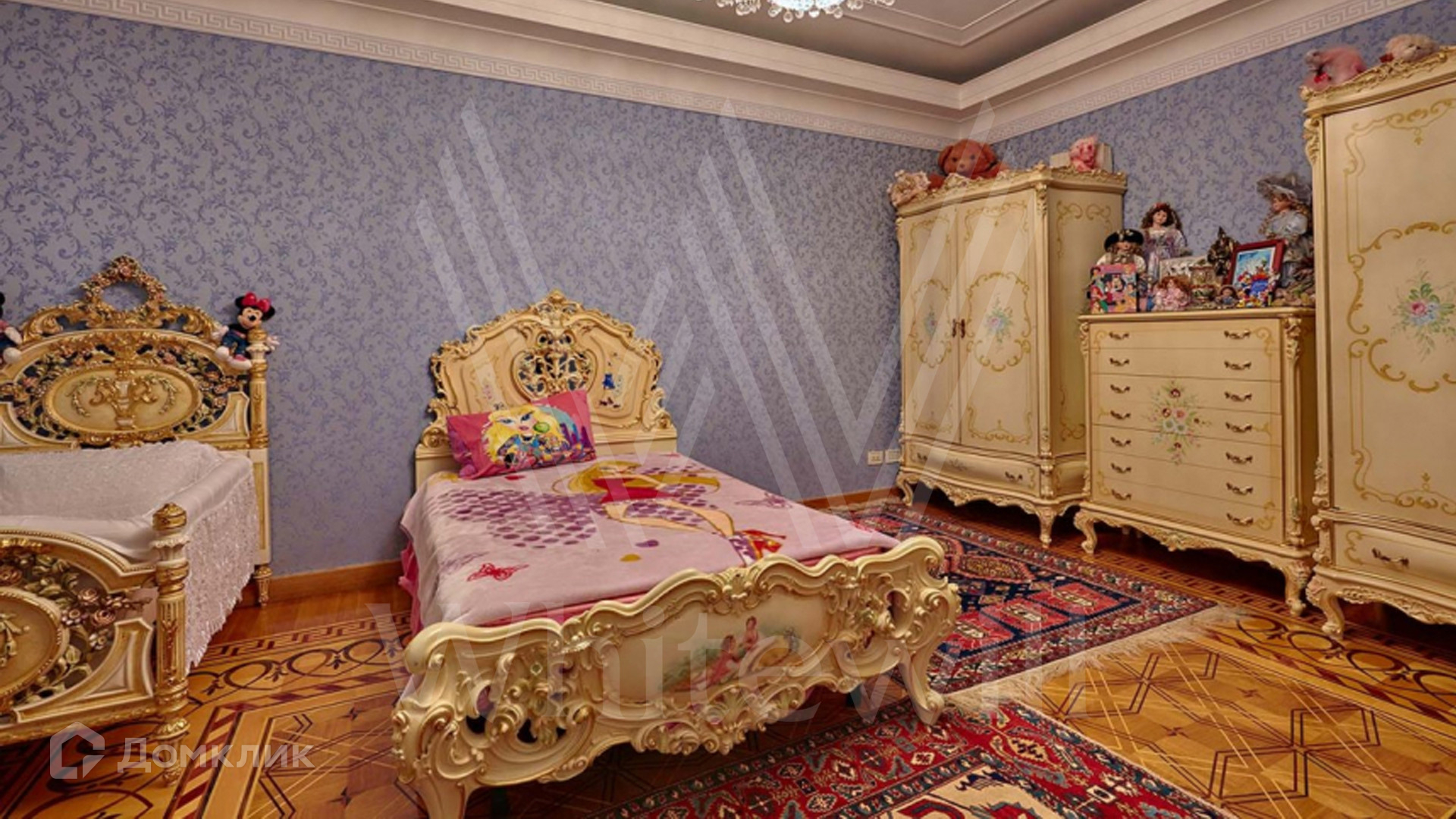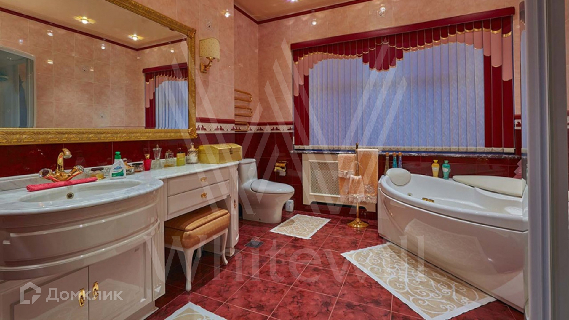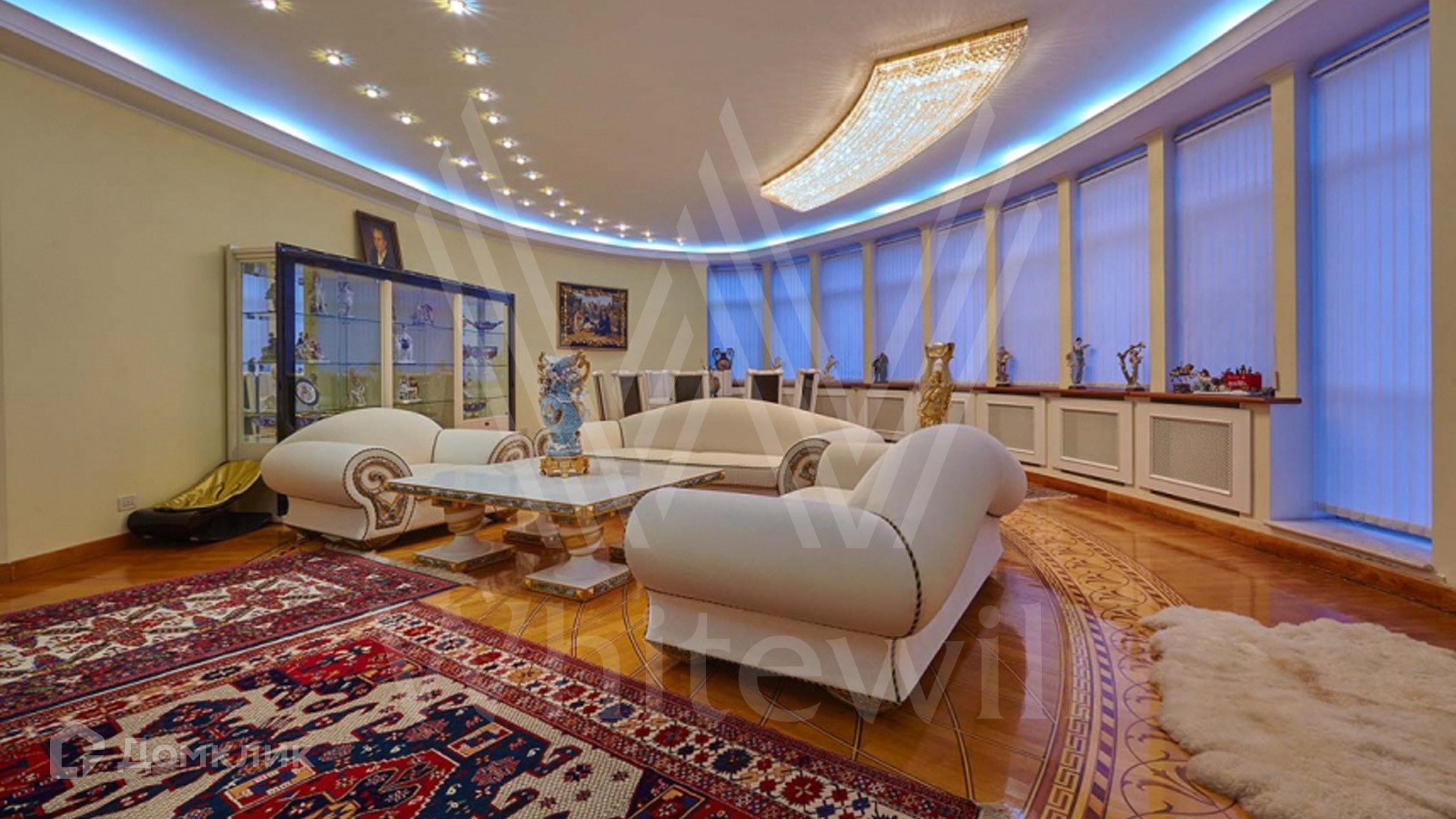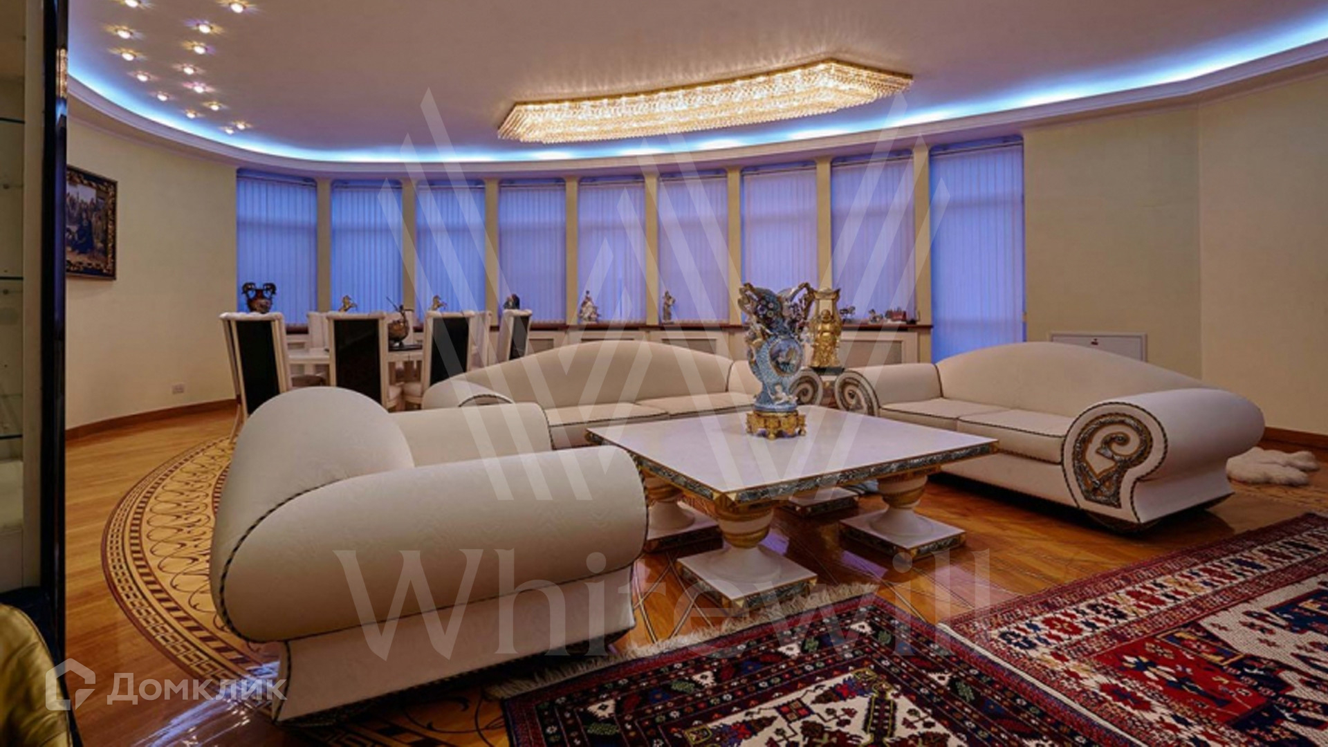 ID 8 602. Подушкино. Представительная загородная резиденция площадью 800 м² с бассейном расположена на участке 14 соток. Фасад выполнен в неоклассическом стиле в бежевых и голубых тонах, со второго этажа можно выйти на просторные террасы. Интерьер дома оформлен в синей, красной и золотой гамме. Пол с наборным паркетом декорирован коврами, окна — гардинами в барочном стиле. Парадная винтовая лестница с каскадной люстрой удивит гостей. В доме оборудована кухня и санузлы, комнаты полностью меблированы.
