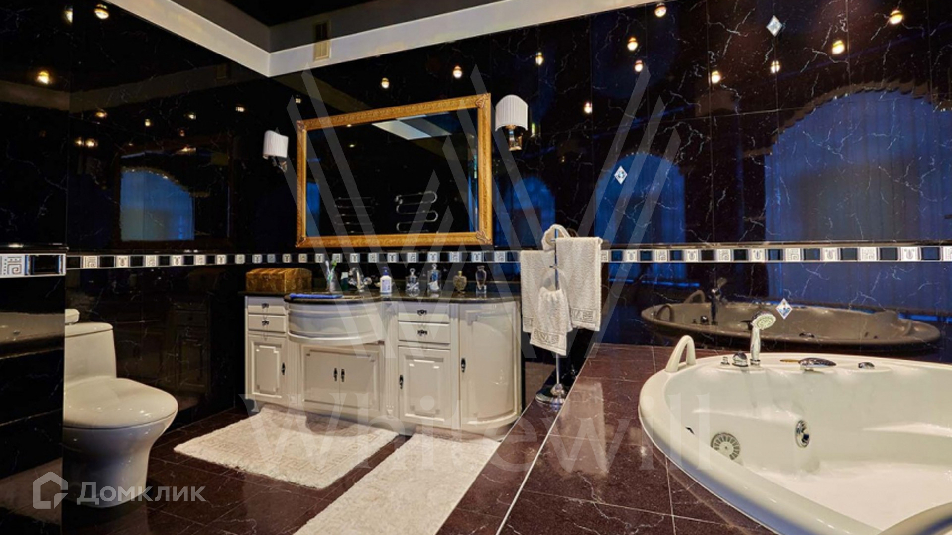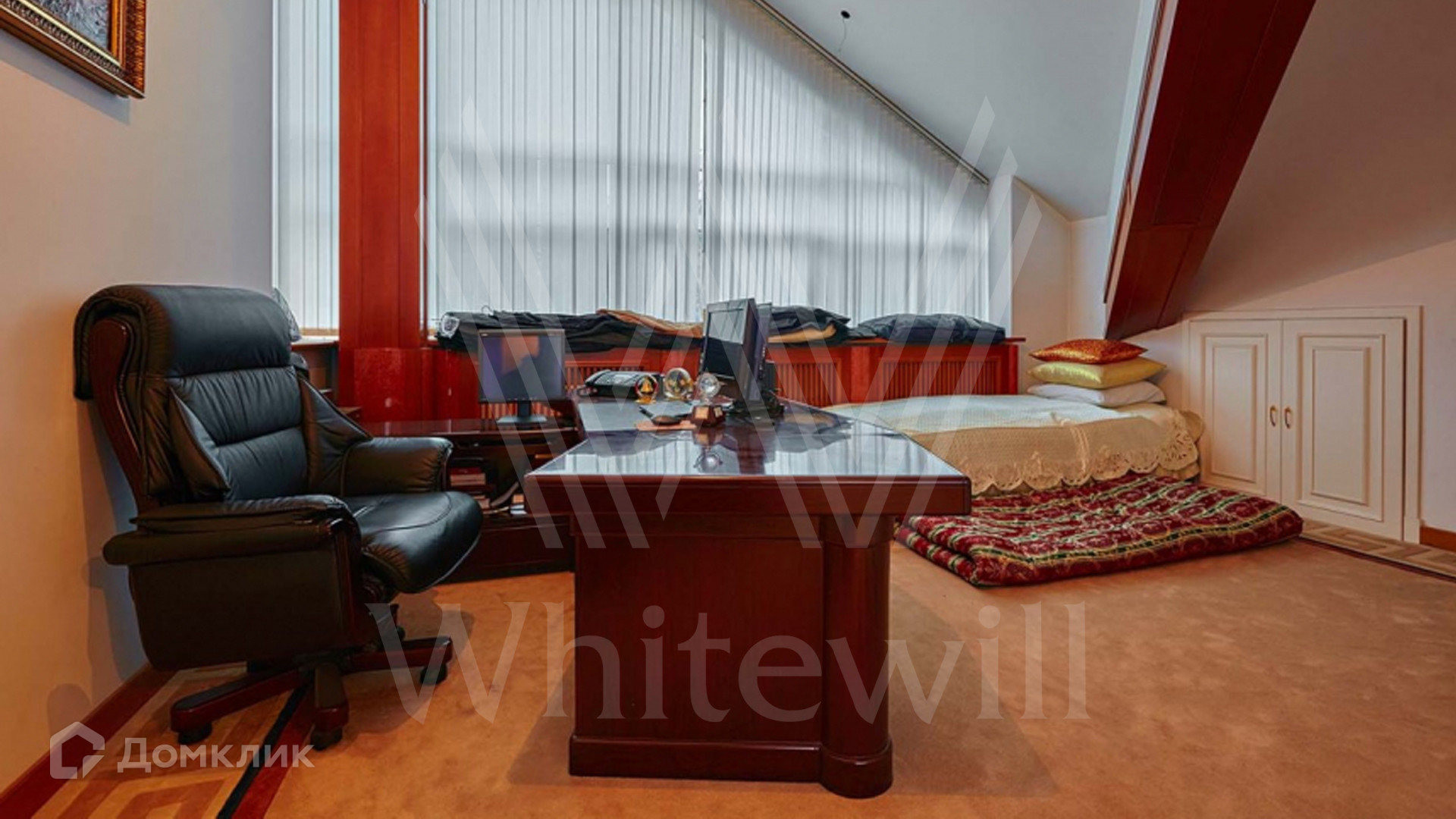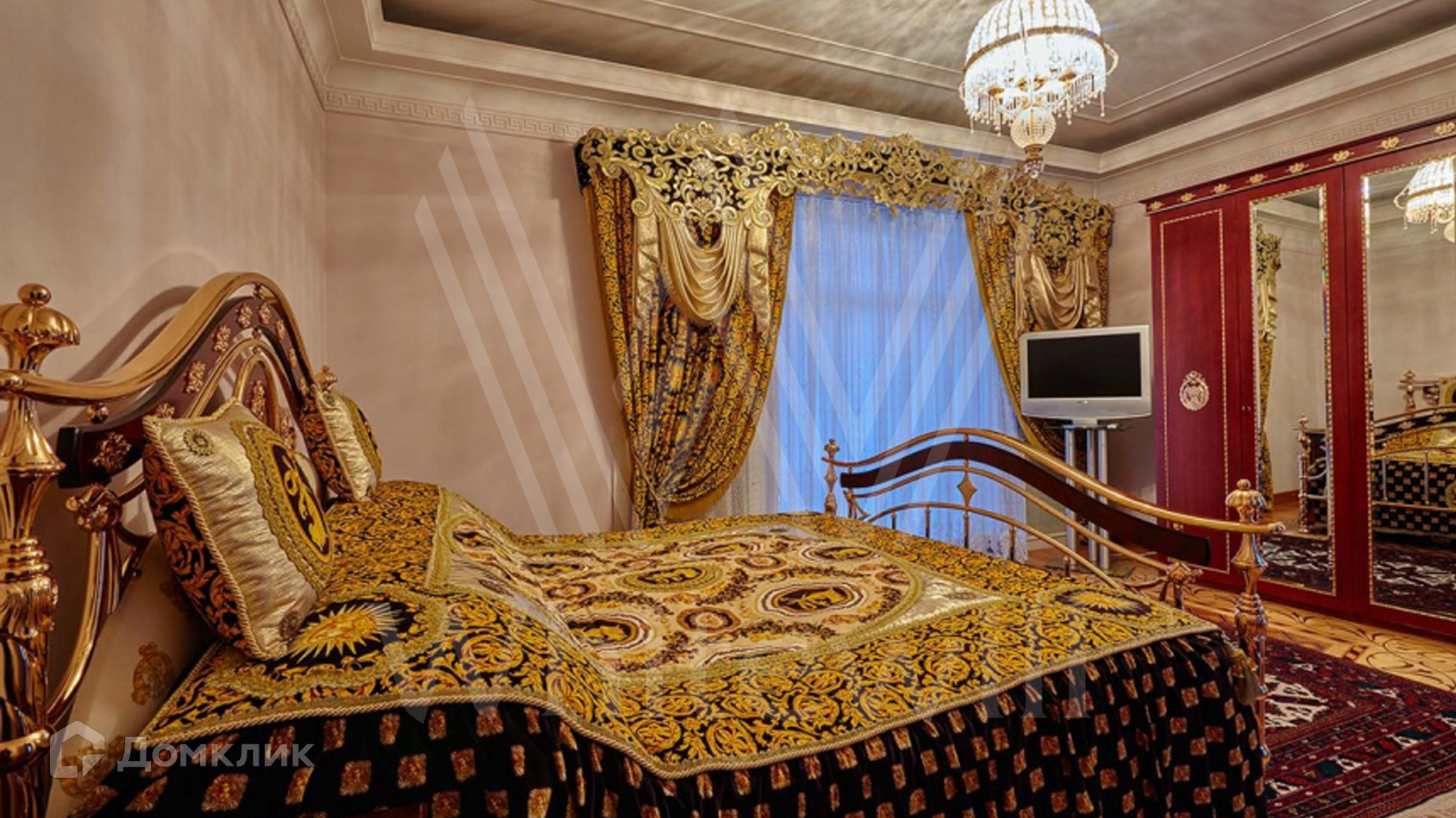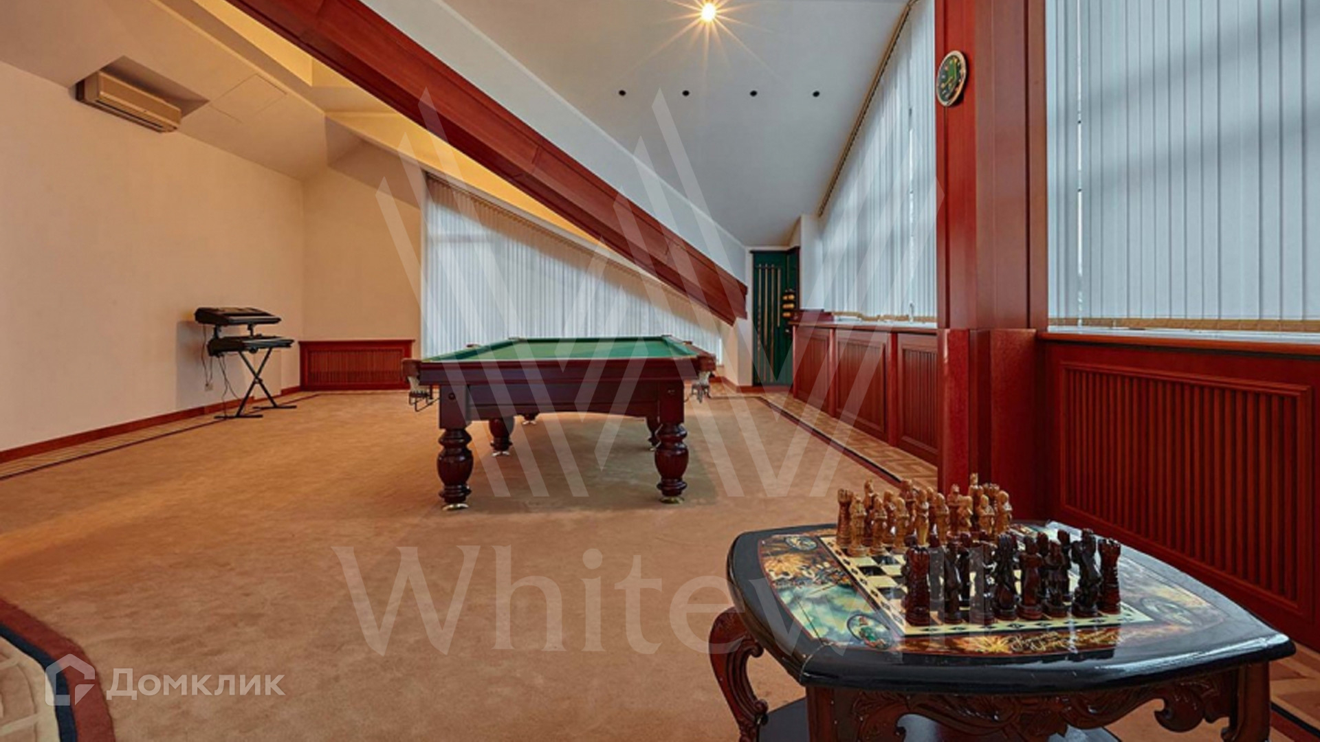 ID 8 602. Подушкино. Представительная загородная резиденция площадью 800 м² с бассейном расположена на участке 14 соток. Фасад выполнен в неоклассическом стиле в бежевых и голубых тонах, со второго этажа можно выйти на просторные террасы. Интерьер дома оформлен в синей, красной и золотой гамме. Пол с наборным паркетом декорирован коврами, окна — гардинами в барочном стиле. Парадная винтовая лестница с каскадной люстрой удивит гостей. В доме оборудована кухня и санузлы, комнаты полностью меблированы.