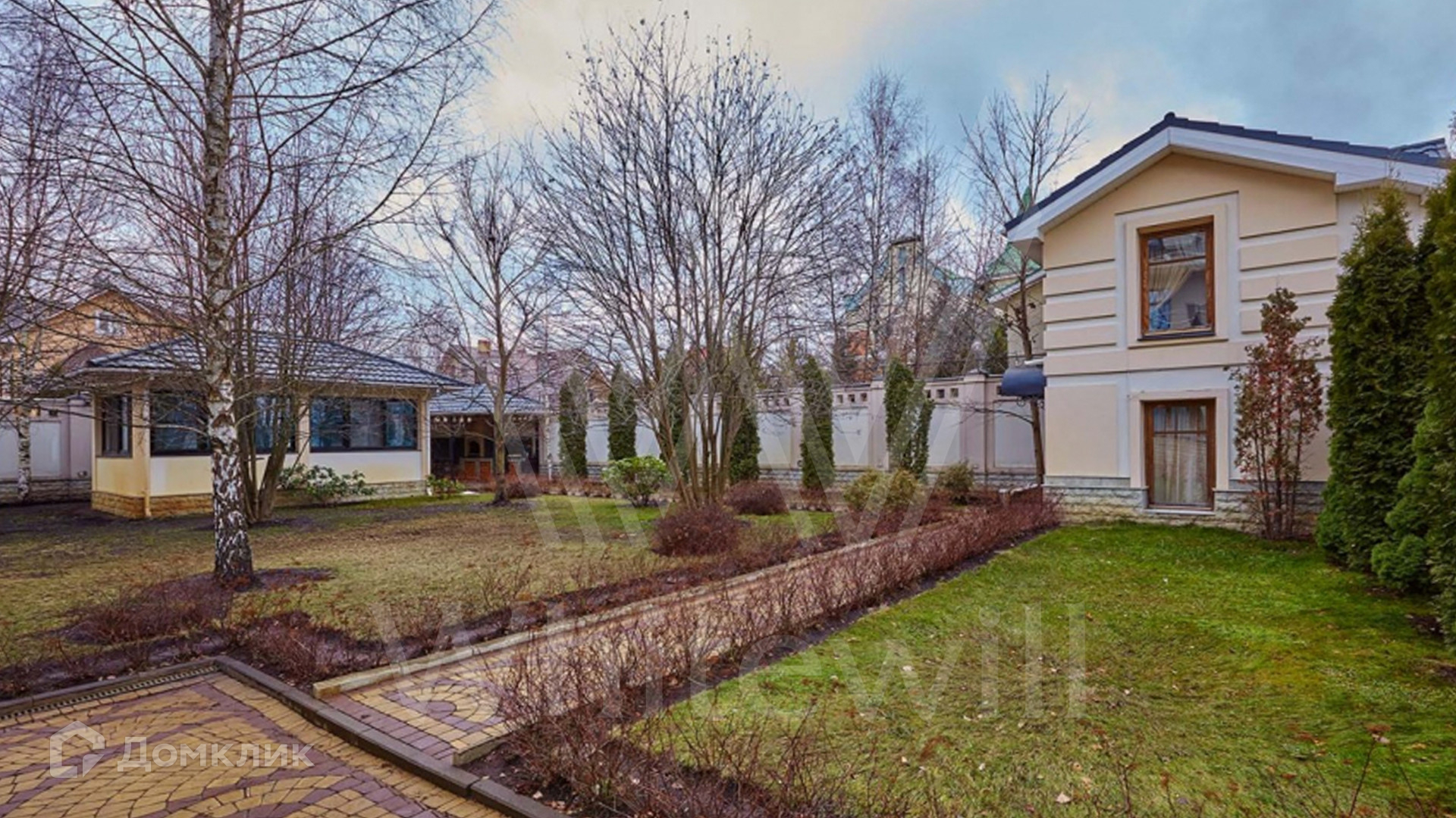 На участке около дома растут туи и декоративные деревья, дорожки вымостили плиткой. Для охраны построен отдельный небольшой дом, рядом — беседка и зона барбекю.