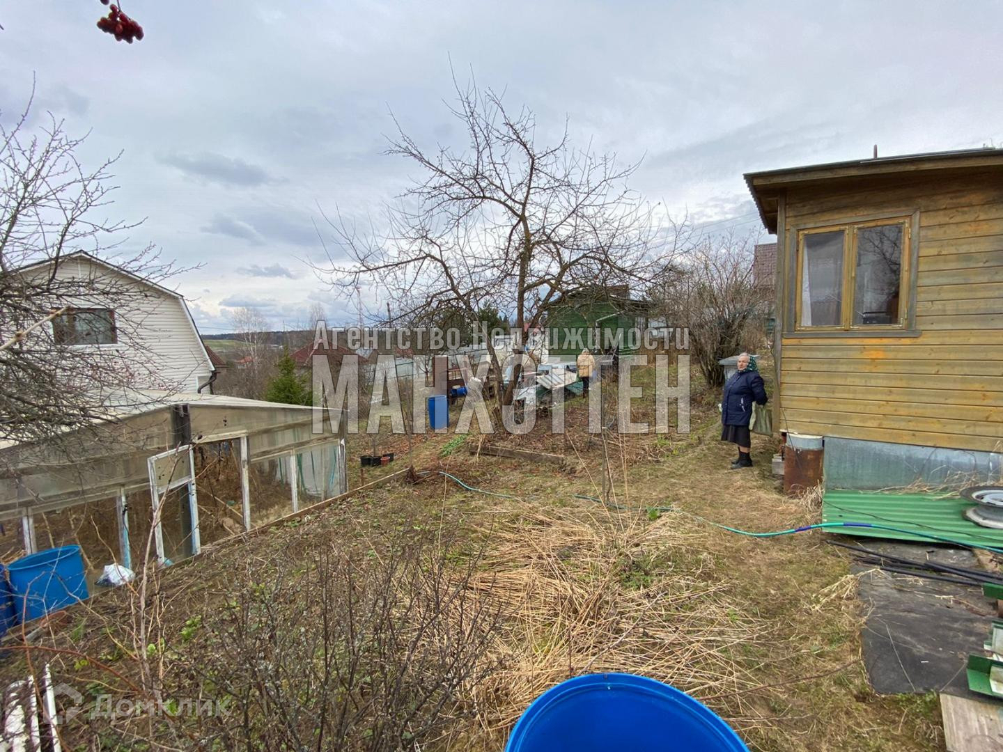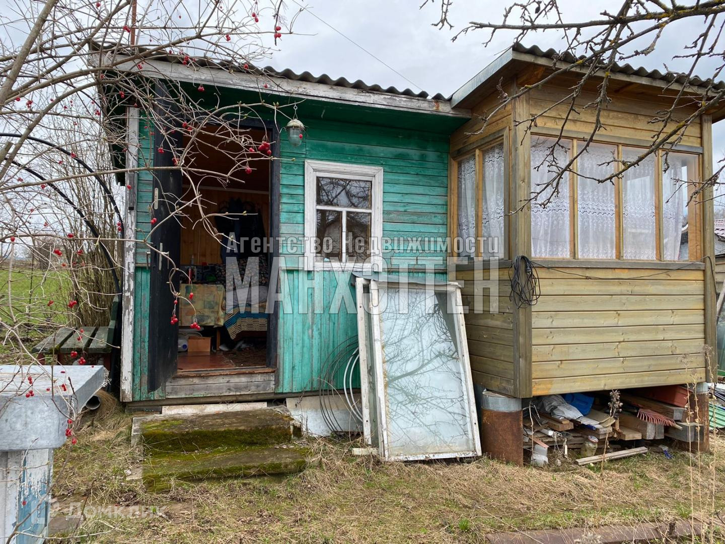 На участке расположены два летних домика, теплица, погреб