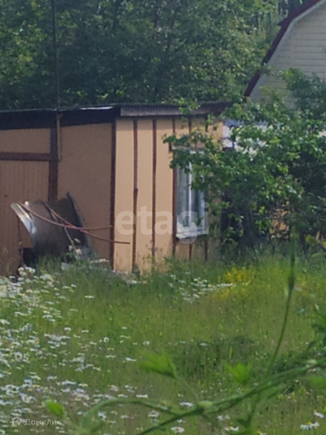 На участке домик 17 м. Обшит оргалитом. Окно пластик.