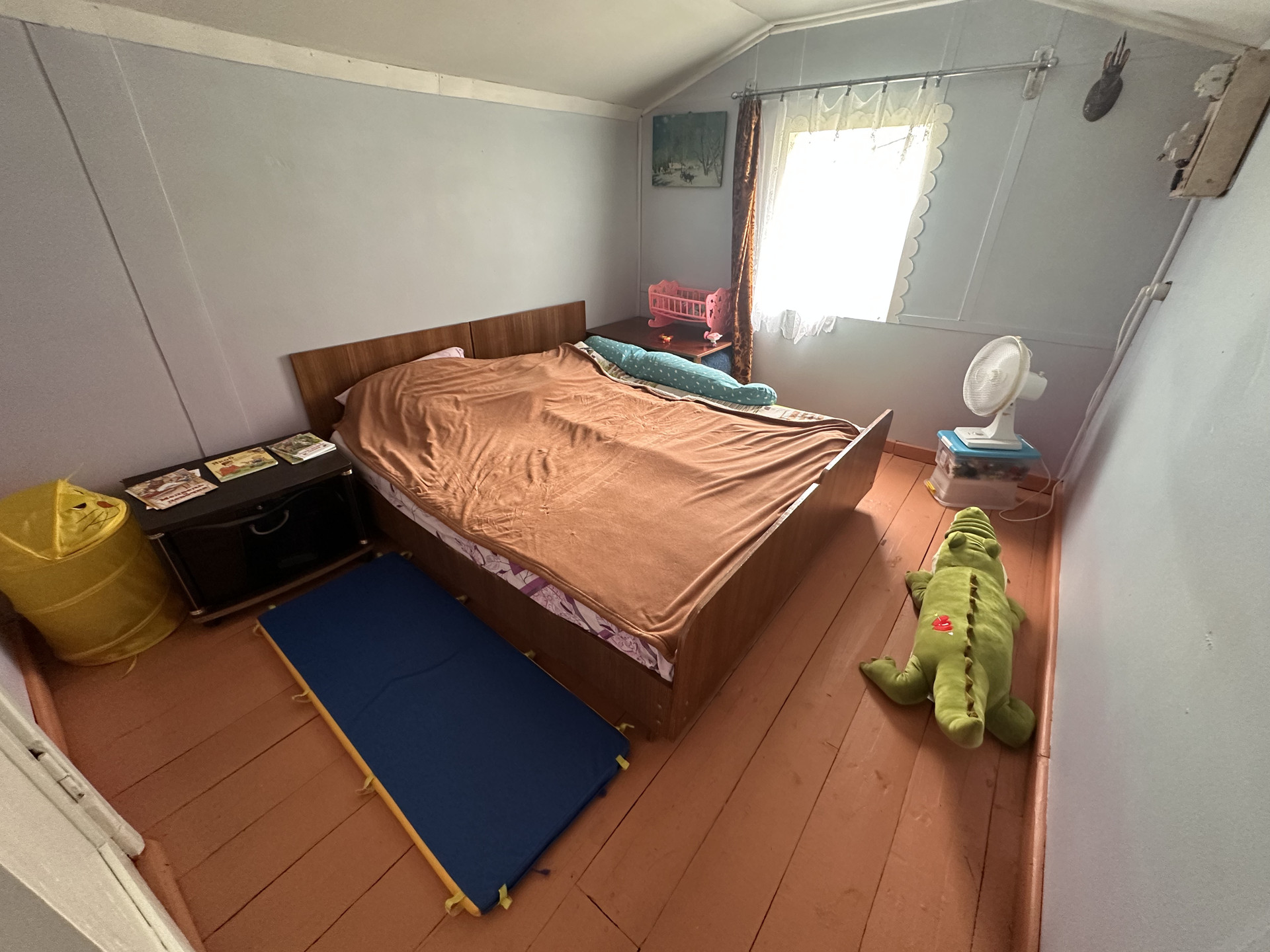 На первом этаже большая комната и кухня. На втором этаже две смежных комнаты, небольшая встроенная система хранения.