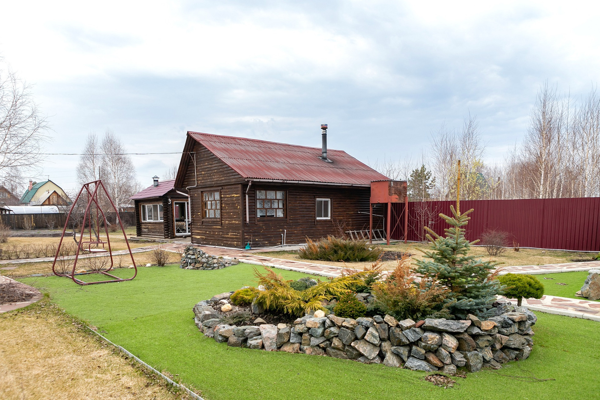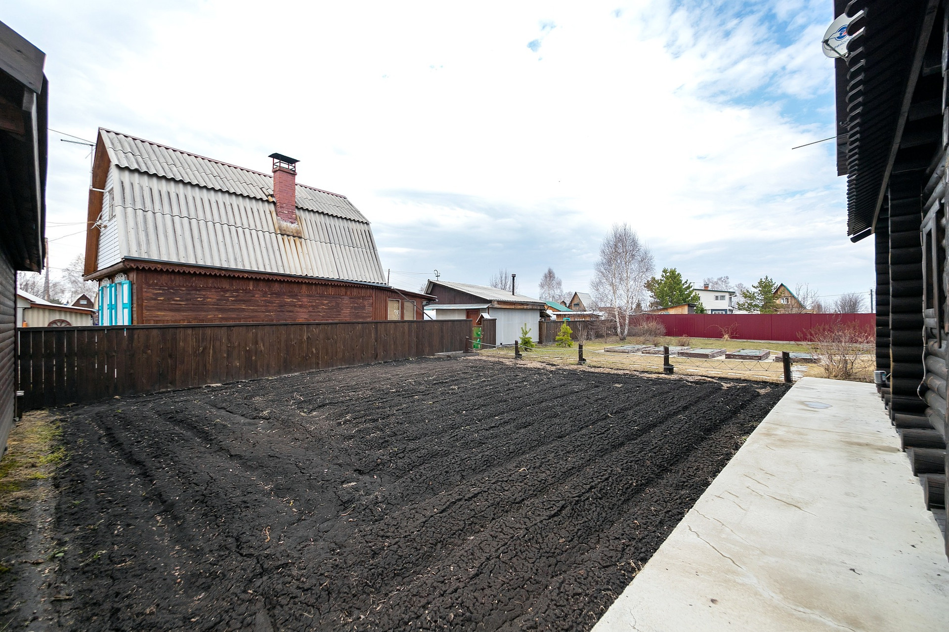 Ландшафтный дизайн участка, есть и место для декоративных элементов и для грядок небольшого огорода.. Отличная баня, закрытая беседка, основательная хозяйственная постройка, вместительный гараж на несколько машин... Вот очевидные выгоды этого варианта!