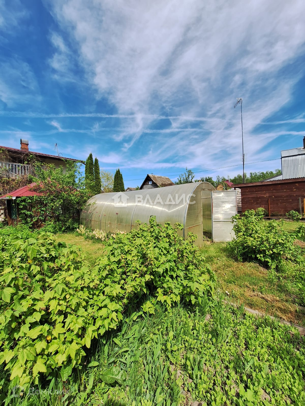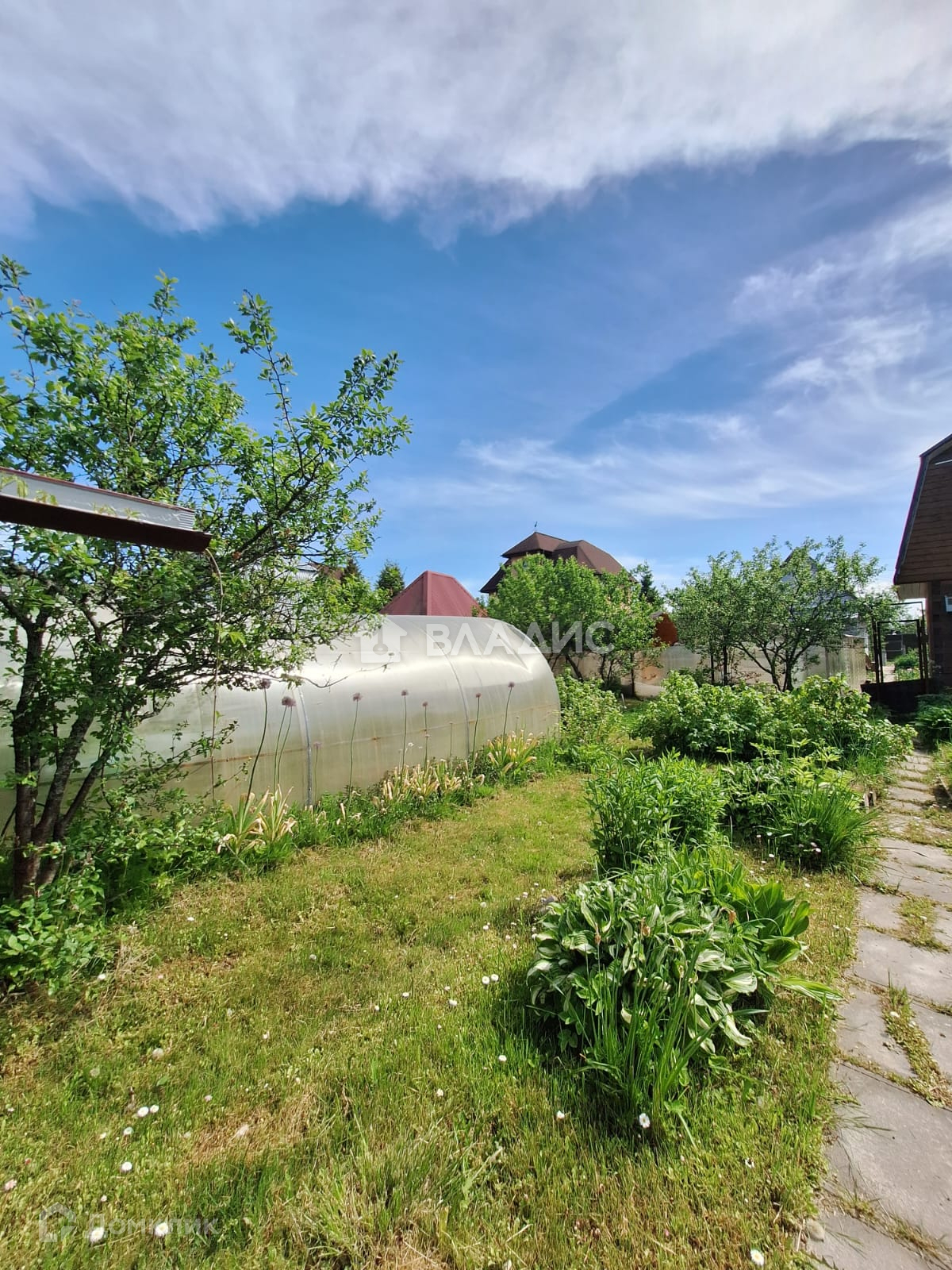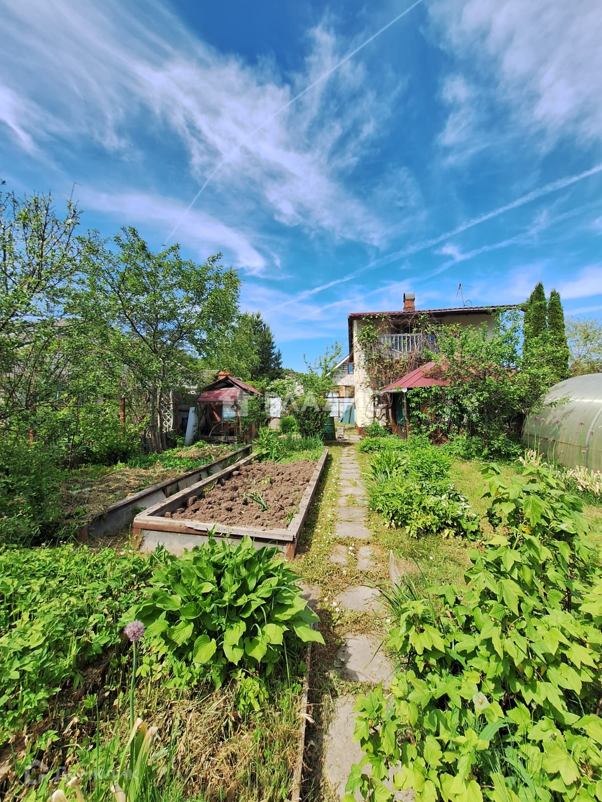 Участок разработан: высажены плодовые деревья и туи, грядки с плодородной землей, есть теплица. Дорожки выложены плиткой.
