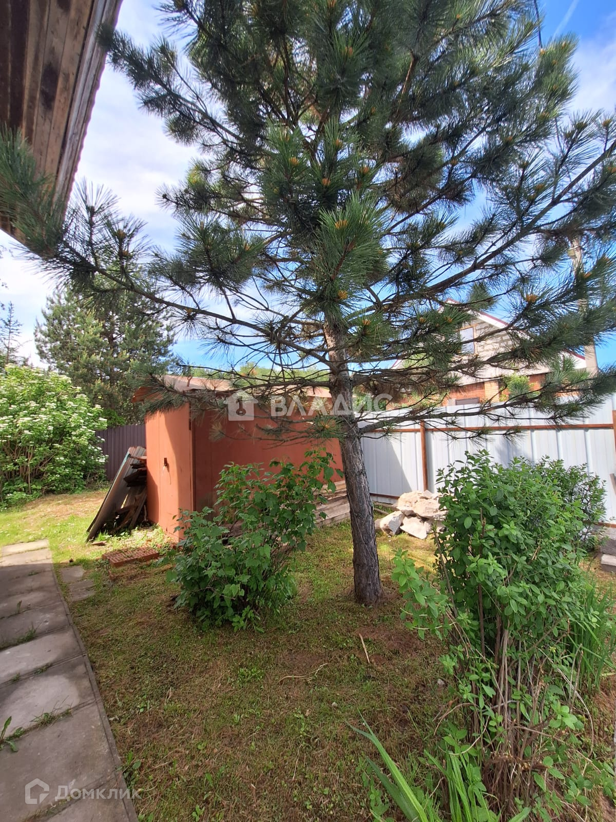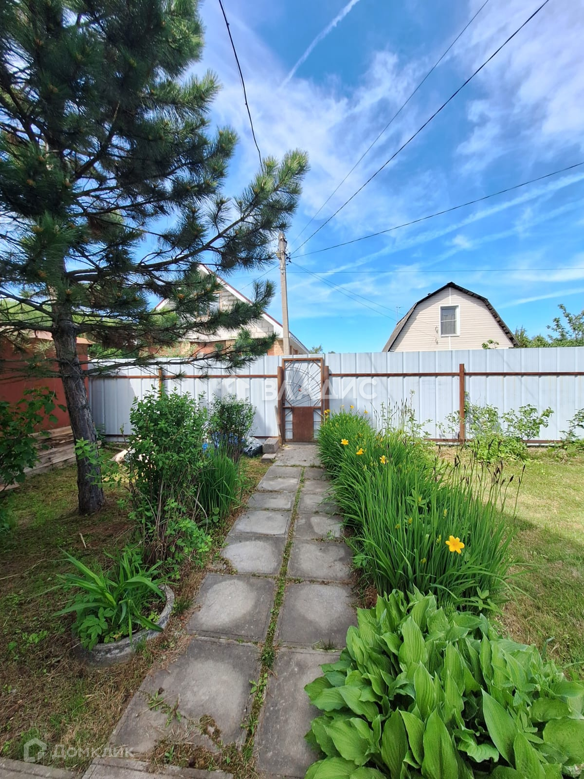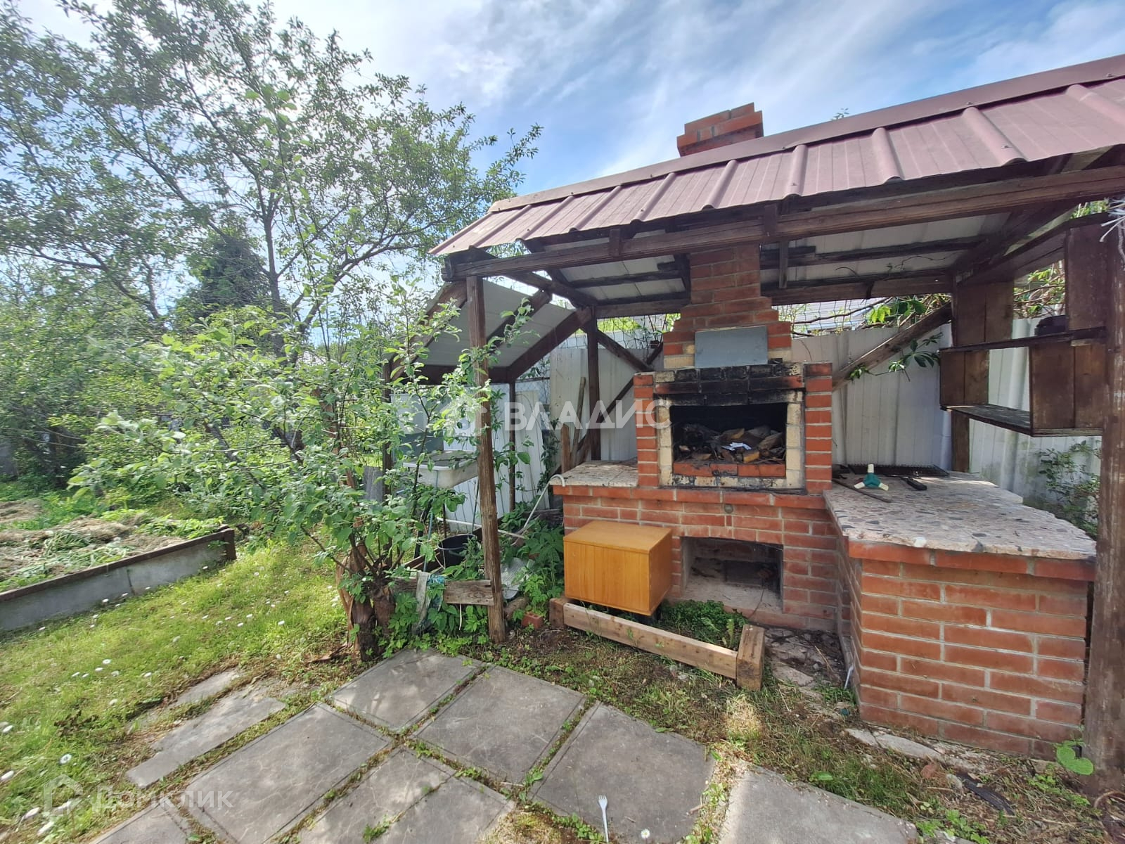 Участок разработан: высажены плодовые деревья и туи, грядки с плодородной землей, есть теплица. Дорожки выложены плиткой.