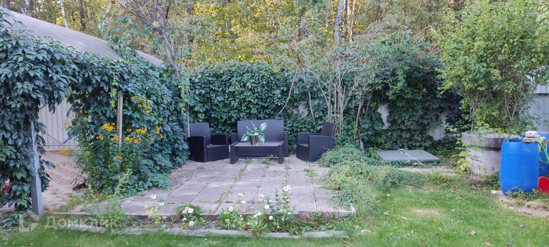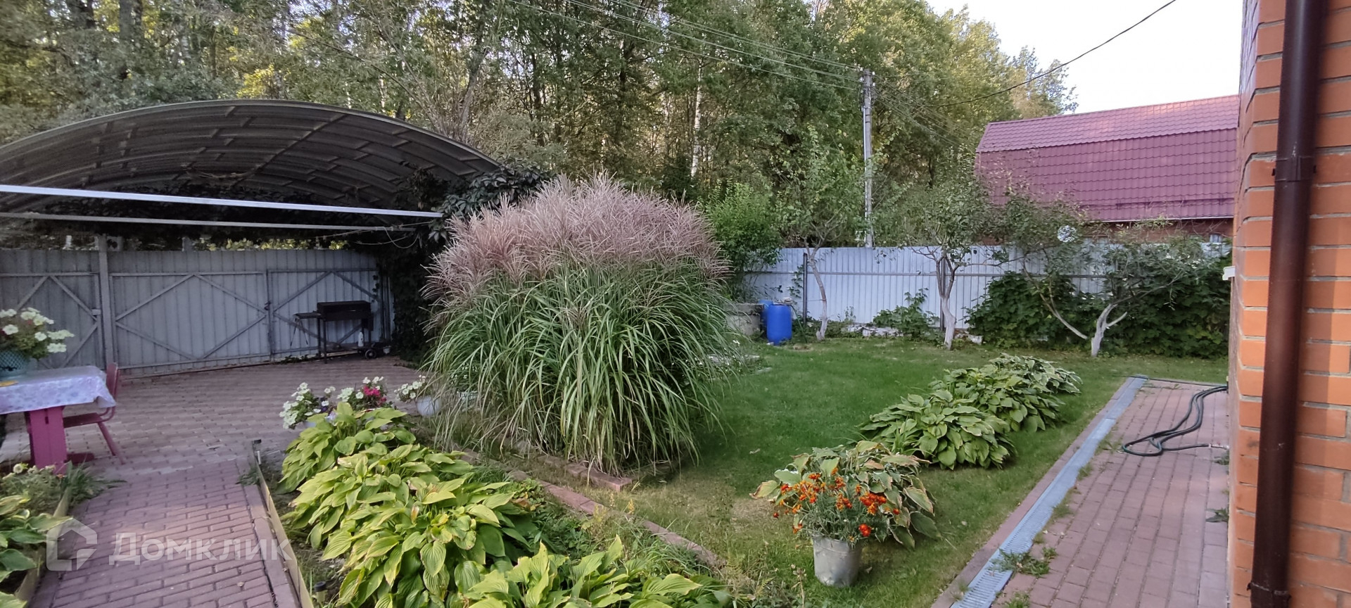 Также на участке: зона барбекю с садовой мебелью.