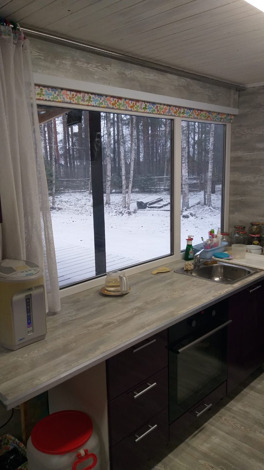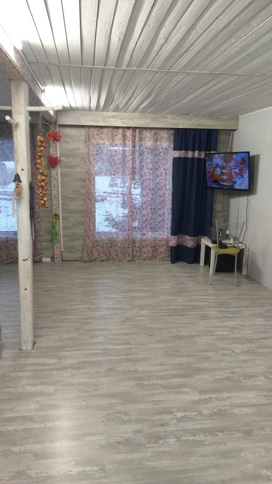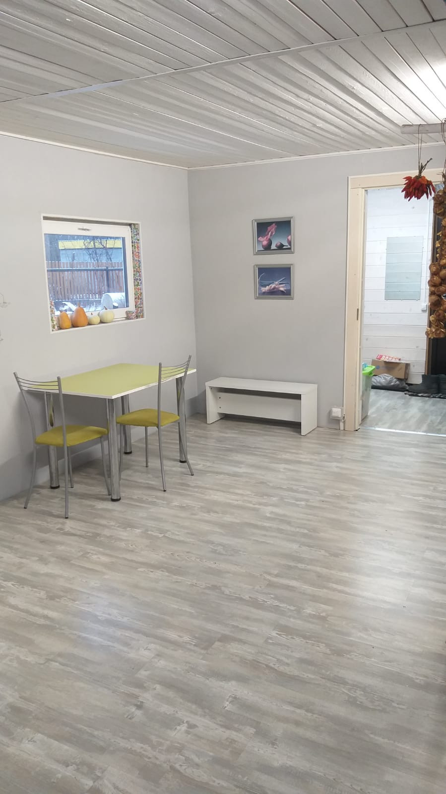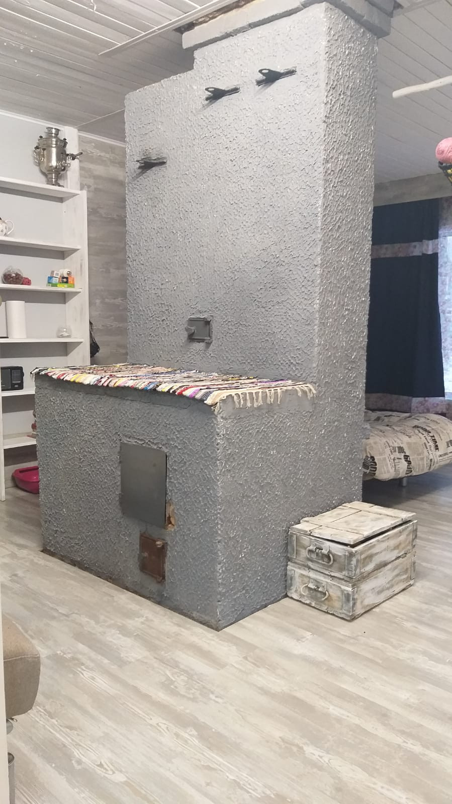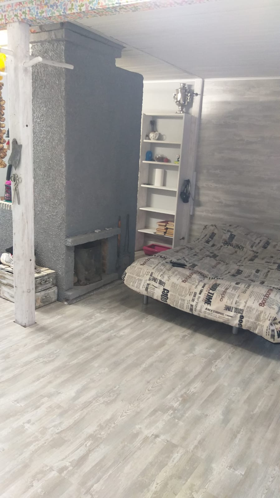 В доме оборудованная кухня, просторная комната гостиная с большими панорамными окнами и дровяной печью, небольшая спальня с гардеробной.