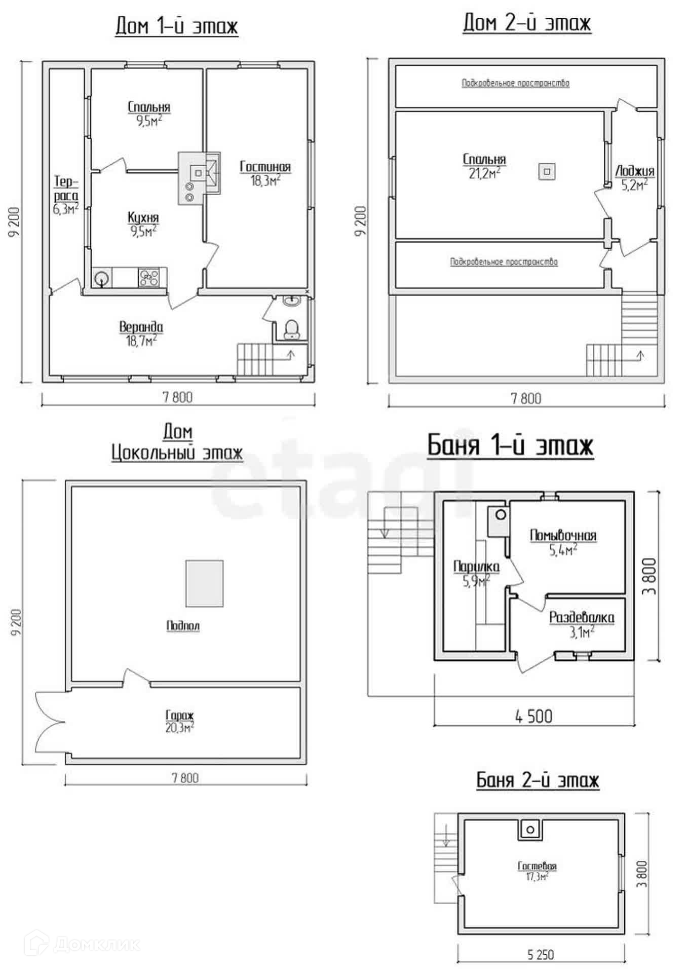 Баня - 1й этаж 14,4м2, 2й этаж 17,3м2